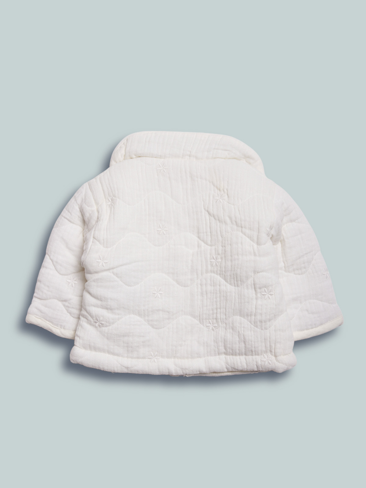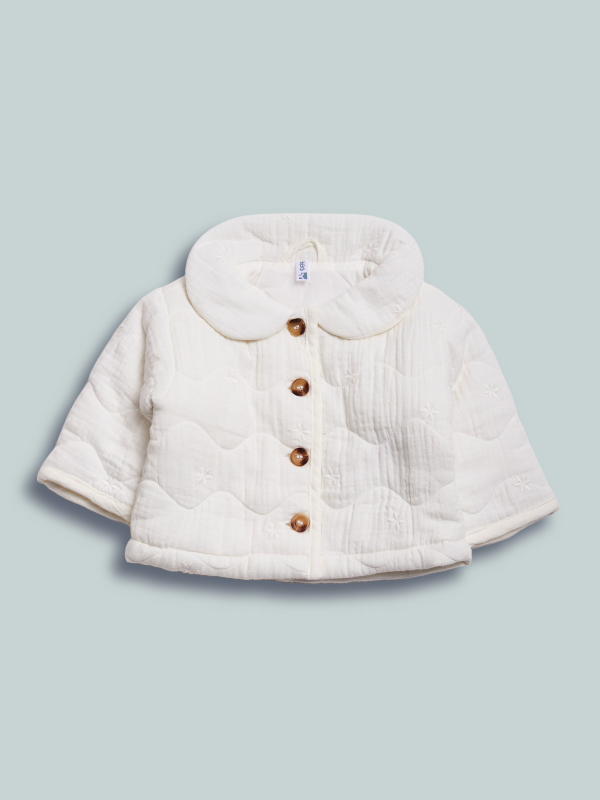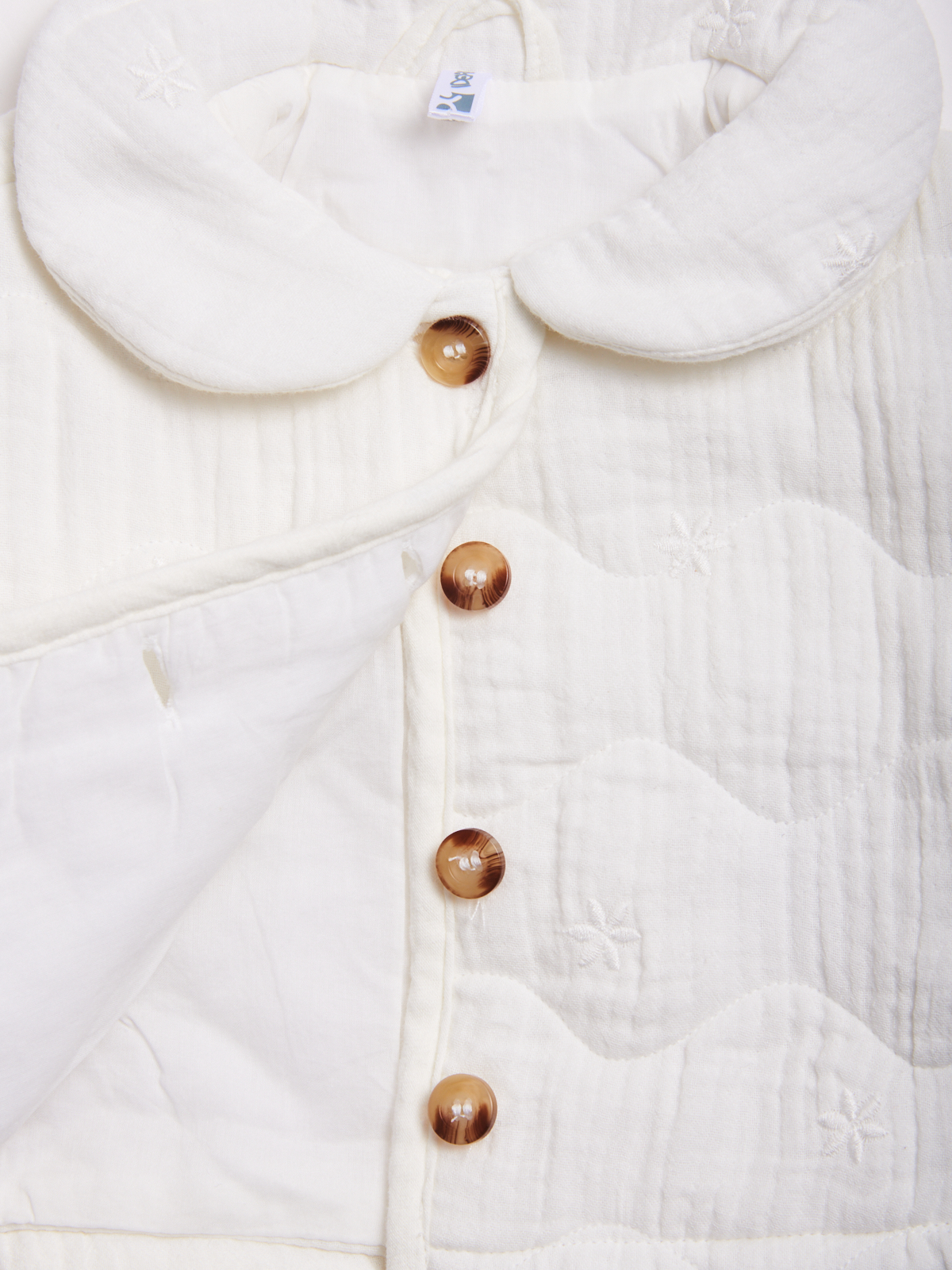Giubbotto in morbido tessuto cotoniero trapuntato e ricamato fiori. Il capo è imbottito con ovatta e foderato internamente in mussola di cotone. Pratico da indossare grazie all’apertura frontale con bottoni. Colletto tondo per maggiore femminilità. Un capo fashion ed estremamente pratico.