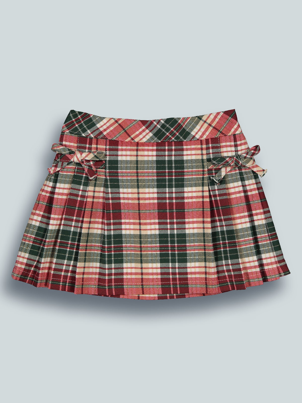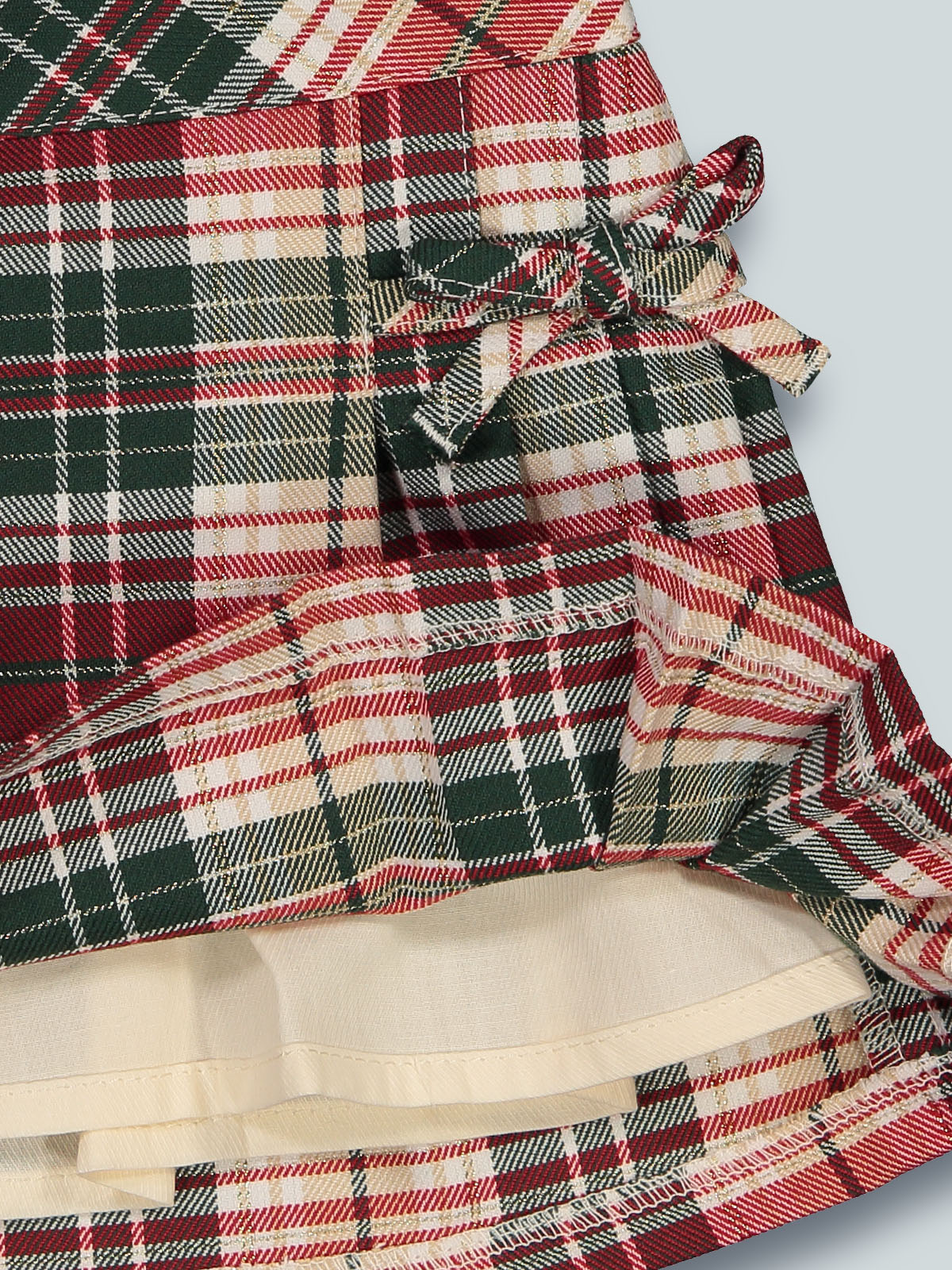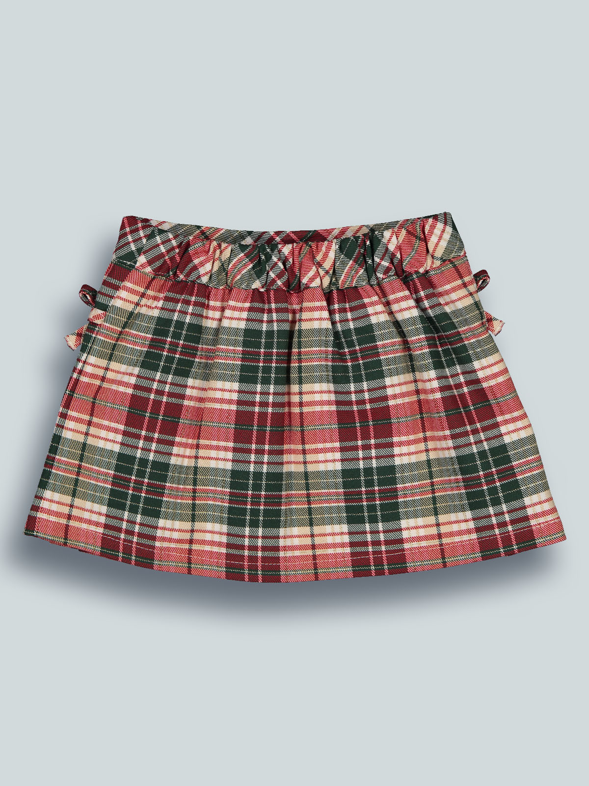 Gonna con pieghe in morbida flanella scozzese con vita elasticata per maggiore comodità. Foderata internamente in tessuto di cotone. Fiocchetti davanti per ancora più femminilità. Un capo estremamente femminile ideale per le feste e non solo.