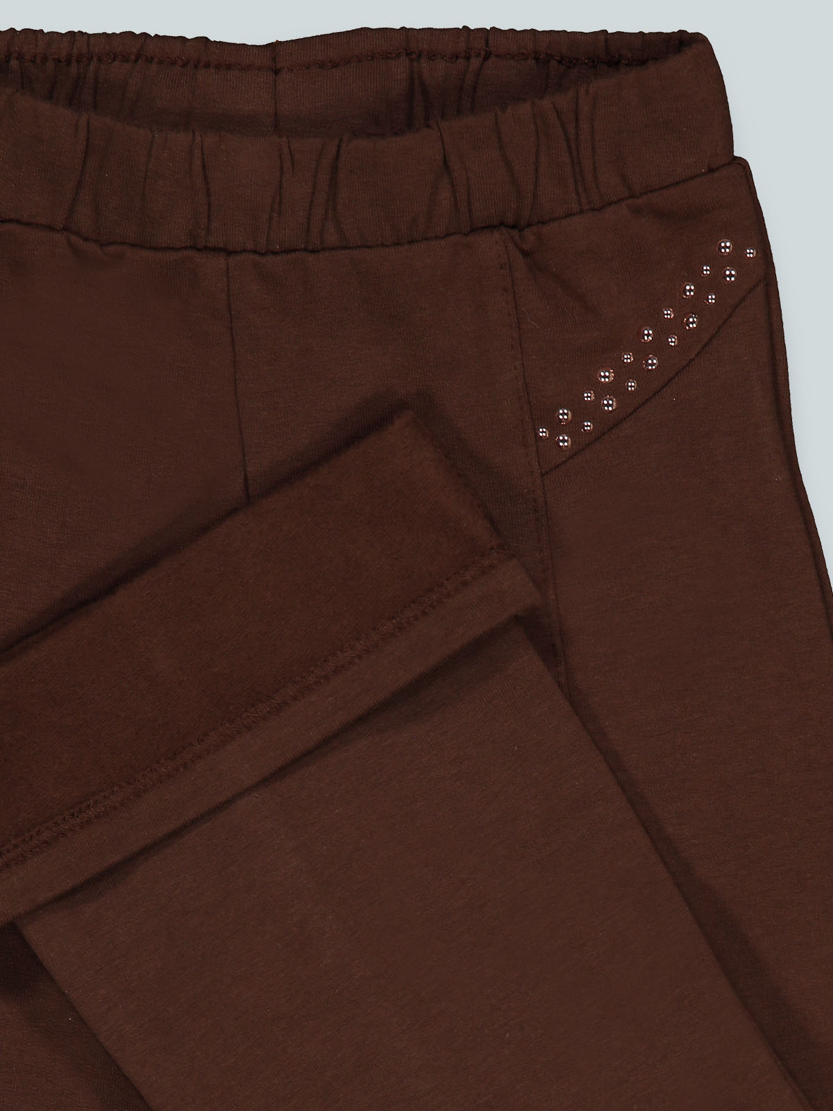 Jeggings in morbida e calda felpa elasticizzata. L’interno della felpa di questo capo è lavorato in maniera tale che le fibre del tessuto si sollevino, rendendolo più morbido, soffice e caldo sulla pelle. Vita elasticata per maggiore comodità. Borchiette lucide sul taglio davanti. Ideali da indossare a scuola per un look sempre alla moda senza rinunciare alla comodità.