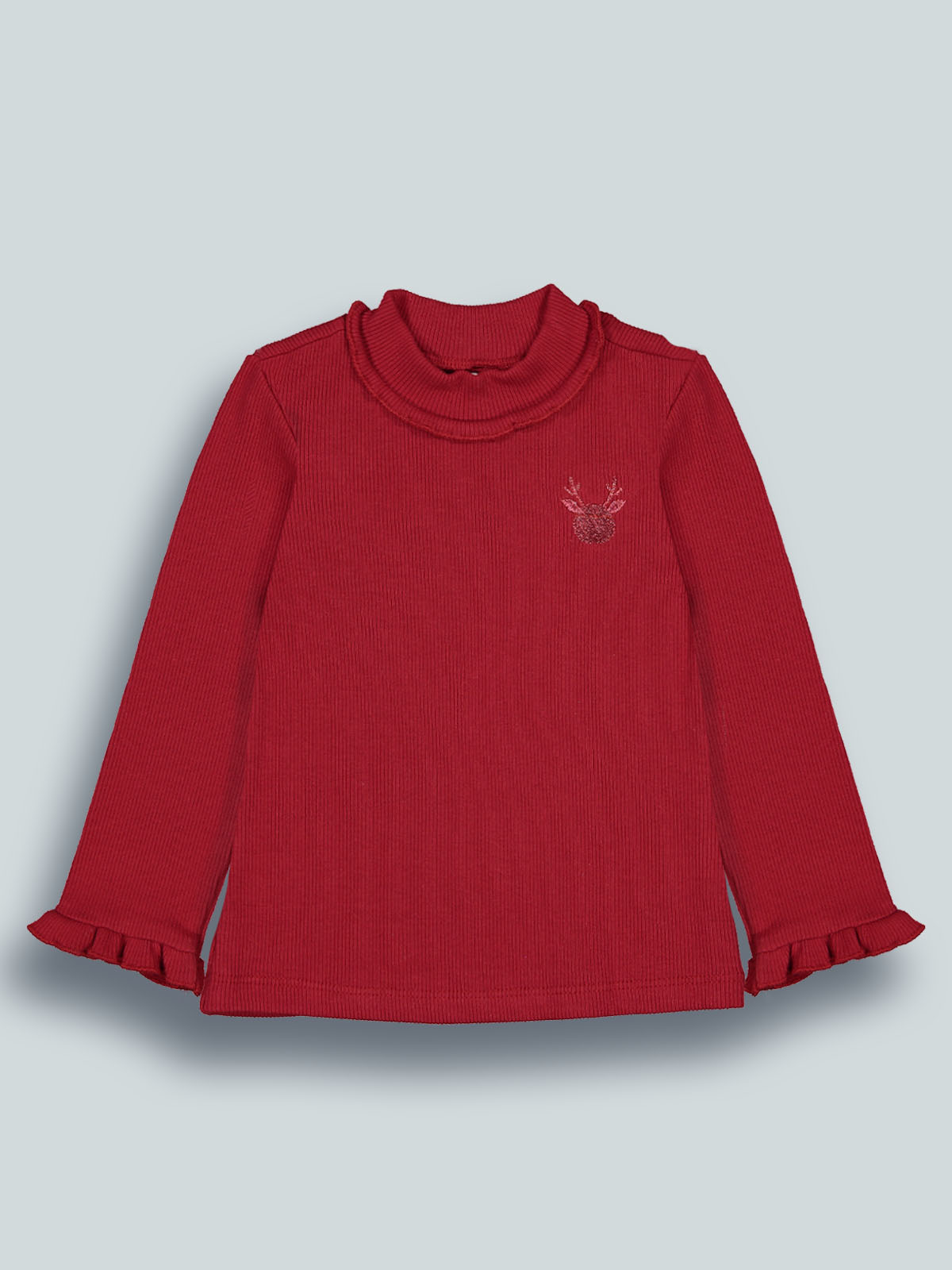 Lupetto in calda costina manica lunga. Simpatica renna a ricamo lurex sul davanti. Il modello del collo alto proteggerà la vostra bambina dal freddo. Rouches al fondo manica e al girocollo per ancora più femminilità. Un capo con dettagli chic ideale da indossare nel periodo nelle feste.