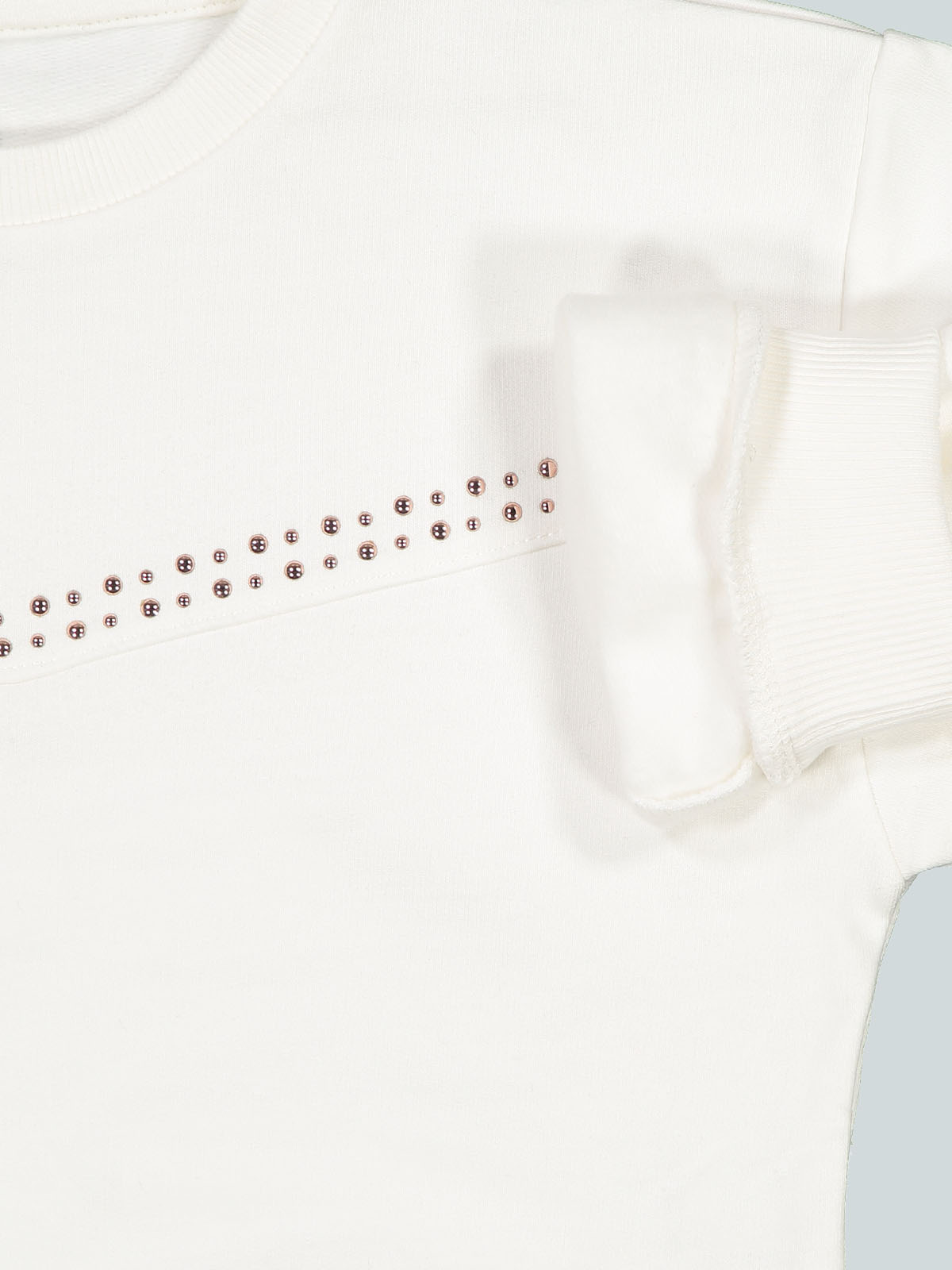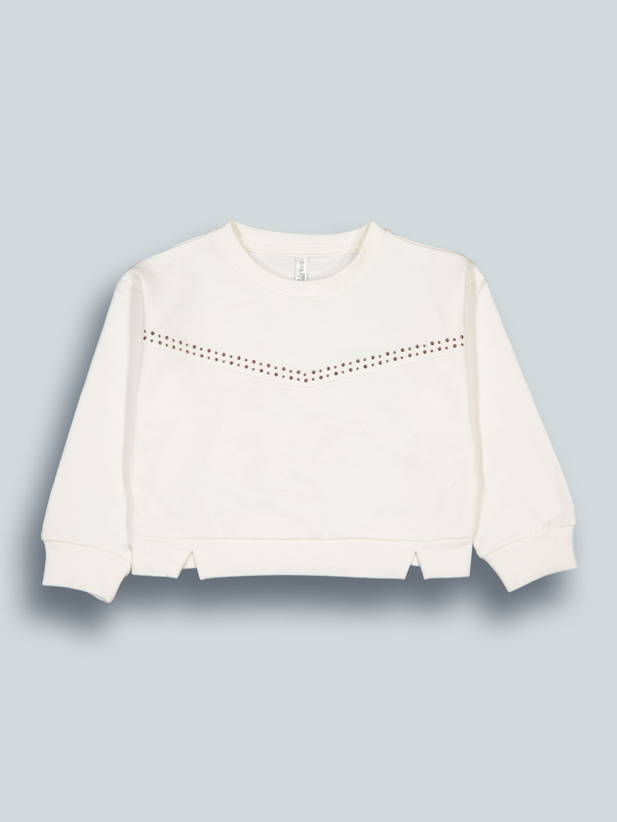 Maglia girocollo manica lunga in morbida e calda felpa. L’interno della felpa di questo capo è lavorato in maniera tale che le fibre del tessuto si sollevino, rendendolo più morbido, soffice e caldo sulla pelle. Borchiette lucide sul taglio davanti. Un capo super trendy.