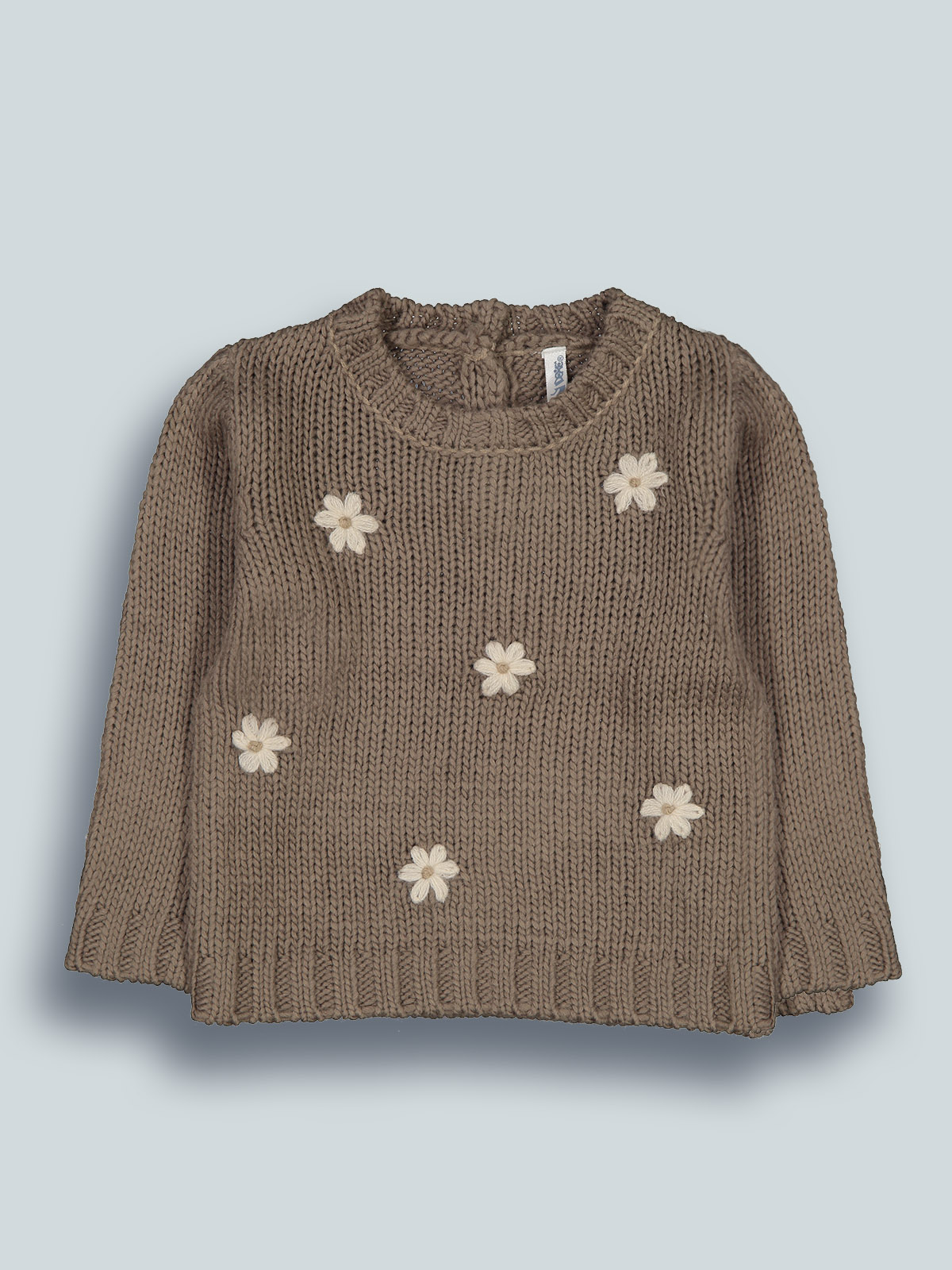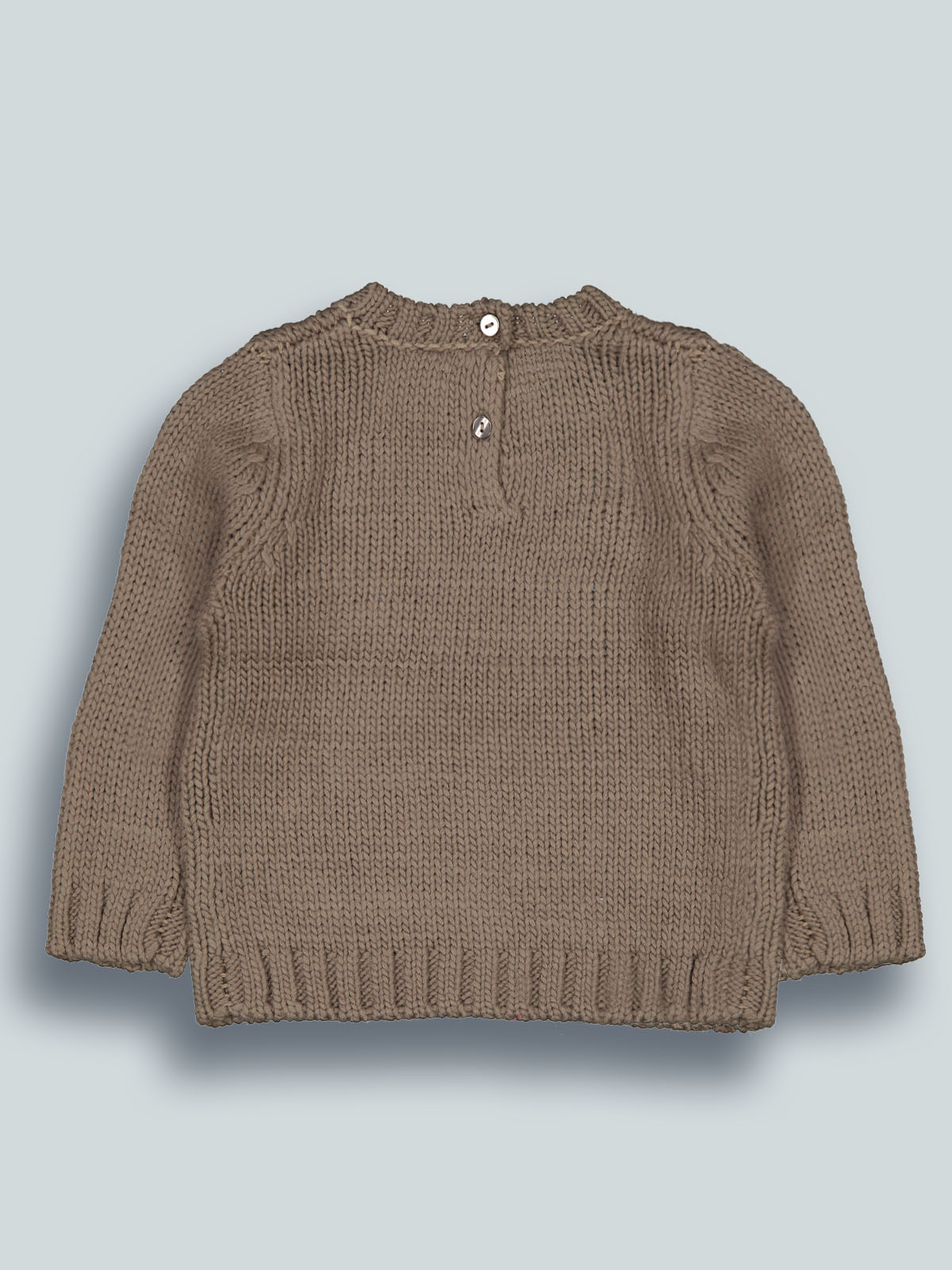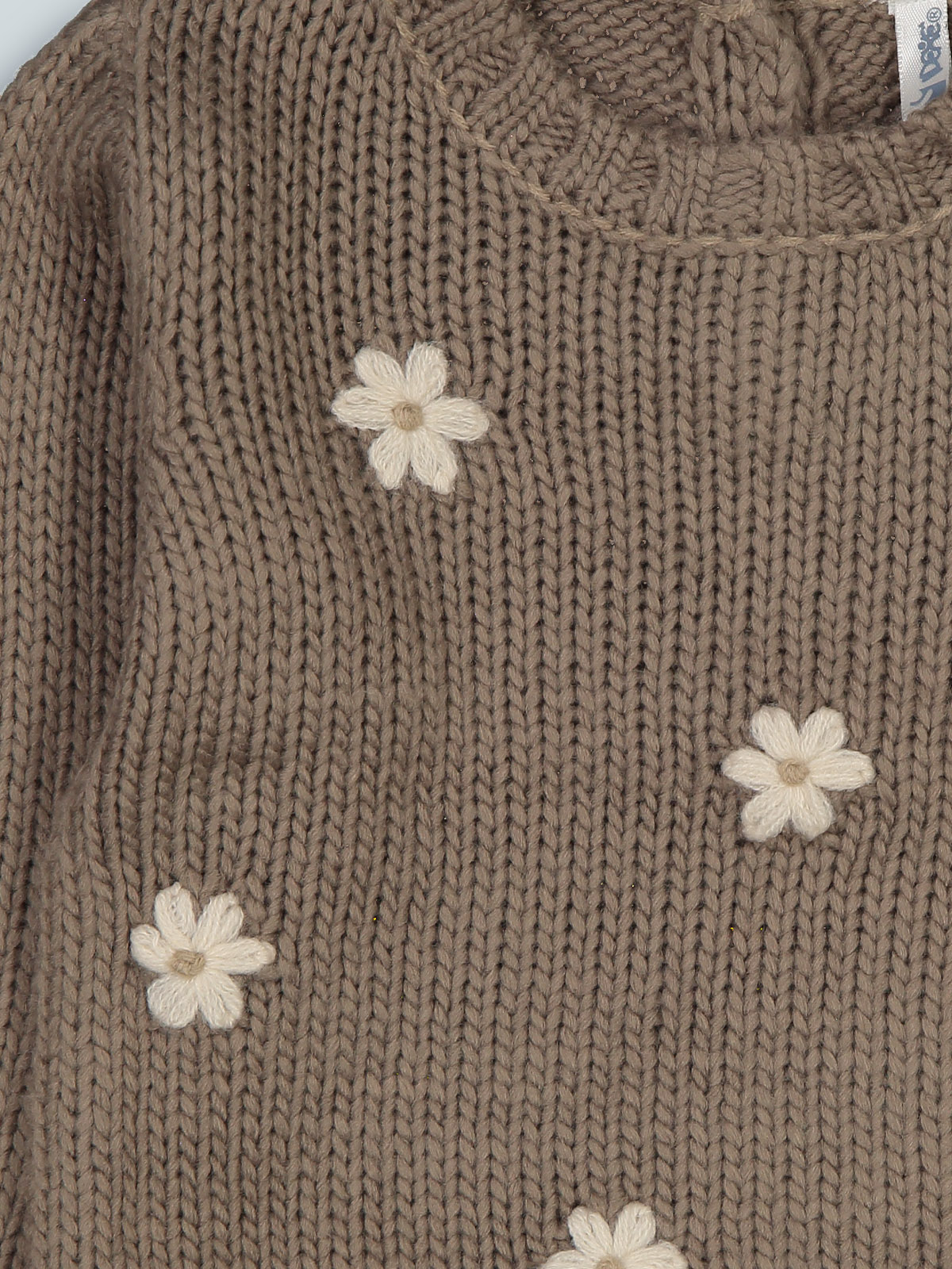 Maglia girocollo manica lunga in maglia di morbido cotone con fiori tridimensionali. Pratica apertura sul dietro grazie ai bottoncini. Un capo con dettagli sfiziosi e ideale per i primi freddi.