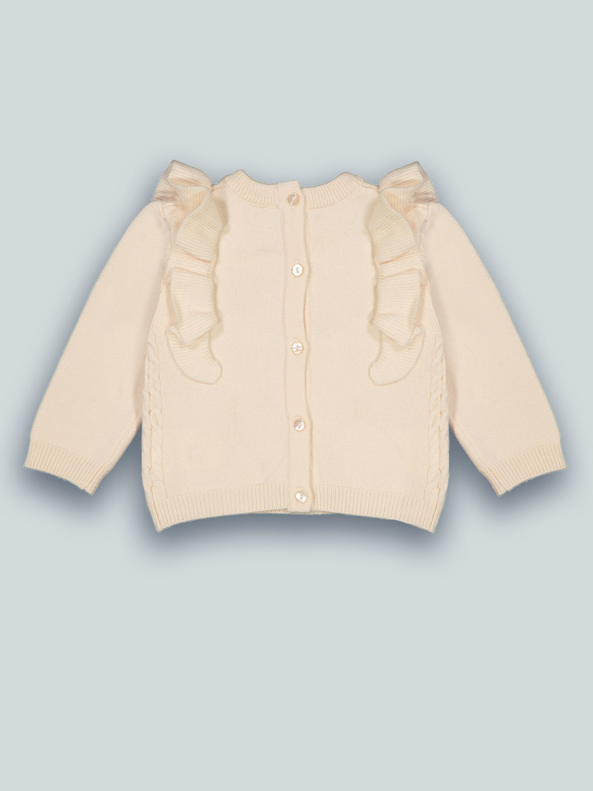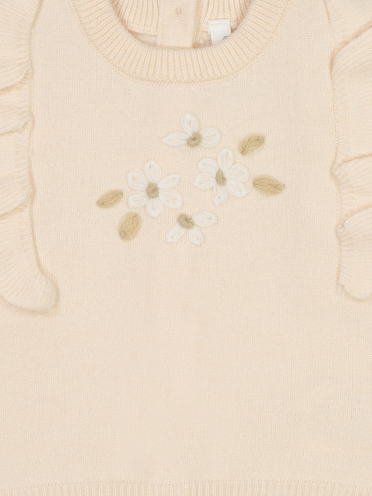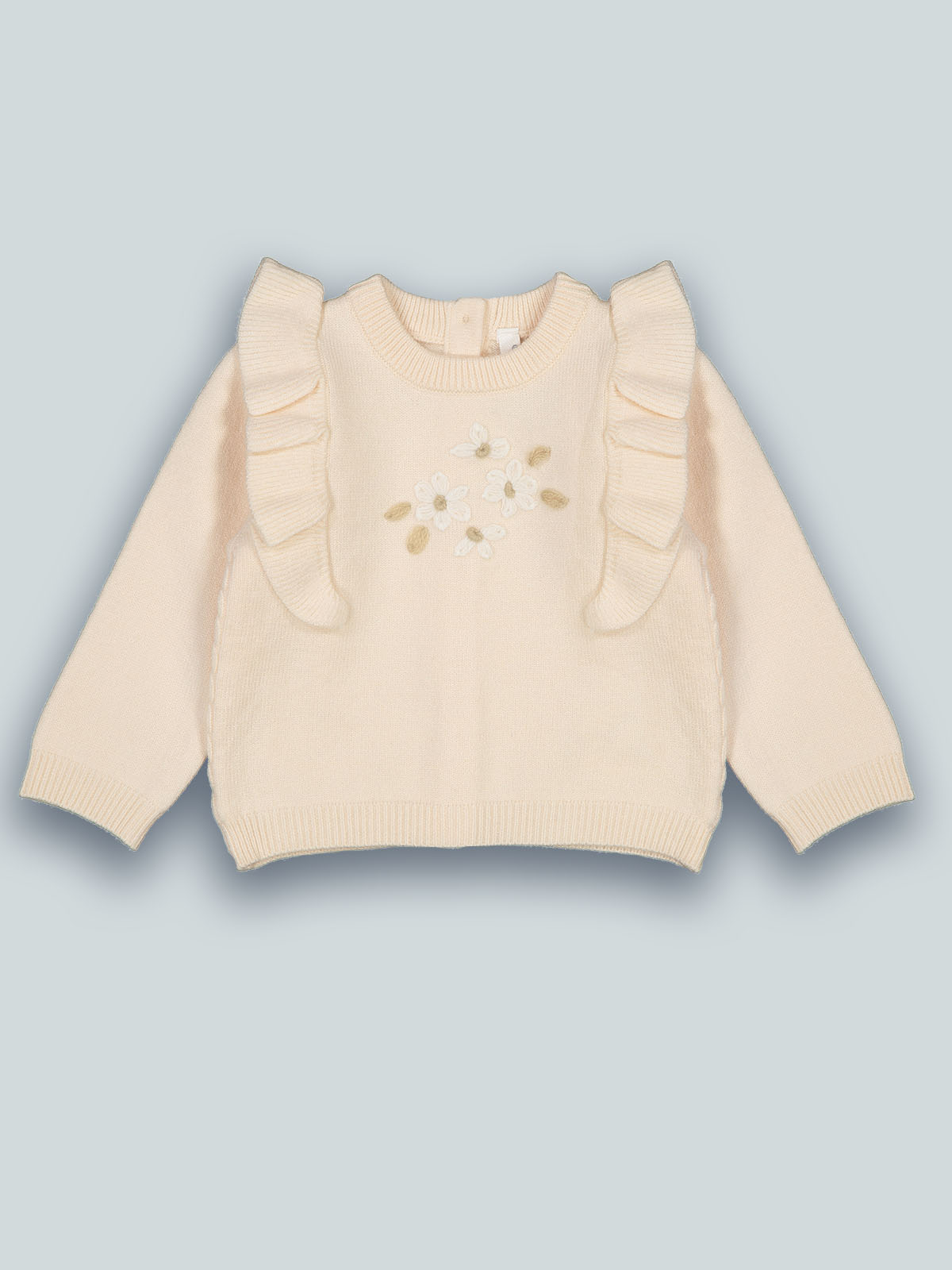 Maglia girocollo in morbido misto cotone, il davanti è impreziosito da rouches e fiori. Pratico da indossare grazie all’apertura totale sul dietro con bottoncini. Un capo caldo e ideale per affrontale l’inverno con stile.