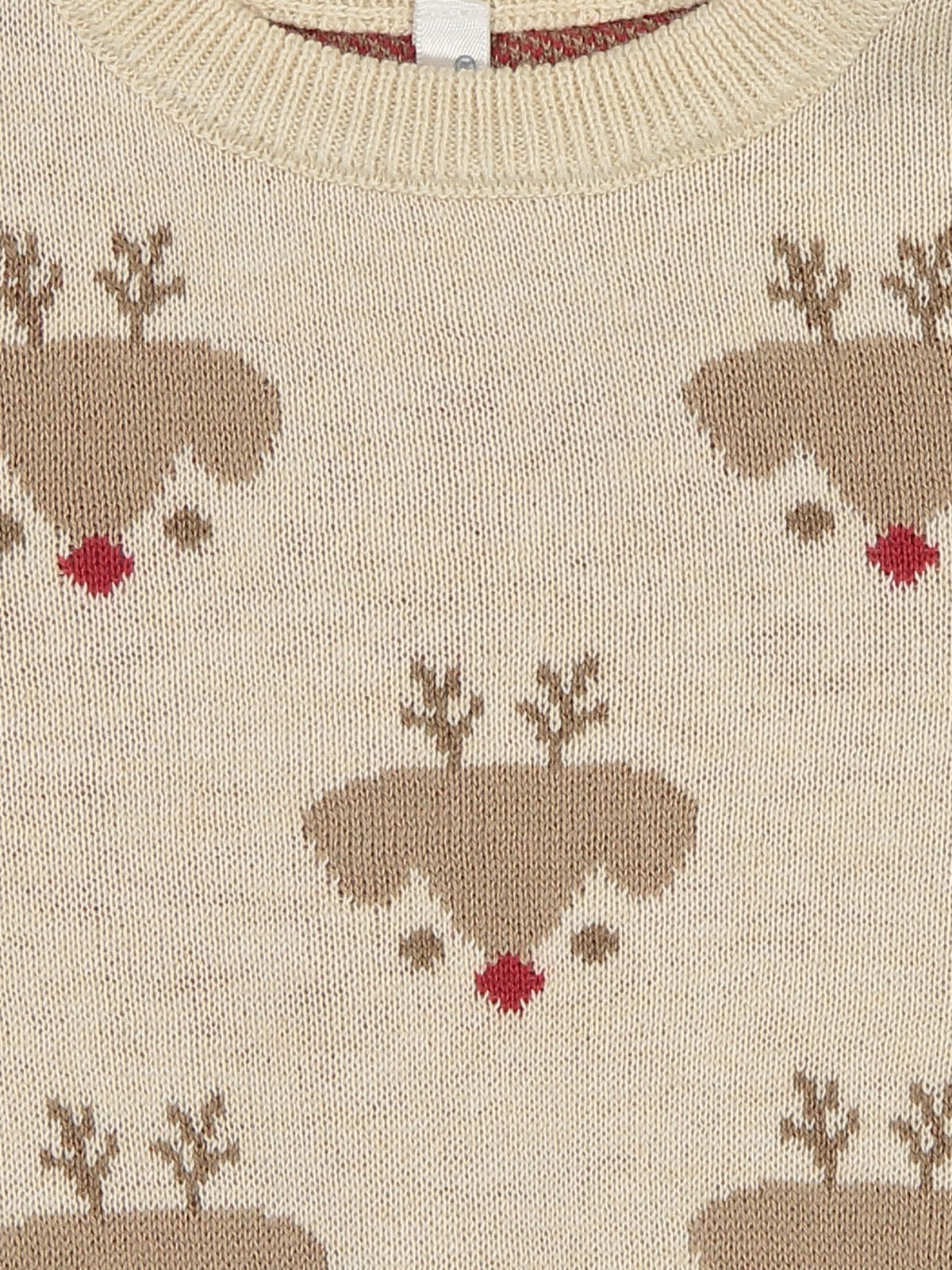 Maglioncino girocollo in morbido e caldo tricot aperto su spalla con bottoncini. Simpatica lavorazione jacquard Renne. Un capo “must have” per le feste natalizie.