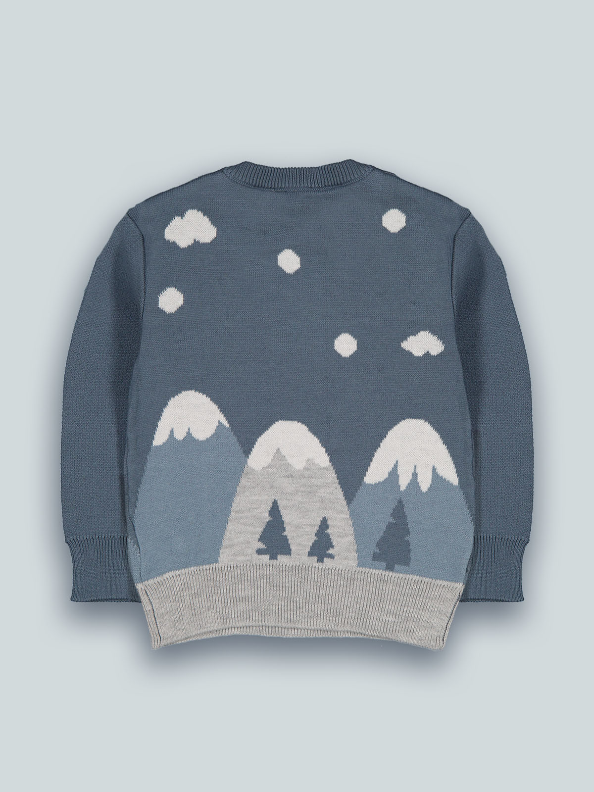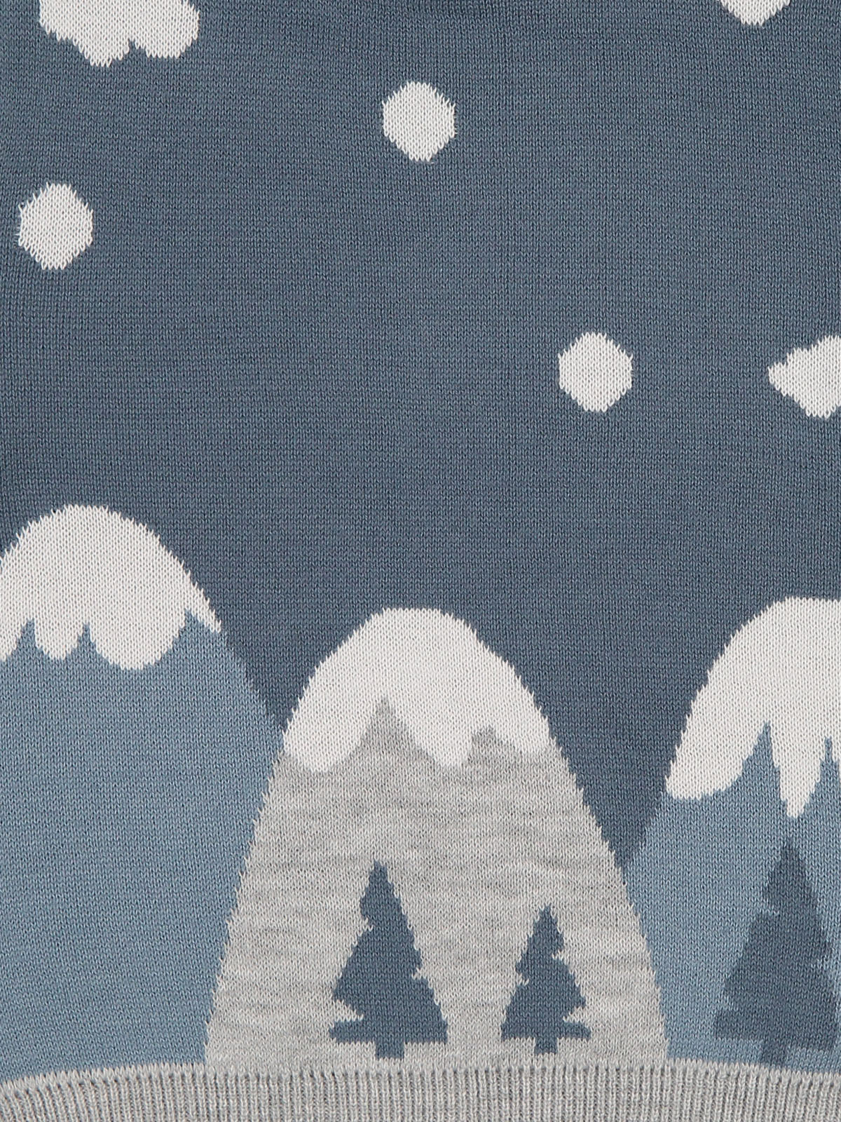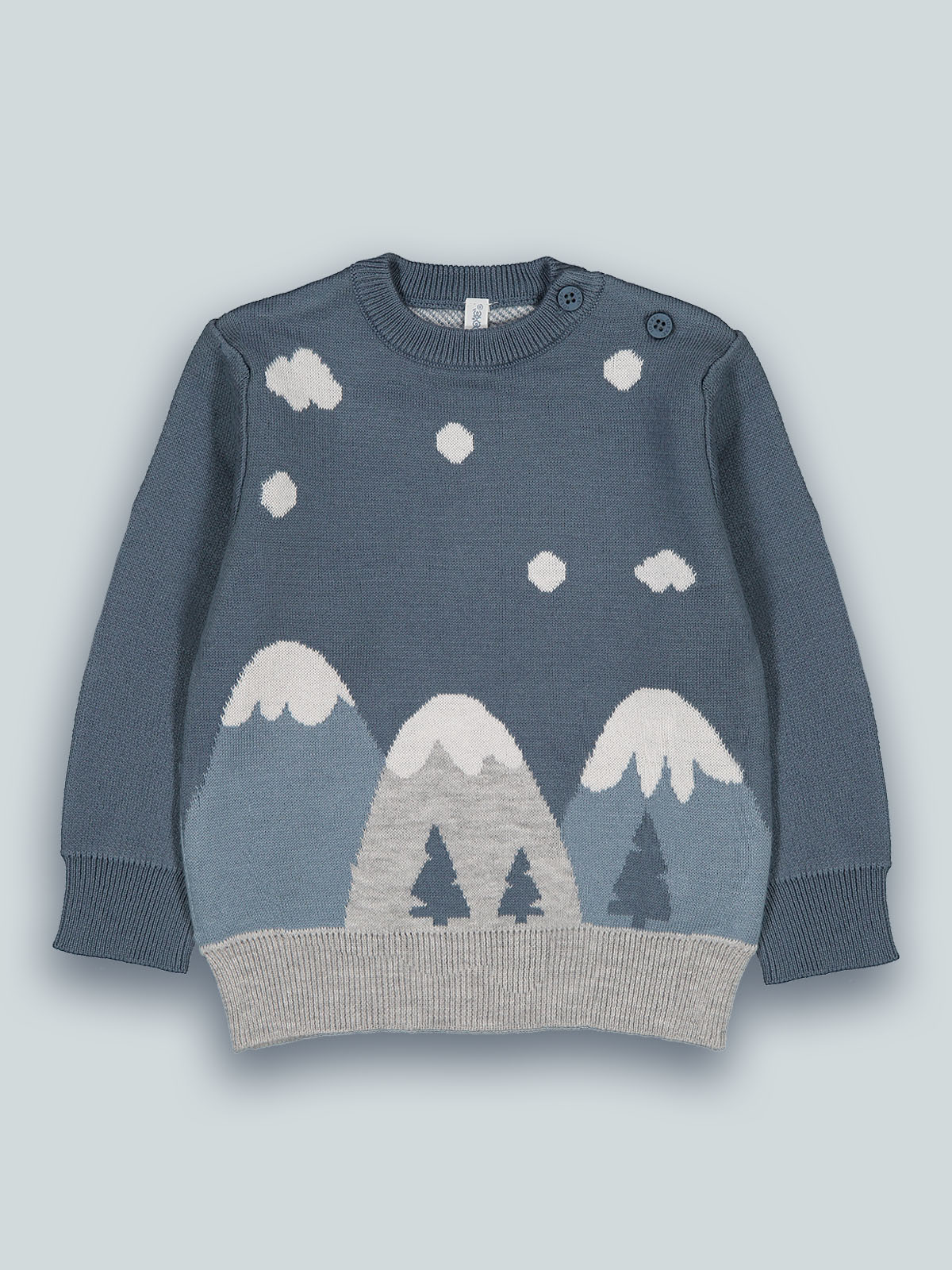 Maglioncino girocollo in morbido e caldo tricot, pratica apertura con bottoncini su spalla. Paesaggio innevato jaquard sul davanti. Un capo facile da abbinare e che non può mancare nell’armadio del vostro bambino.
