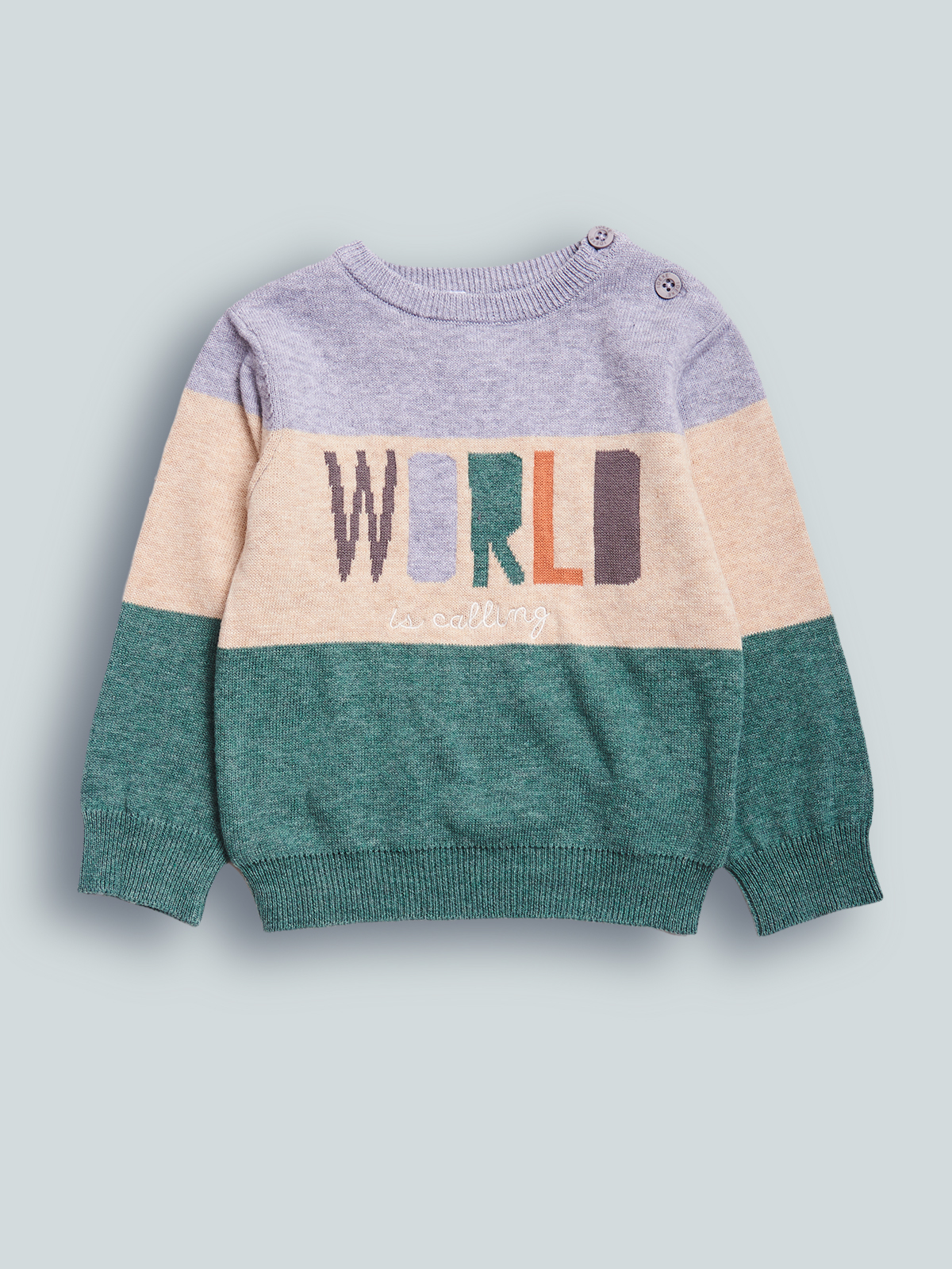 Maglioncino girocollo in morbido e caldo tricot rigato melange, pratica apertura con bottoncini su spalla. Scritta jacquard sul davanti. Un rigato nei colori di tendenza della stagione, facile da abbinare.