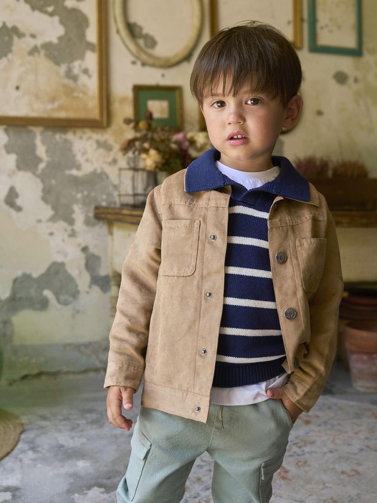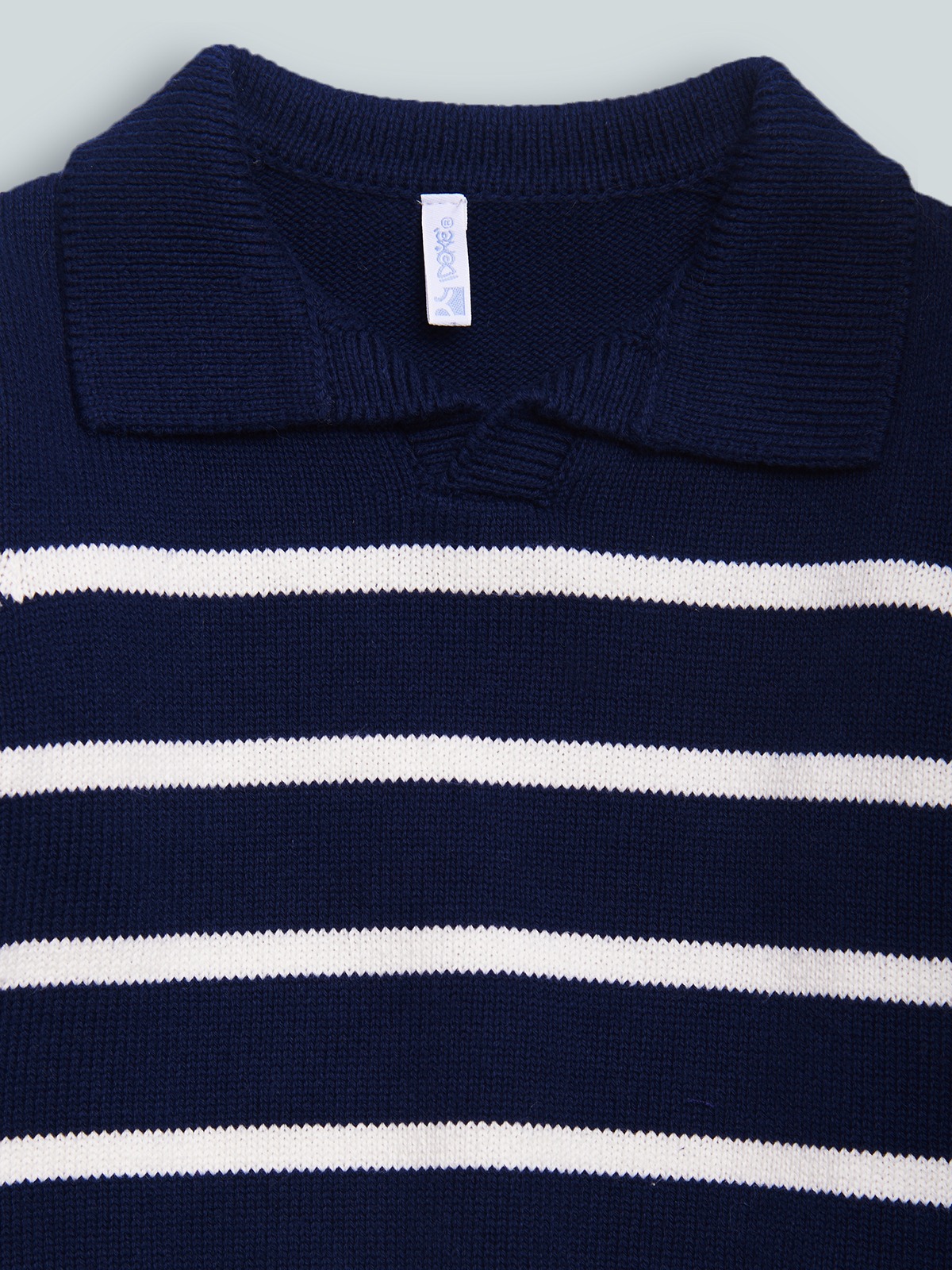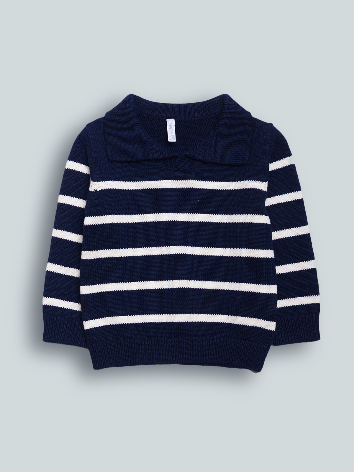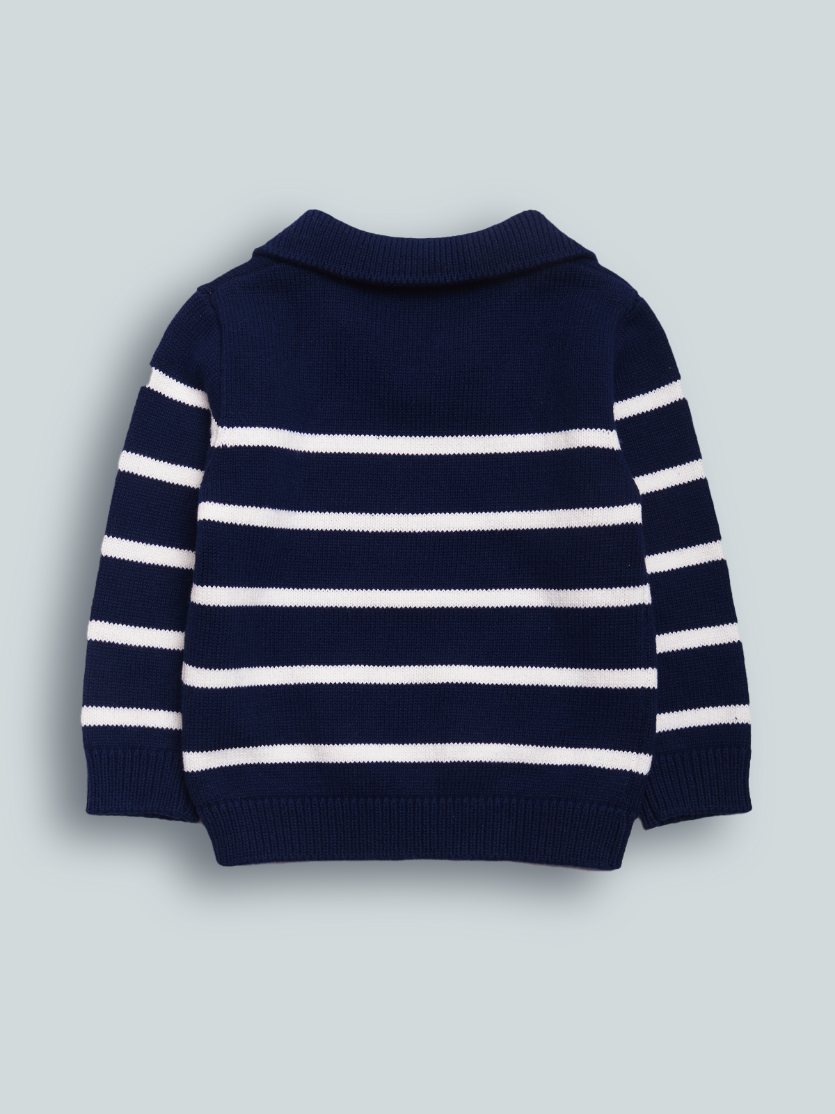 Maglioncino in Morbido tricot rigato, Modello con colletto. Un capo di tendenza facile da abbinare e che non puo’ Mancare nell’armadio del vostro bambino.