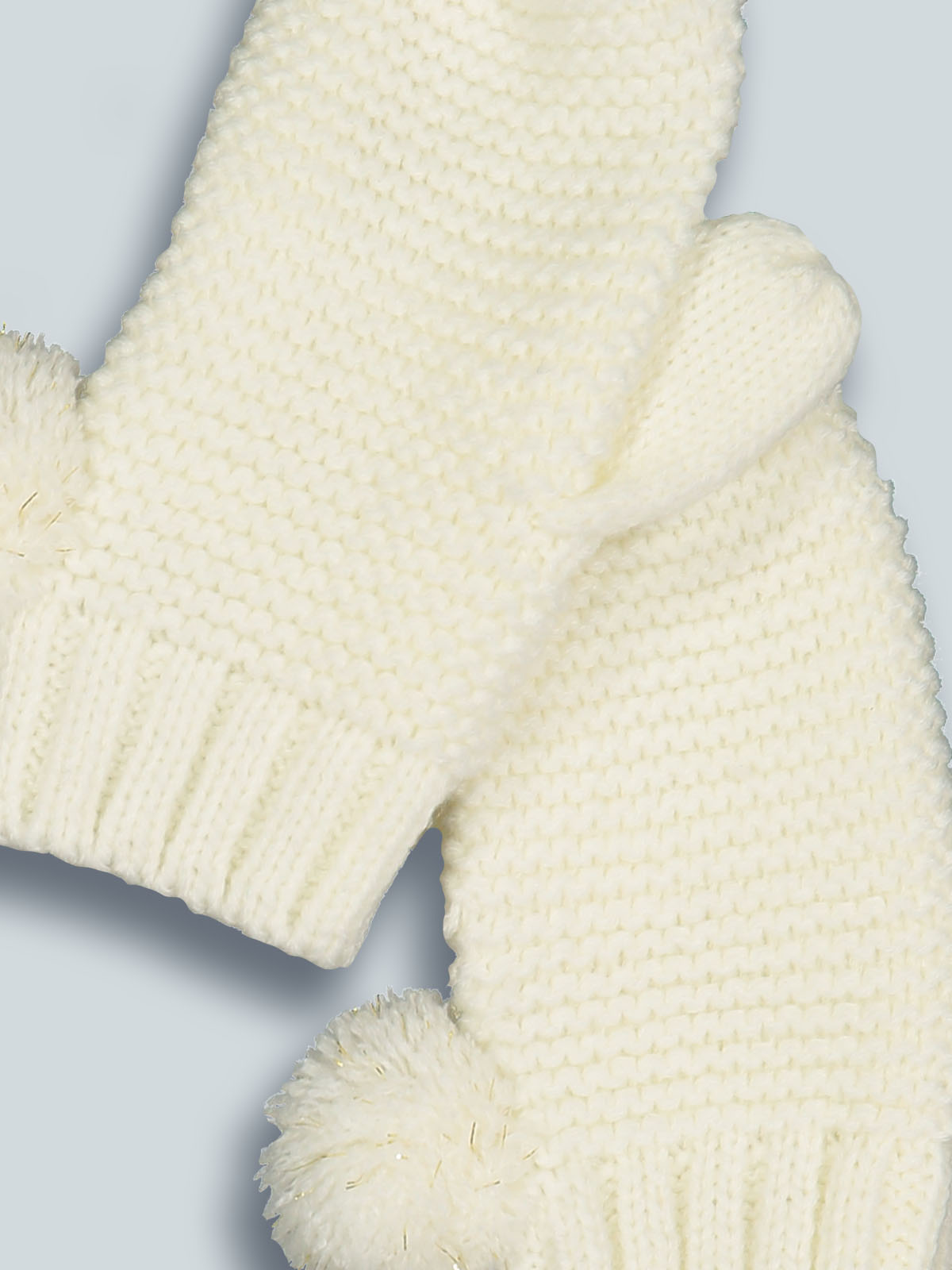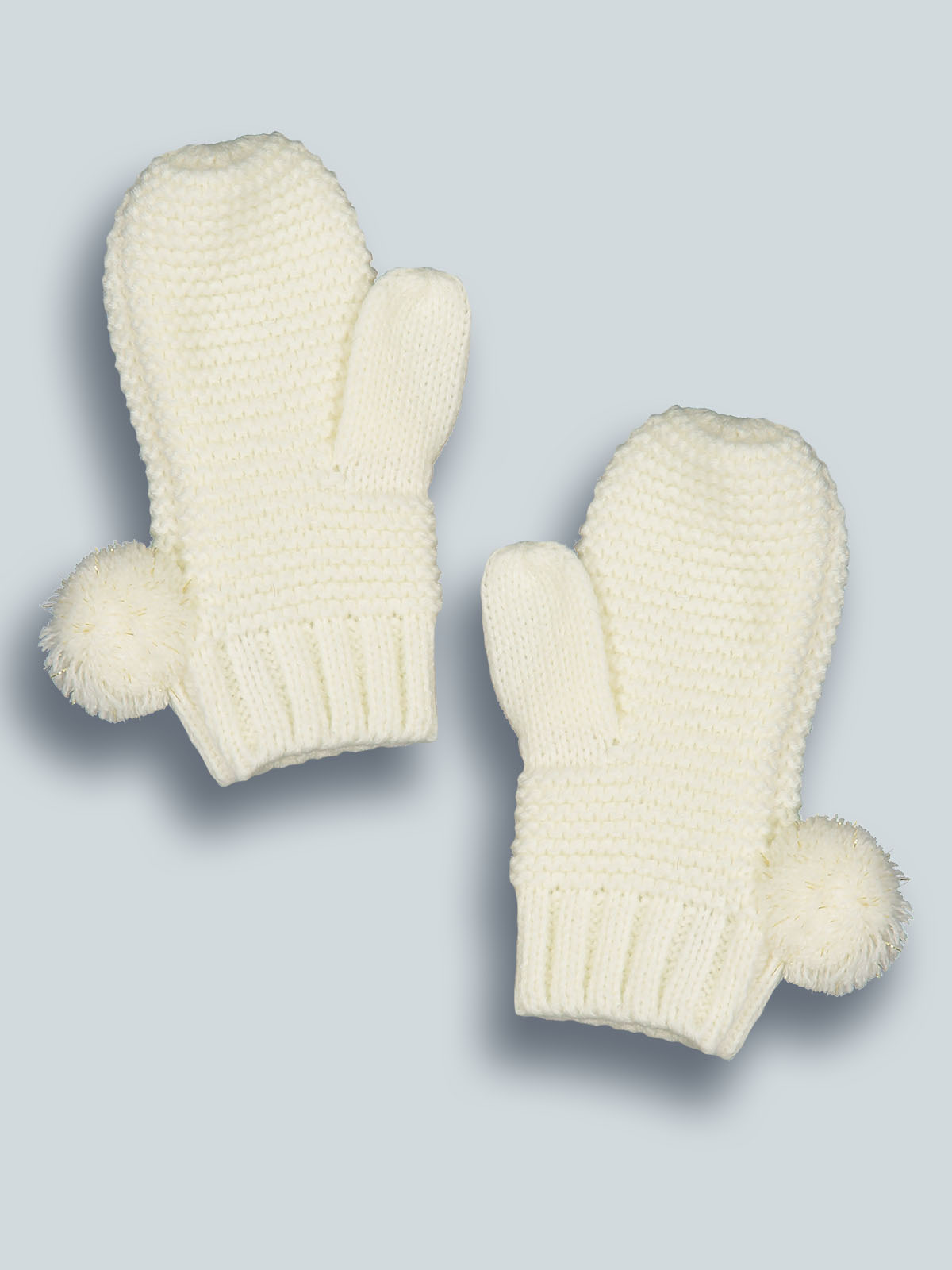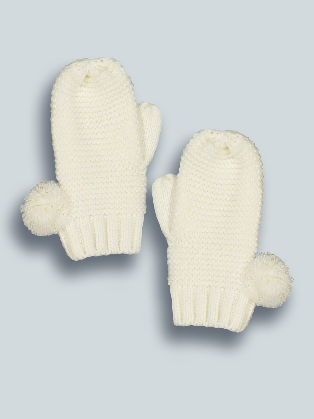 Moffole in maglia di morbido cotone con pompon. E’ perfettamente abbinabile alla sua cuffia e alla sua sciarpa, realizzati con lo stesso filato. Un capo immancabile nelle fredde giornate d’inverno.