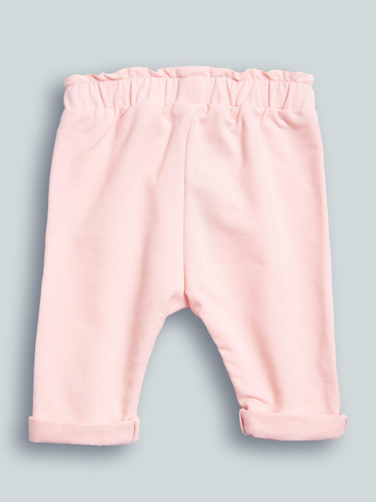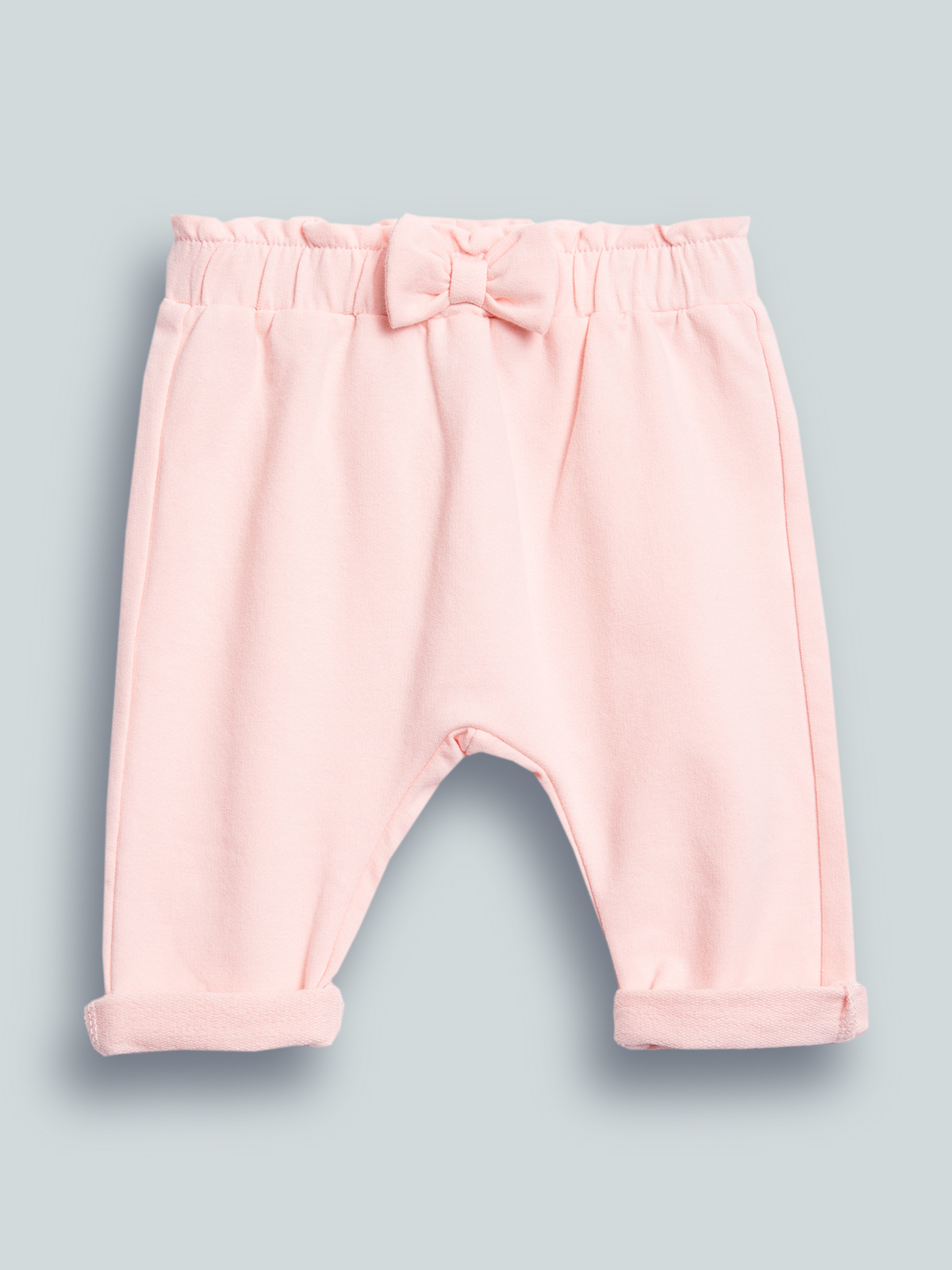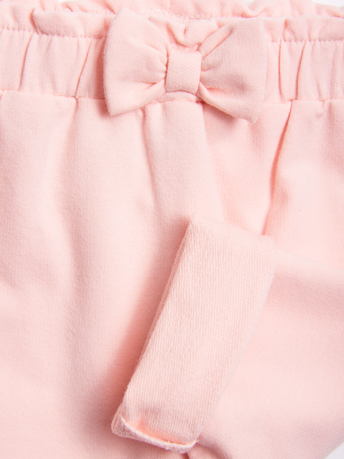 Pantaloni in felpa leggera elasticizzata. Vita arricciata con elastico interno e fiocco decorativo sul davanti. Trendy e confortevoli da usare in ogni occasione!