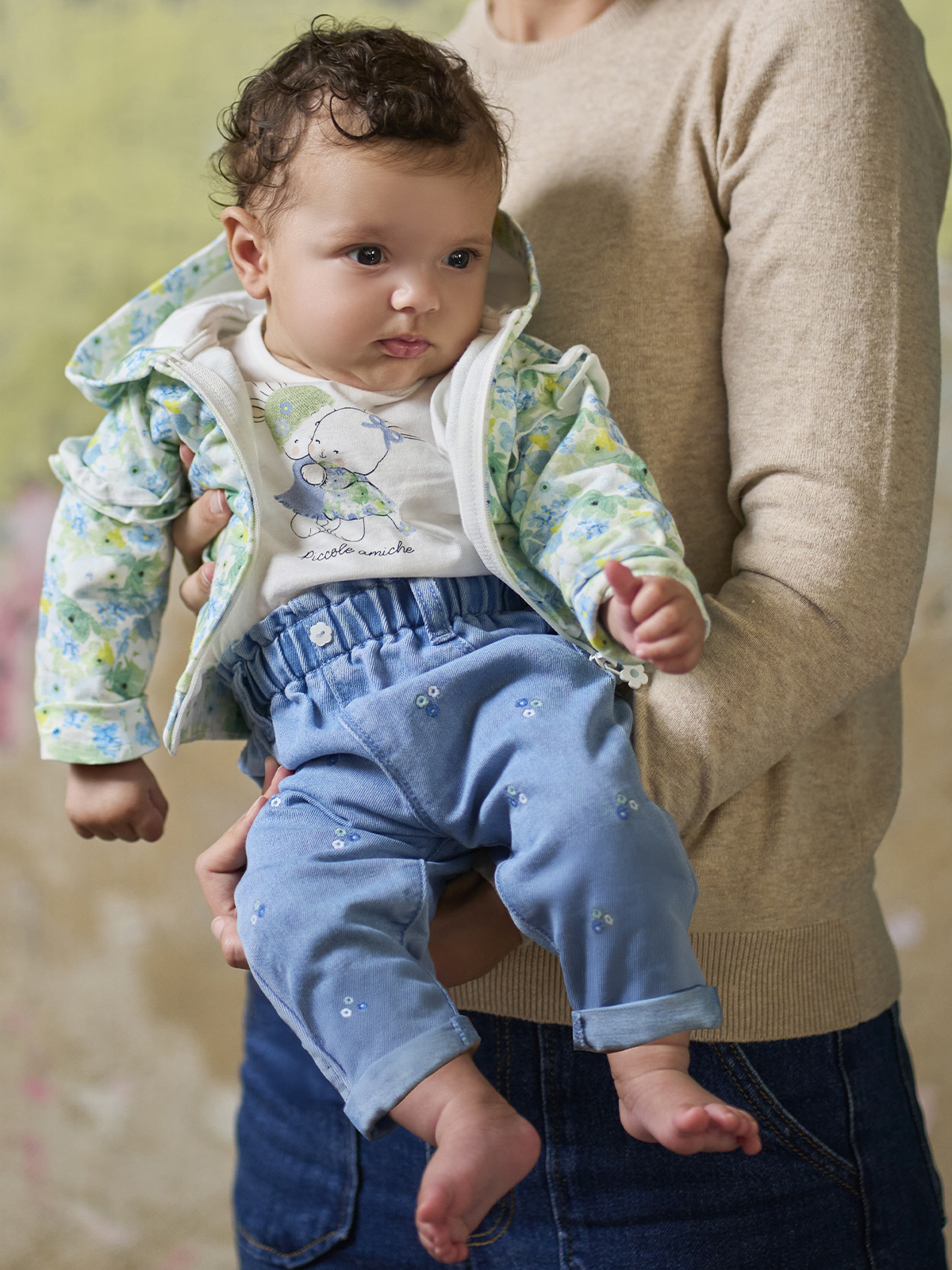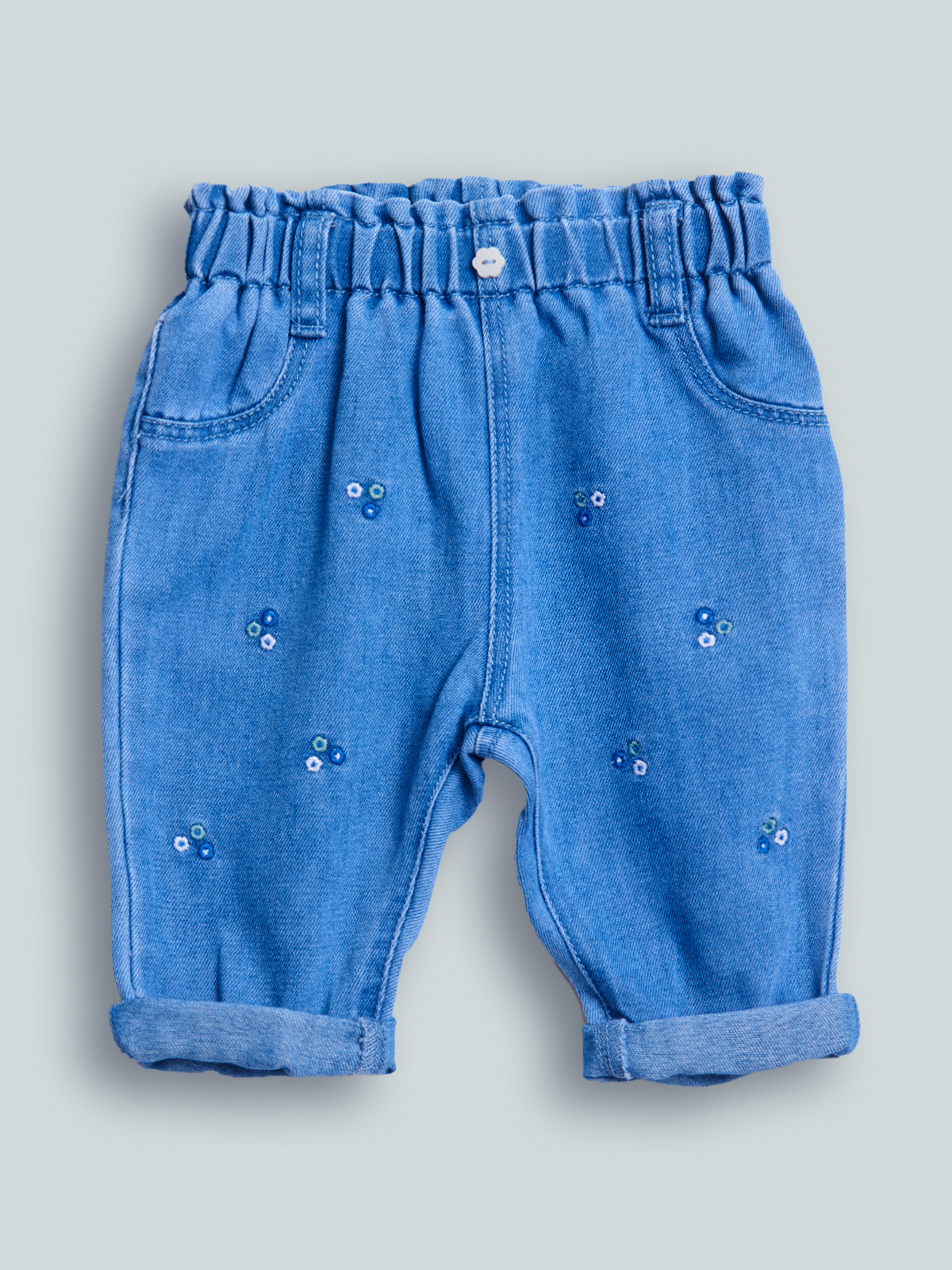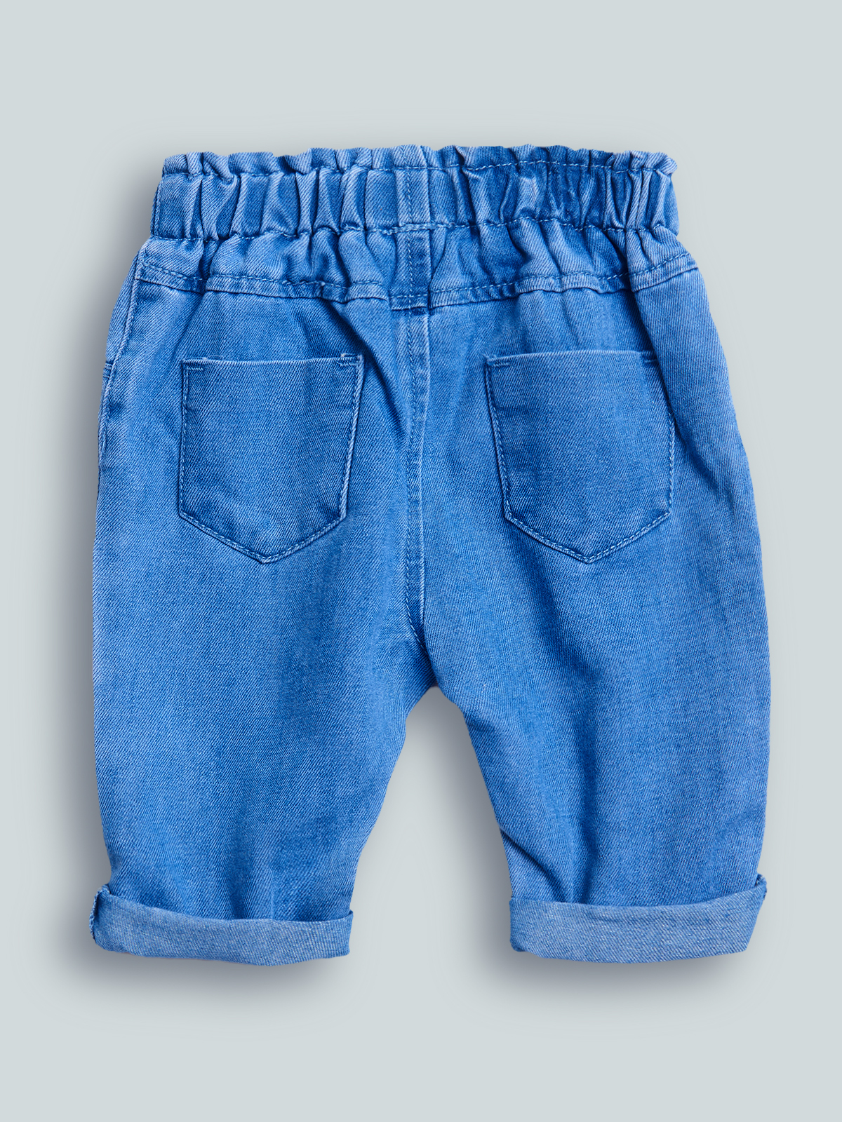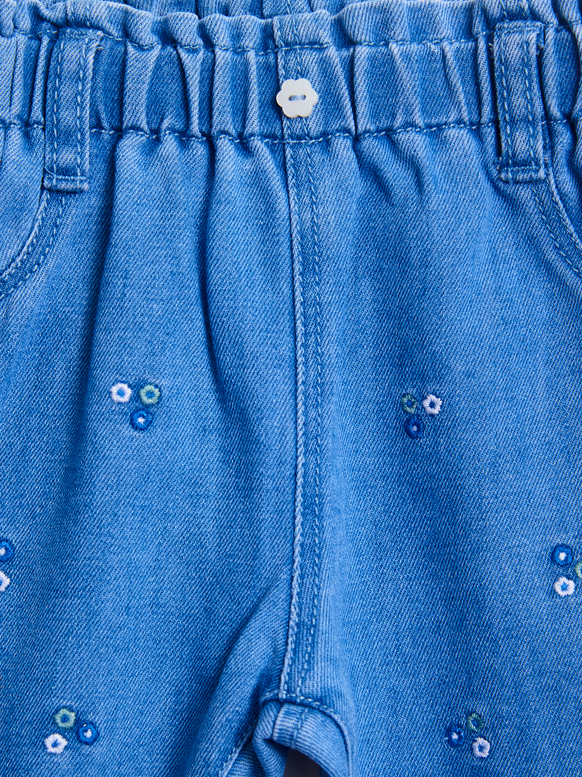 Pantaloni paperbag in Morbido denim. Vita alta arricciata, tasche posteriori, ricamo sul davanti. Vestibilità Morbida, da indossare anche con risvolto per un look sportivo.