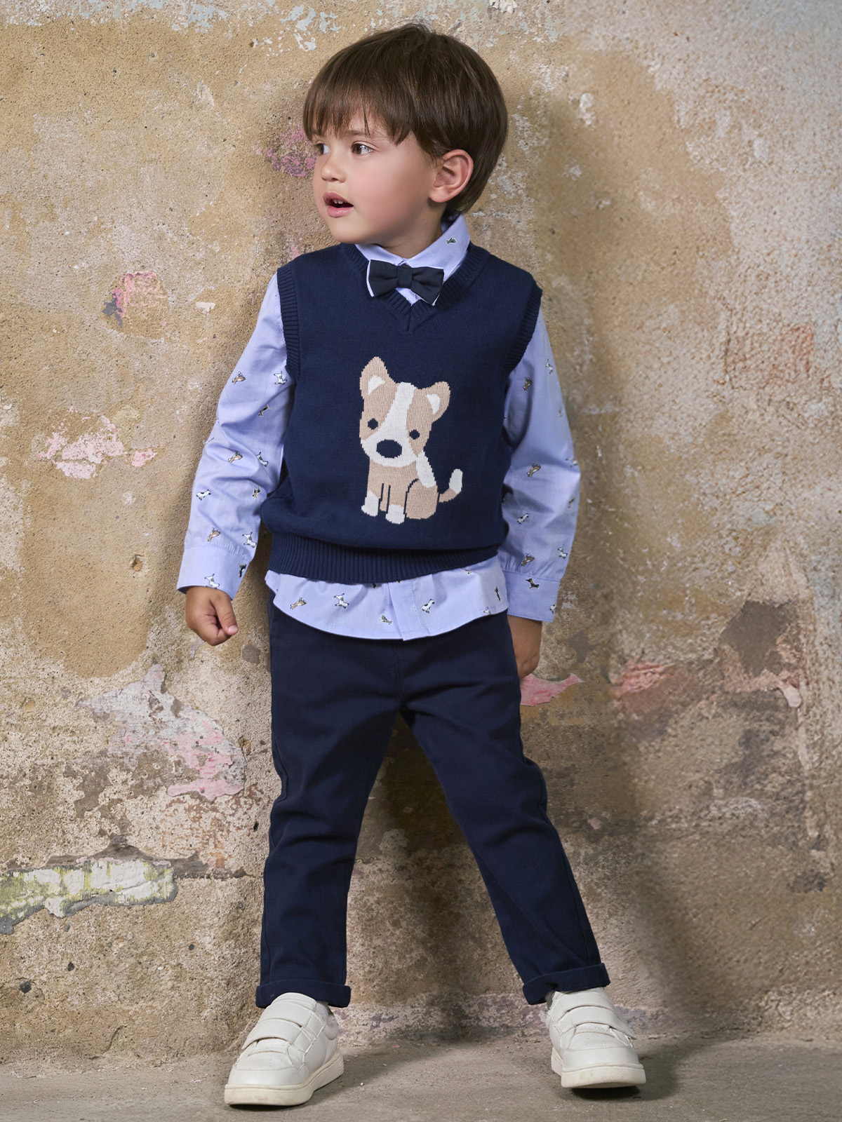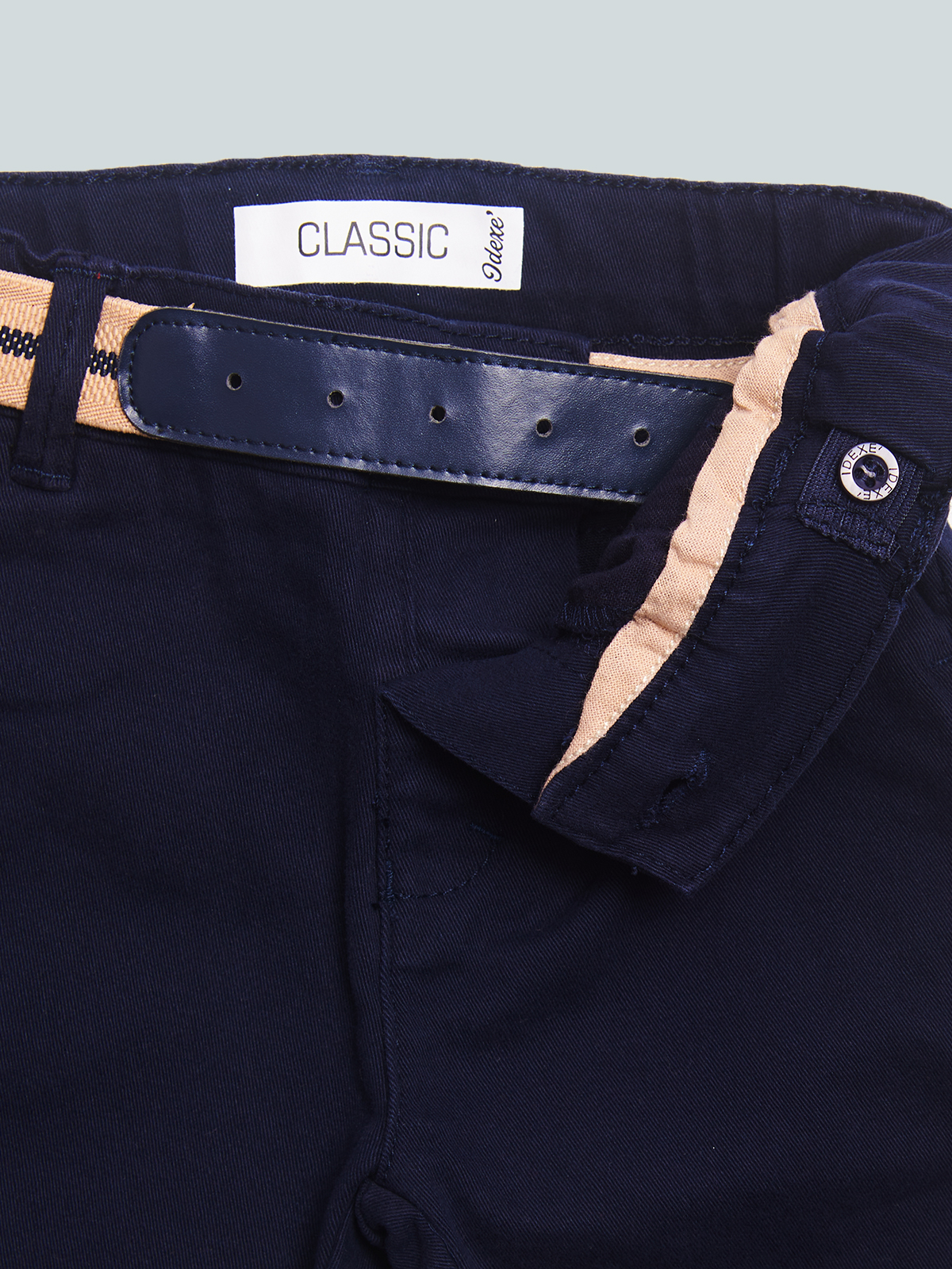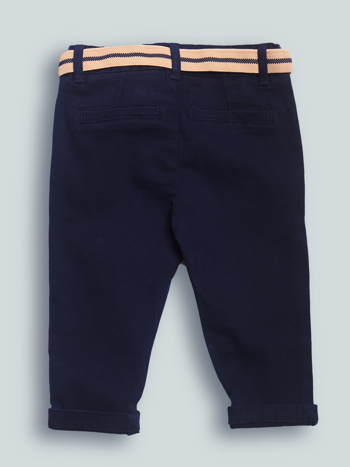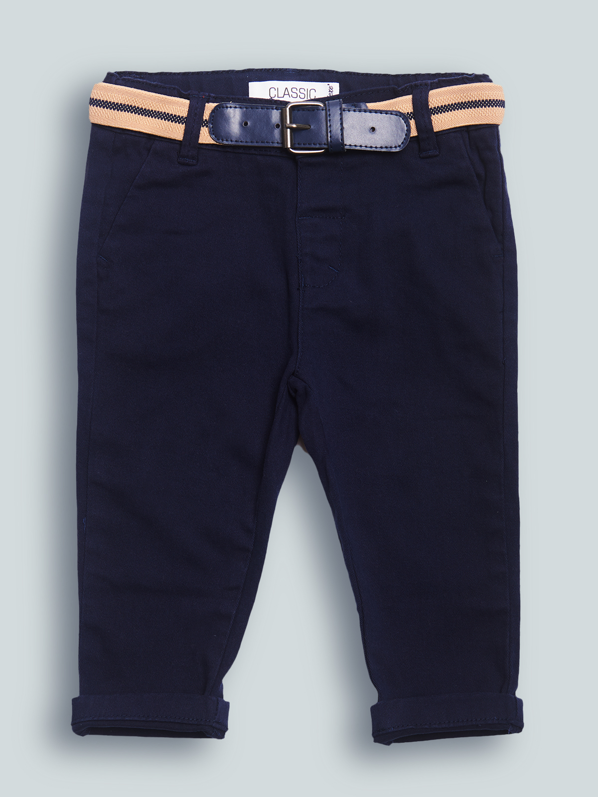 Pantaloni in morbido drill elasticizzato, aperto davanti con bottone ed elastico regolabile per interno vita. Modello chinos, linea asciutta. Tasche davanti e finti filetti sul retro, accessorio di cintura rigata inclusa. Un capo dallo stile “dandy” ed elegante, ideale per le occasioni speciali.