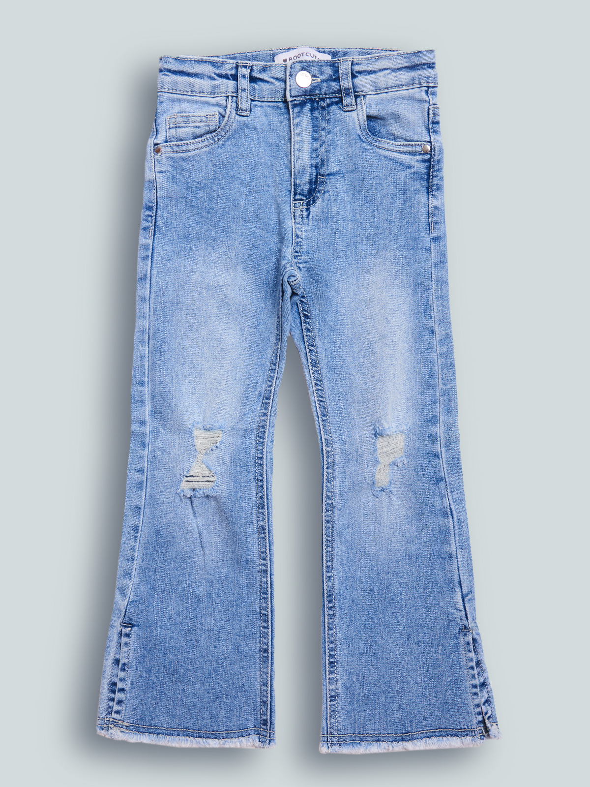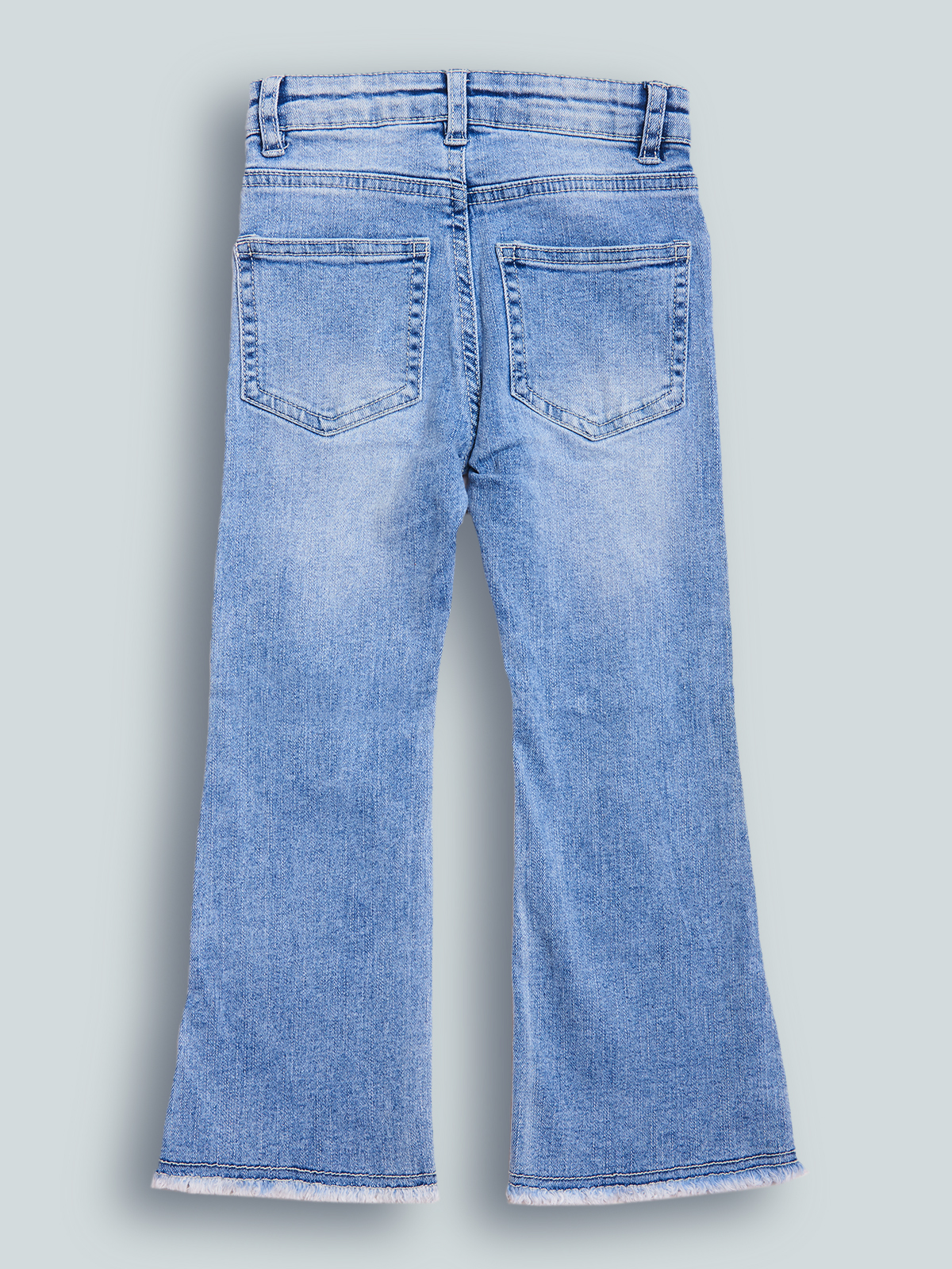 Pantaloni in denim elasticizzato modello bootcut con microstrappi sul davanti. Vita con elastico regolabile interno e apertura con zip e bottone. Un capo glam che piacerà alle mamme e alle bambine attente ai trend di stagione.