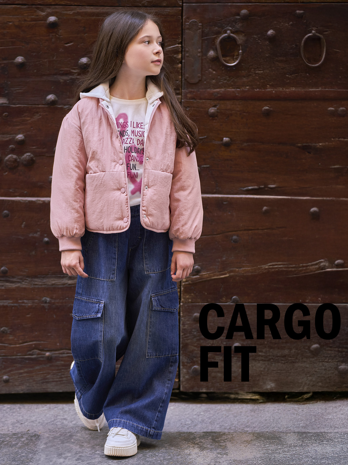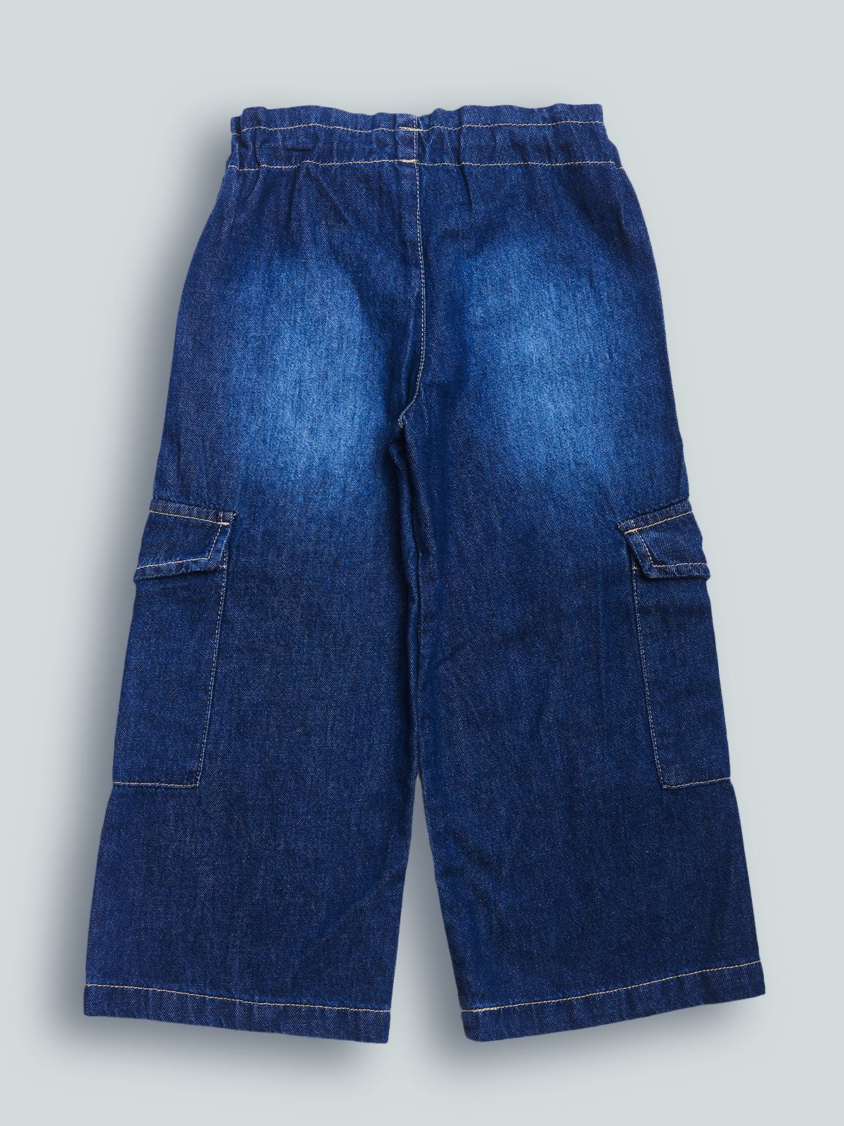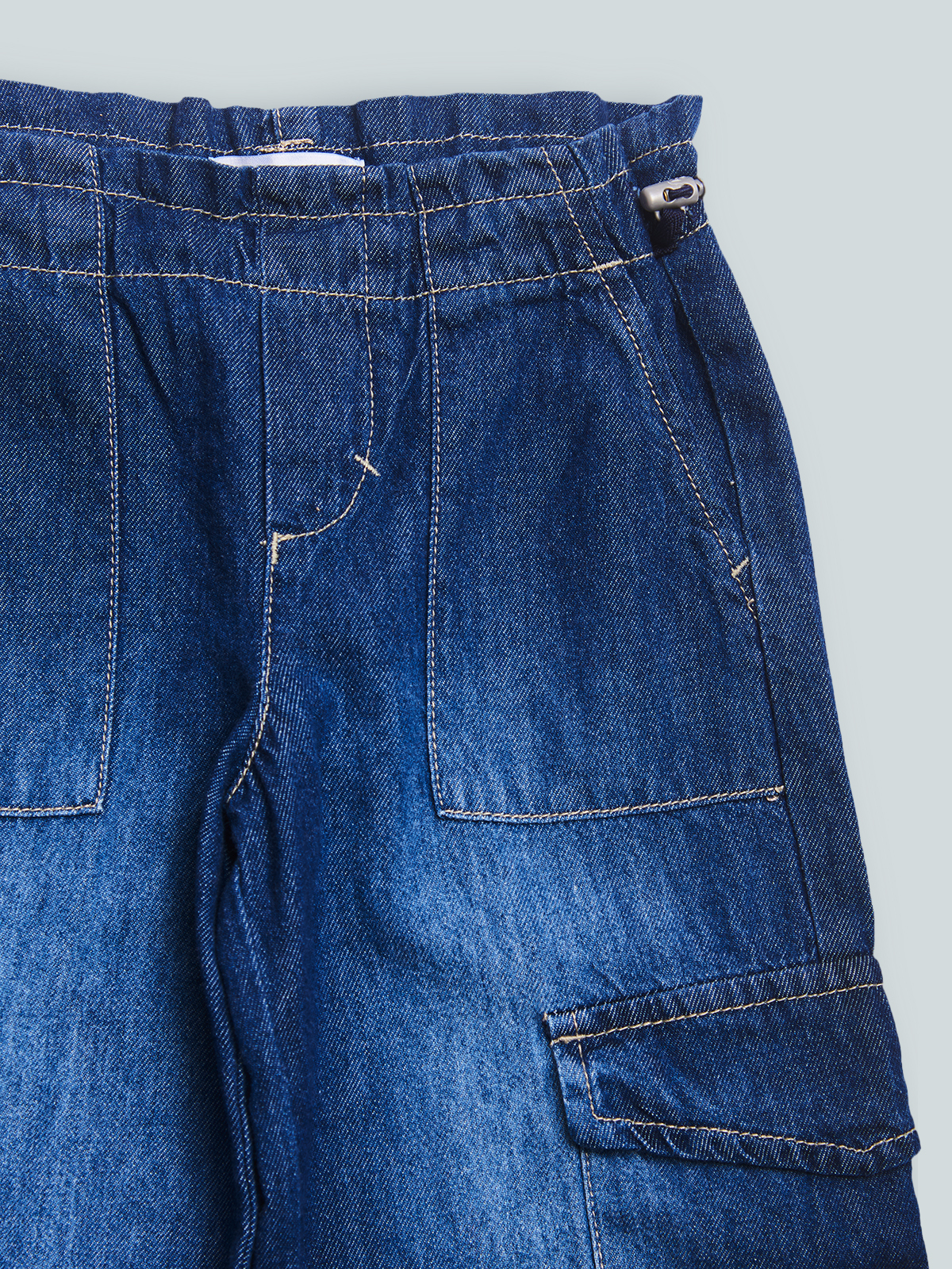 Pantaloni in denim modello cargo, vita elasticata con cordoncino e stopper regolabili. Un capo super trendy.