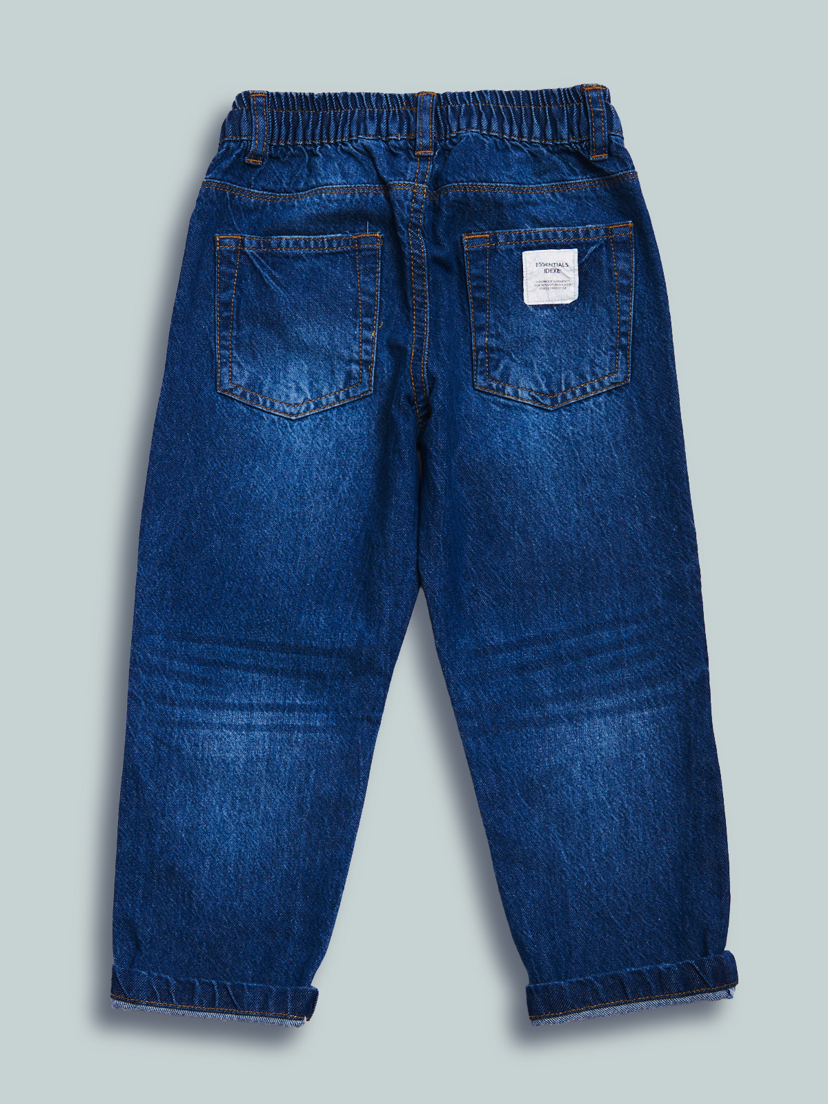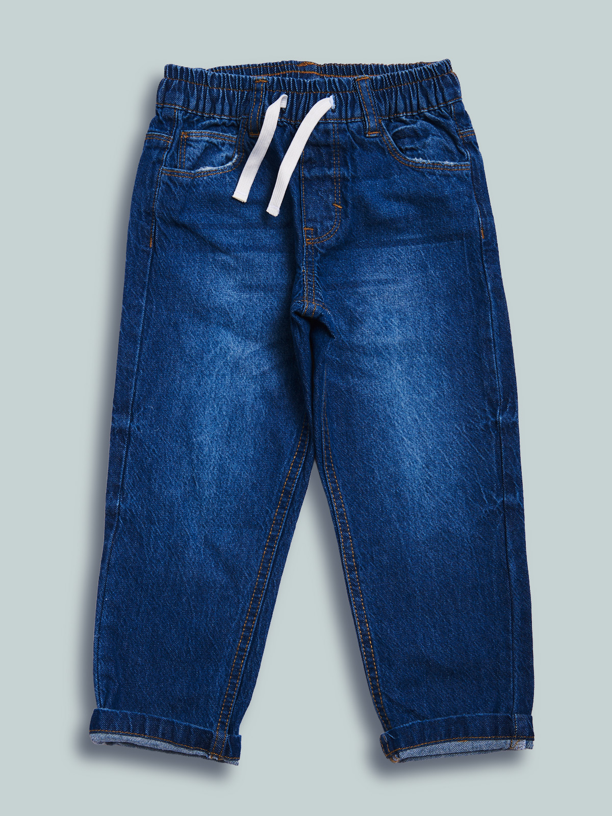 Pantaloni in denim fermo, non elasticizzato. Modello cinque tasche con vestibilità regular linea diritta, vita elasticata e coulisse regolabile. Lavaggio medio effetto vissuto. Un evergreen del guardaroba, da abbinare a qualsiasi look di stagione.