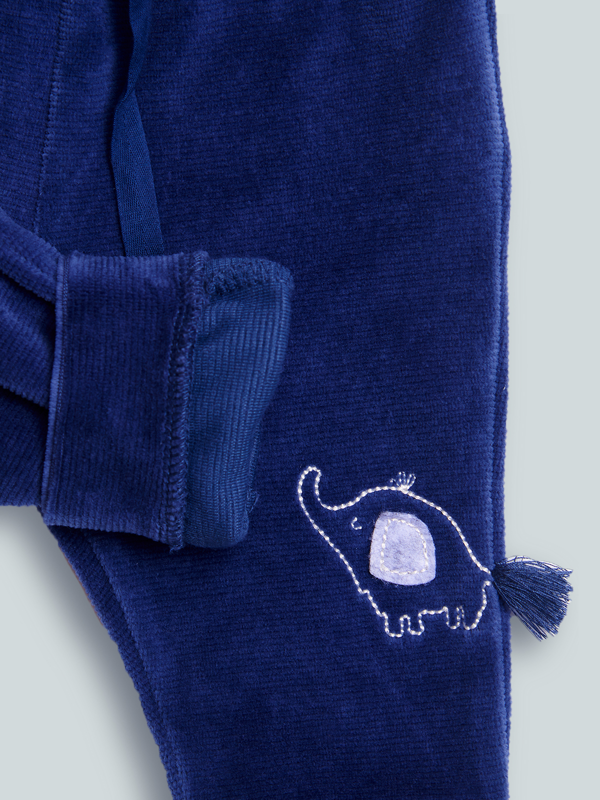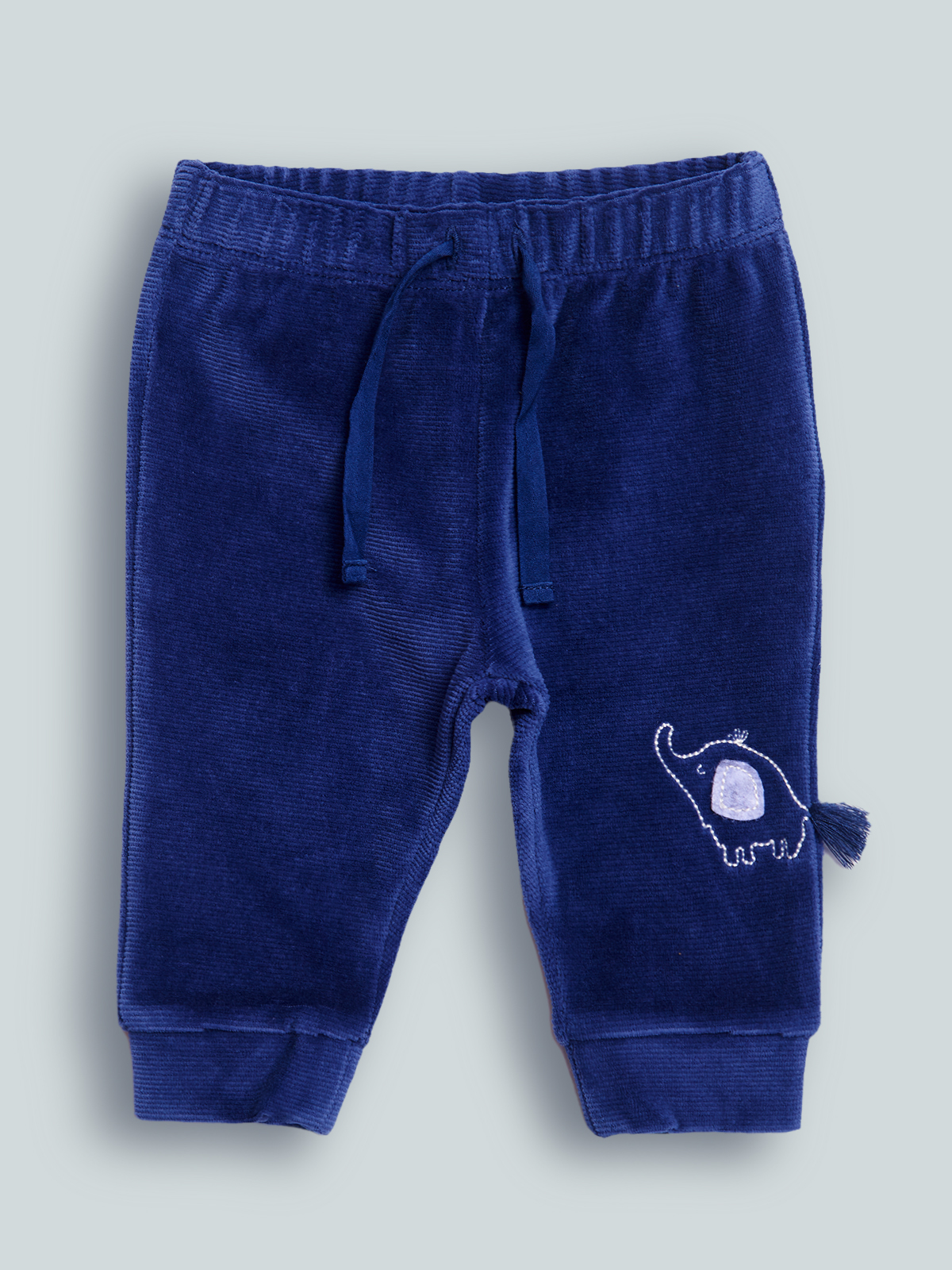 Pantaloni in Morbida ciniglia a coste, vita elasticata. Simpatico elefantino ricamato con codina 3D. Un capo pratico e divertente, ideale per il tempo libero.