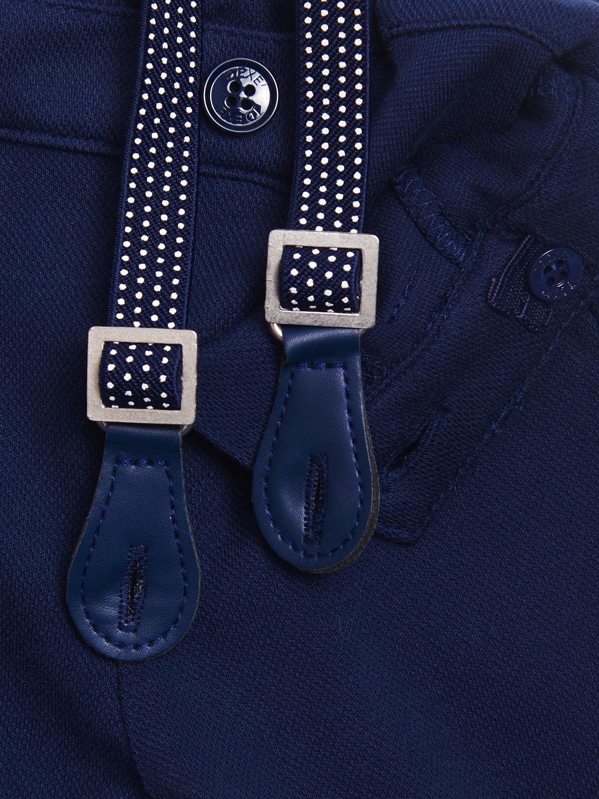 Pantaloni in Morbido tessuto Maglia effetto piquet. Per una vestibilità Migliore è stata realizzata la vita regolabile, tramite un elastico interno cintura e con il relativo bottoncino per la regolazione. Particolarità del capo: fornito di bretelle regolabili e removibili. Un capo elegante, adatto per le occasioni speciali.