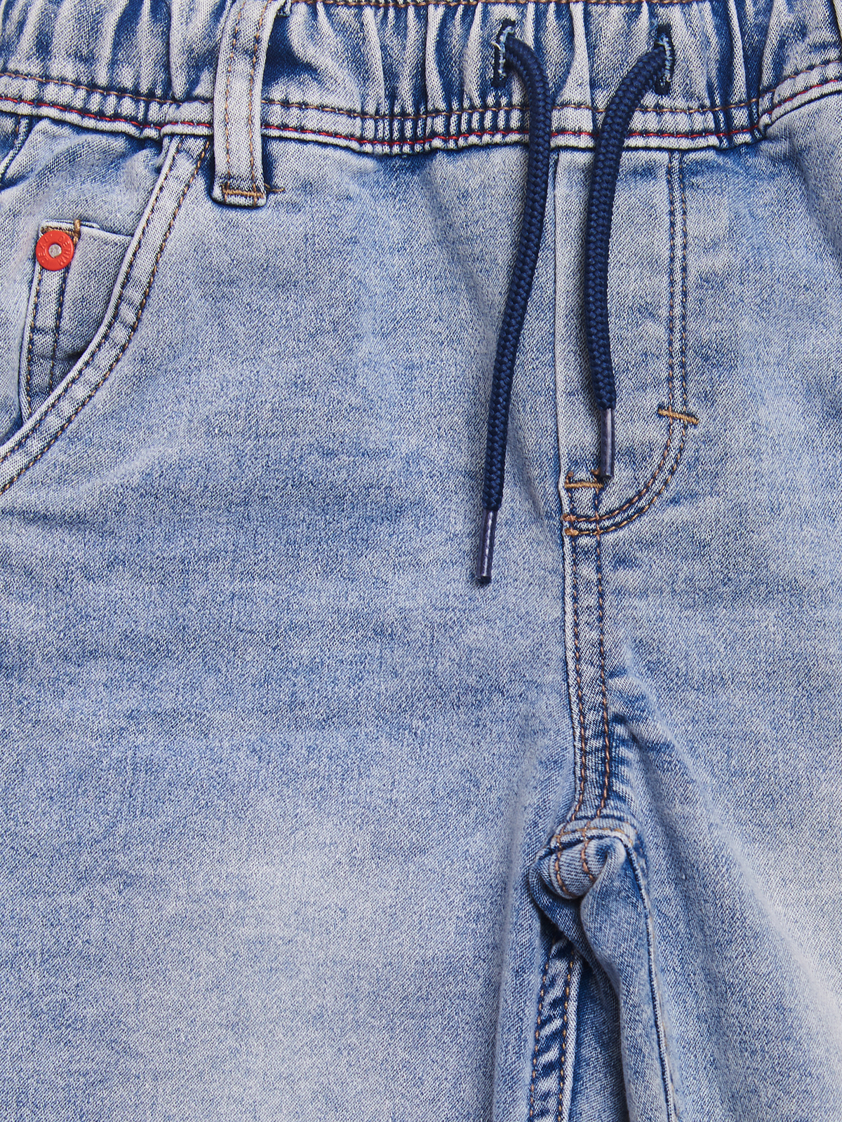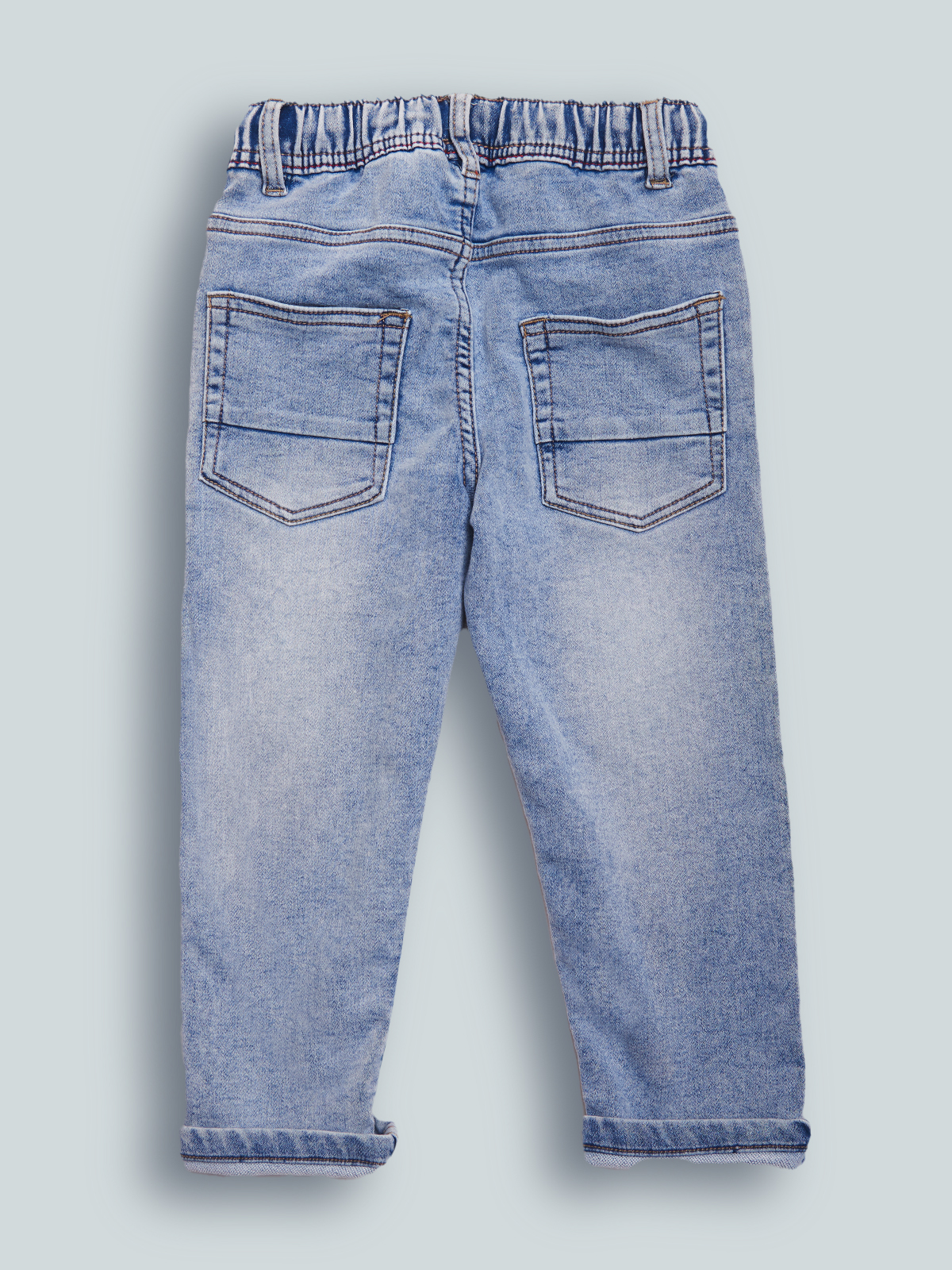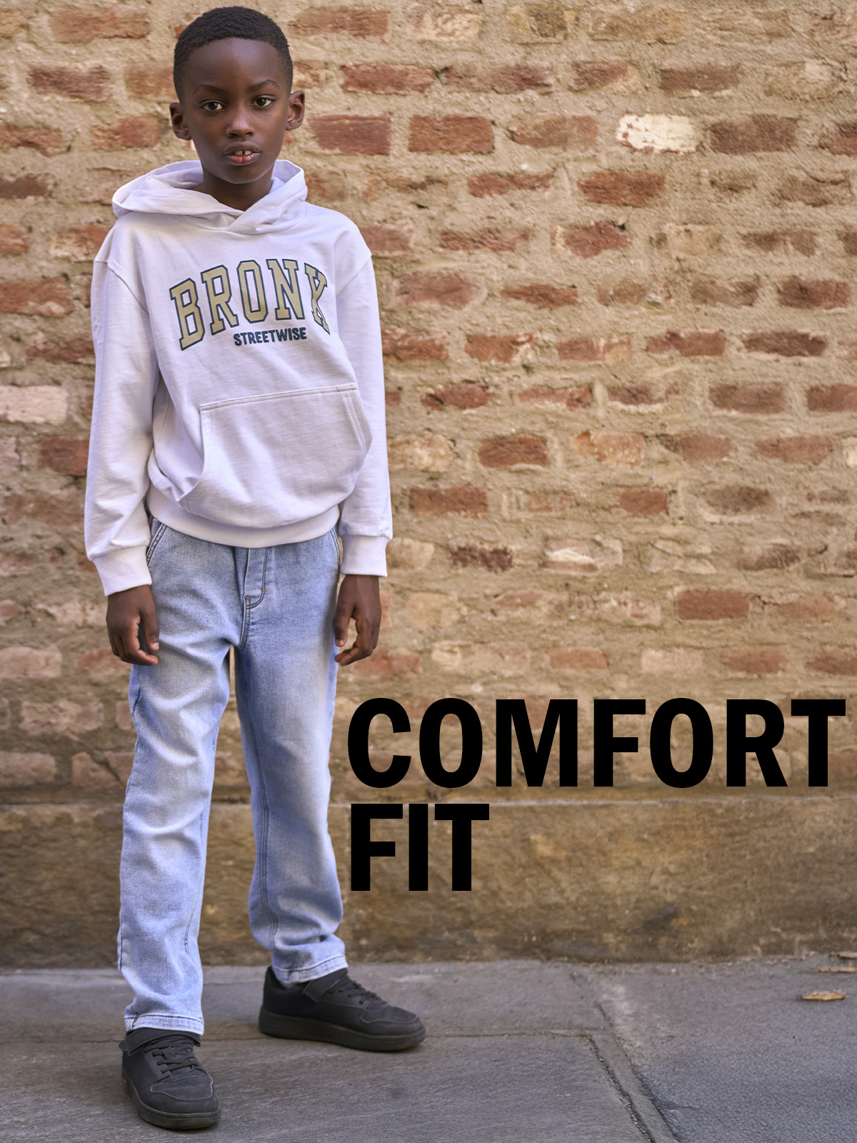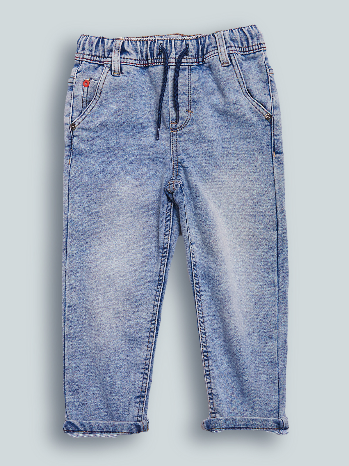 Pantaloni in felpa effetto denim, un Morbido tessuto elasticizzato che ha il comfort di una felpa Ma l’aspetto di un denim. Modello cinque tasche con vestibilità regular, linea diritta, vita elasticata e coulisse regolabile, lavaggio chiaro effetto vissuto. Un capo Molto pratico e versatile che non può Mancare nell’armadio del vostro bambino.