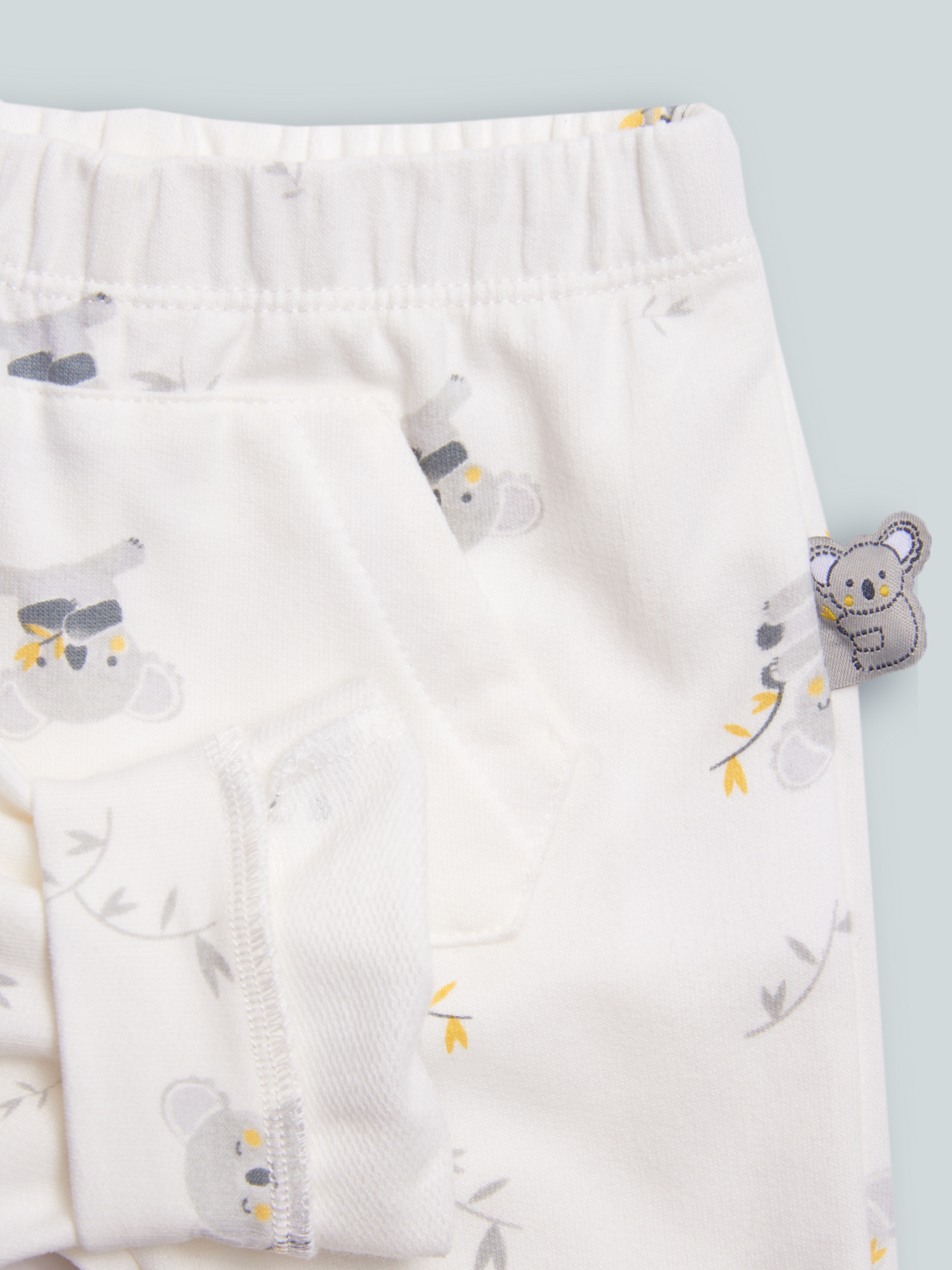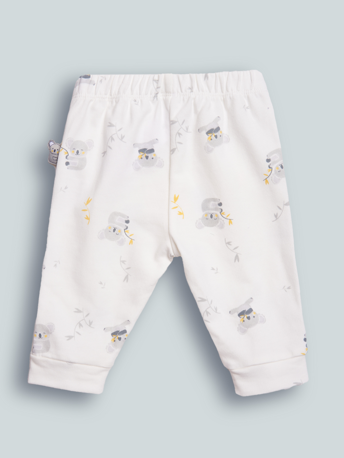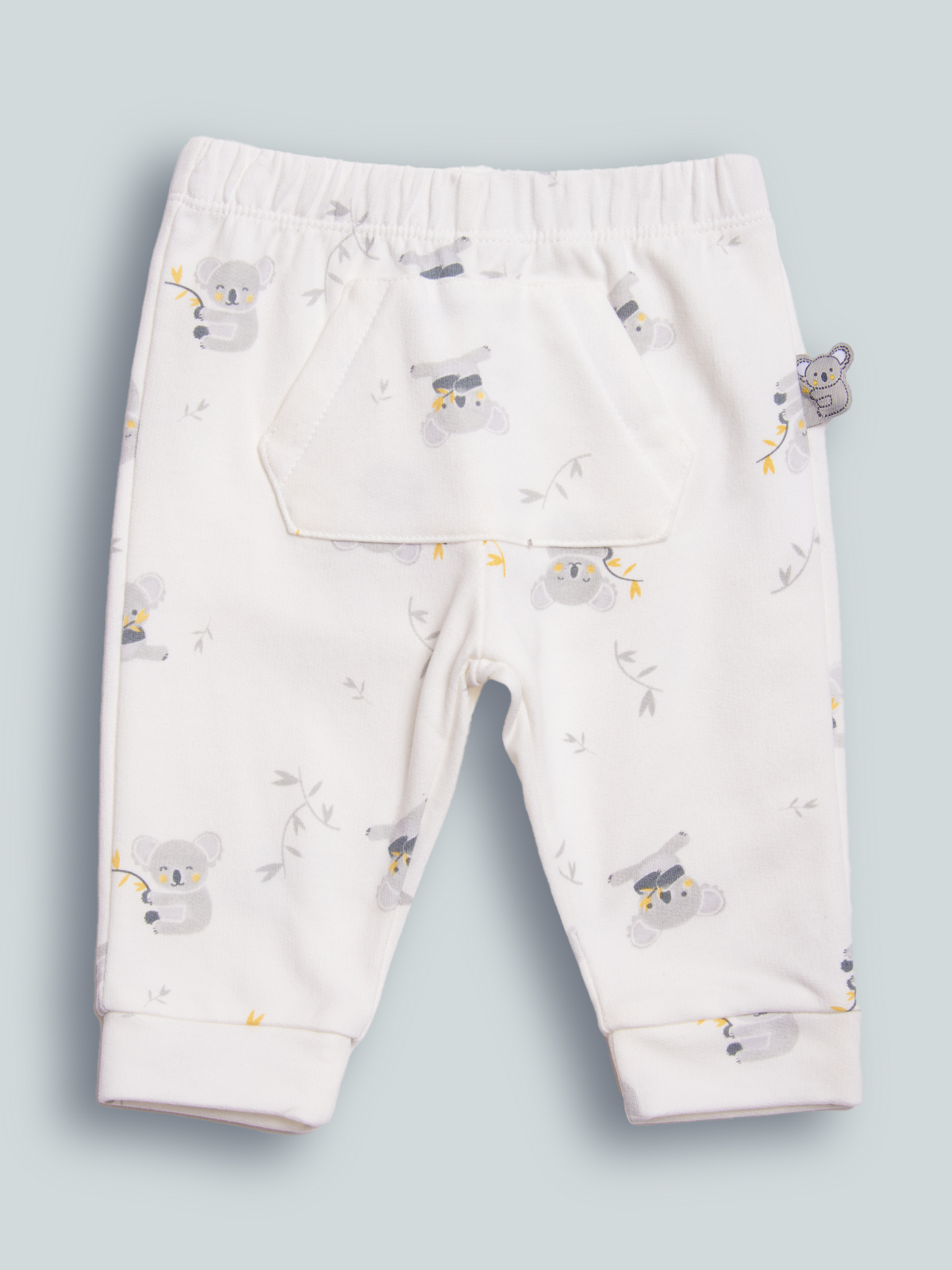 Pantaloni in felpa leggera stampato fantasia. Vita elasticata, fondo gambe con polsino. Simpatica etichetta imbottita sul fianco, tasca Marsupio davanti. Ideale per un look casual e Moderno.
