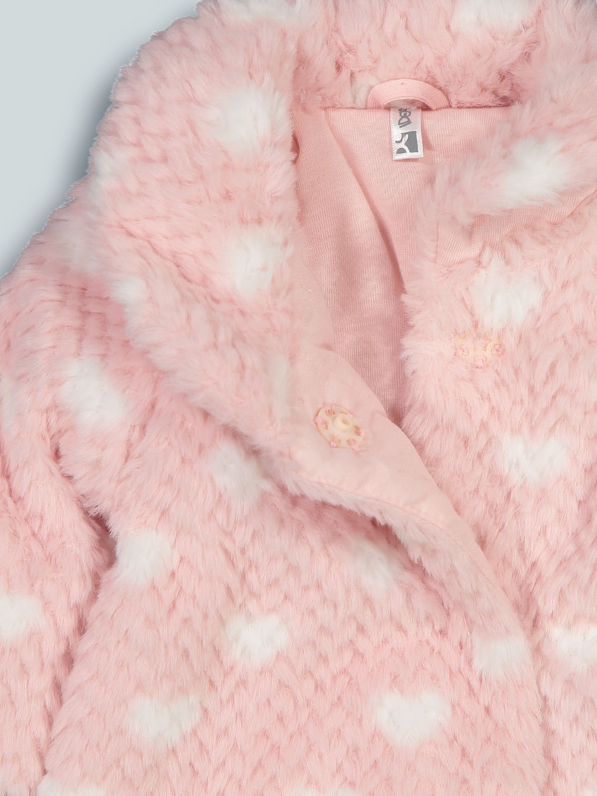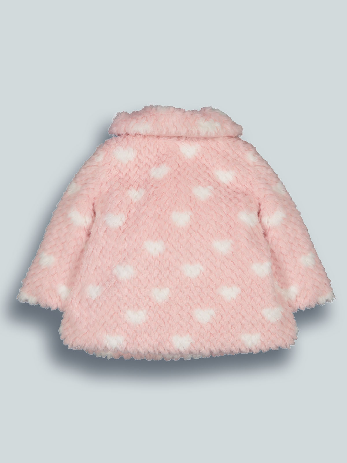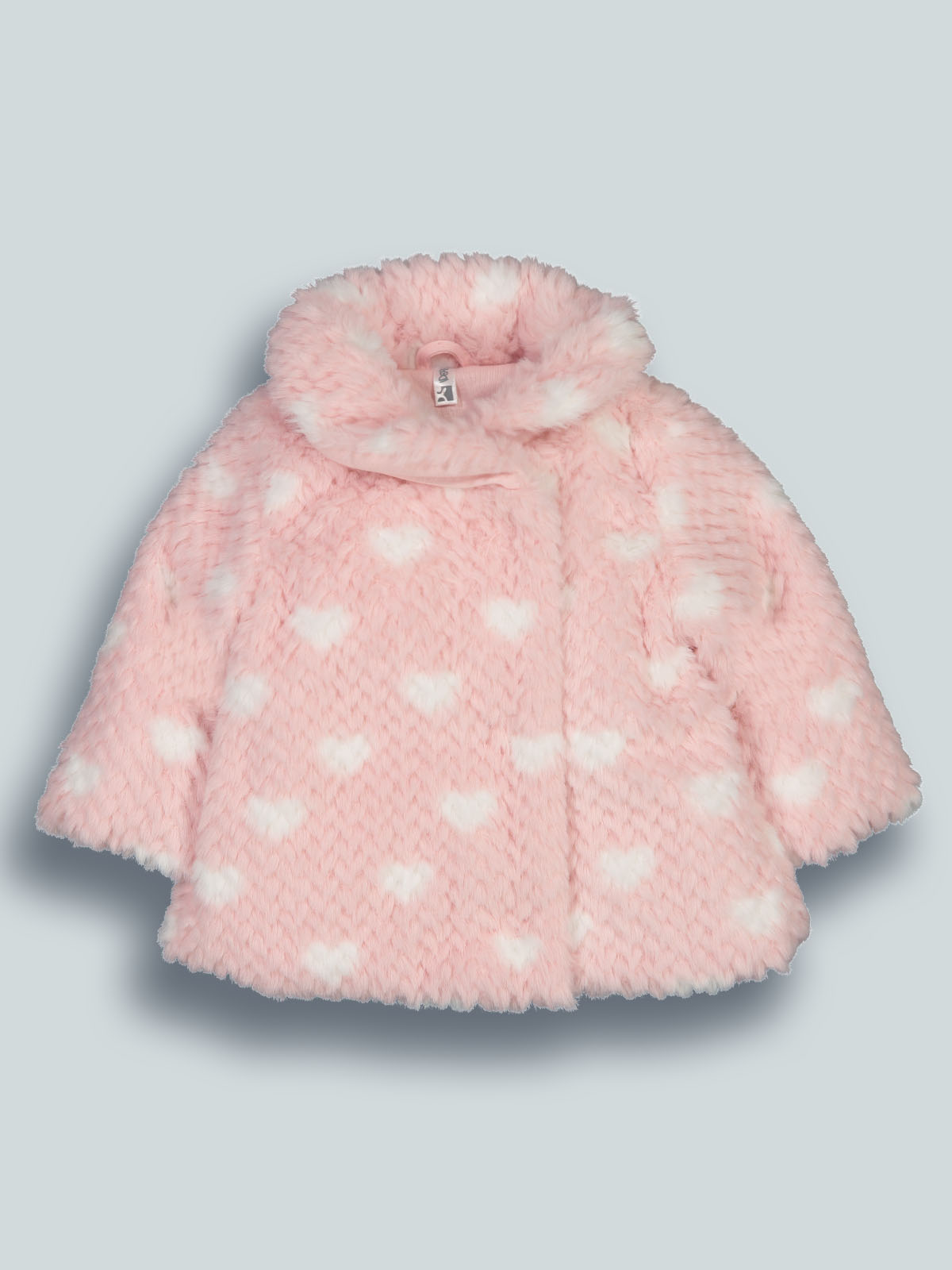 Giubbotto in peluches lavorato macro cuori. Il modello del collo offre maggiore riparo dal freddo alle vostre neonate. Foderato internamente. Un prodotto funzionale, caldo e di tendenza, perfetto per affrontare la stagione invernale.