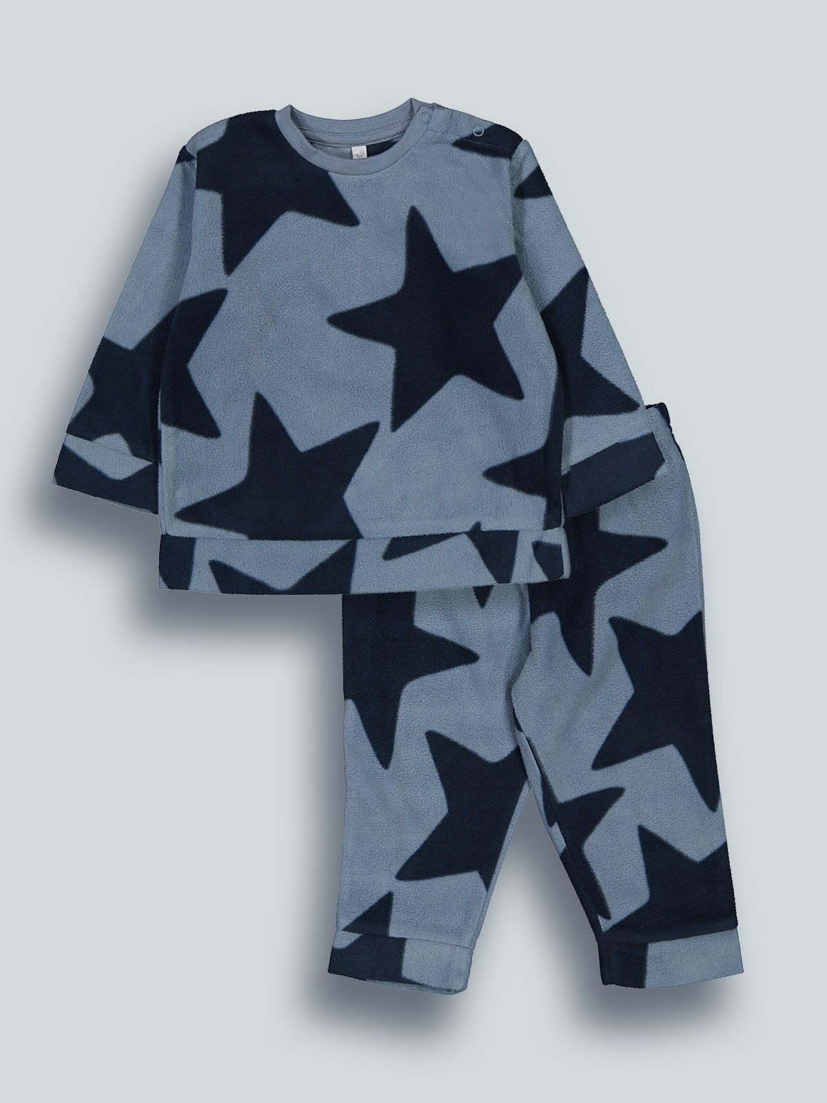 Pigiama due pezzi in pile leggero fantasia stelle. Tshirt a manica lunga, pratica apertura su spalla con bottoncini a pressione. Pantaloni con elastico a vita. Un capo caldo e confortevole, ideale per le notti più fredde.