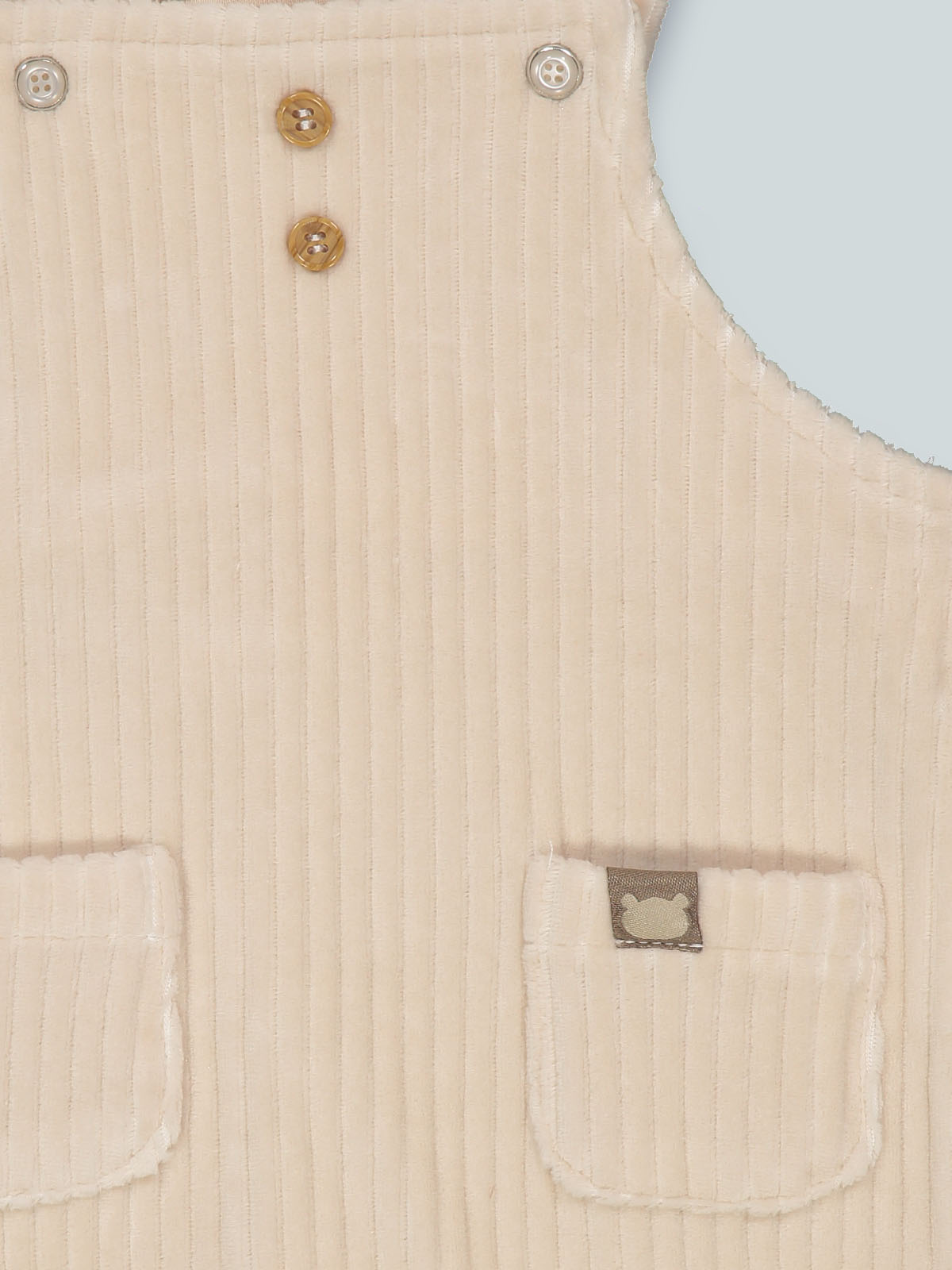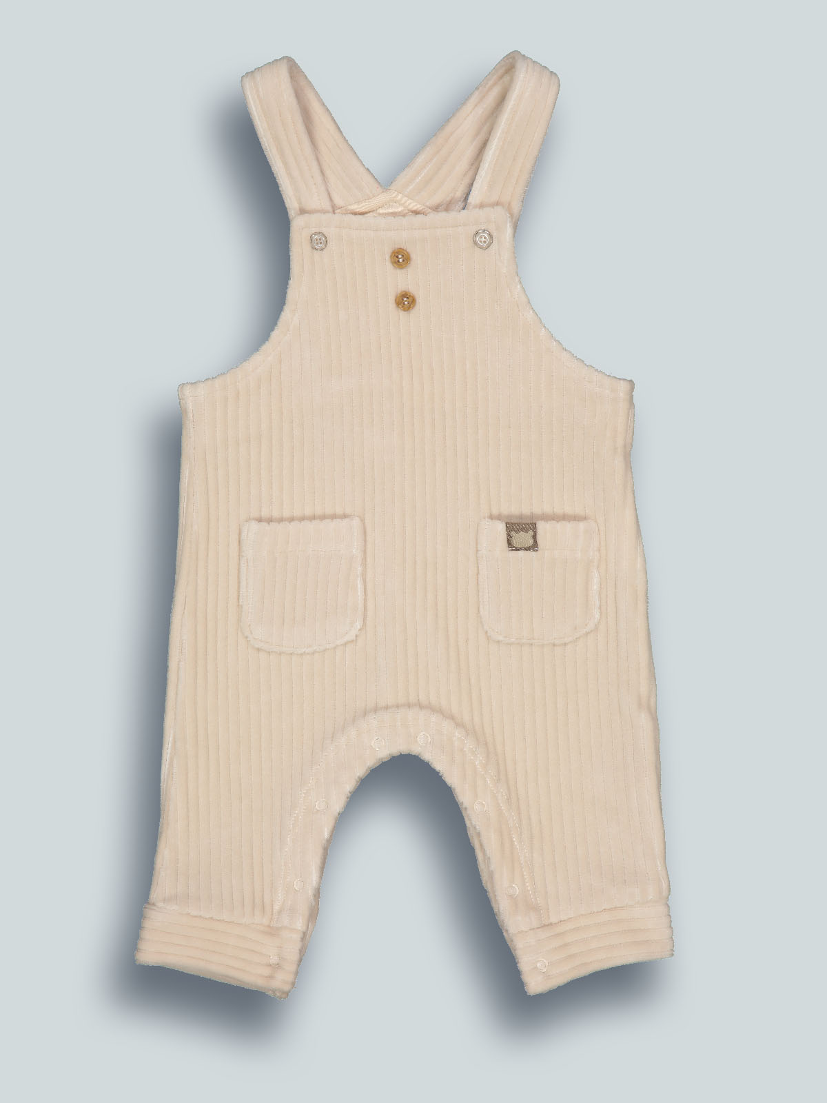 Salopette in ciniglia a coste larga. Le bretelle sono regolabili, mediante due bottoni a pressione, apertura entrogamba. Tasche funzionali davanti. Un capo pratico ideale per il tempo libero.