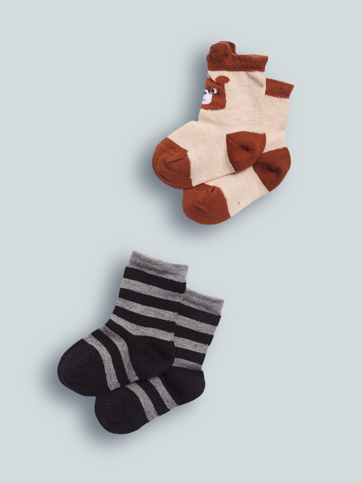 Set due paia di calzini in Morbido Misto cotone. Una variante in beige Melange con simpatico orsetto e orecchie tridimensionali. L’altra variante rigata. Due proposte differenti, da abbinare in base al look della giornata.