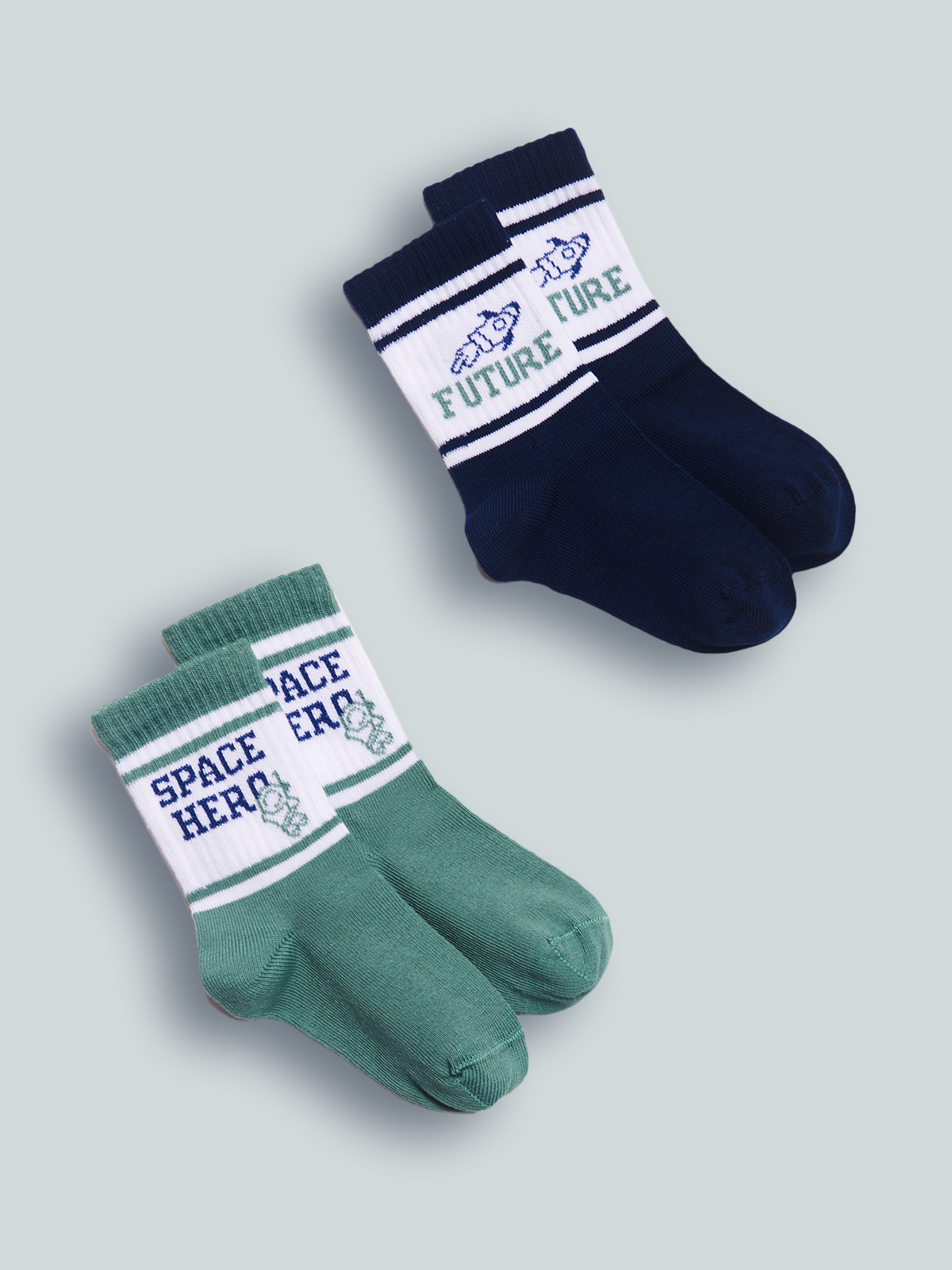 Set due paia di calzini in Morbido Misto cotone. Lavorazione costa per la parte alta della calza con disegno e scritta in tema spazio che piace sempre ai bambini.