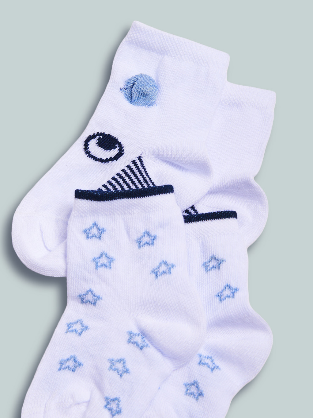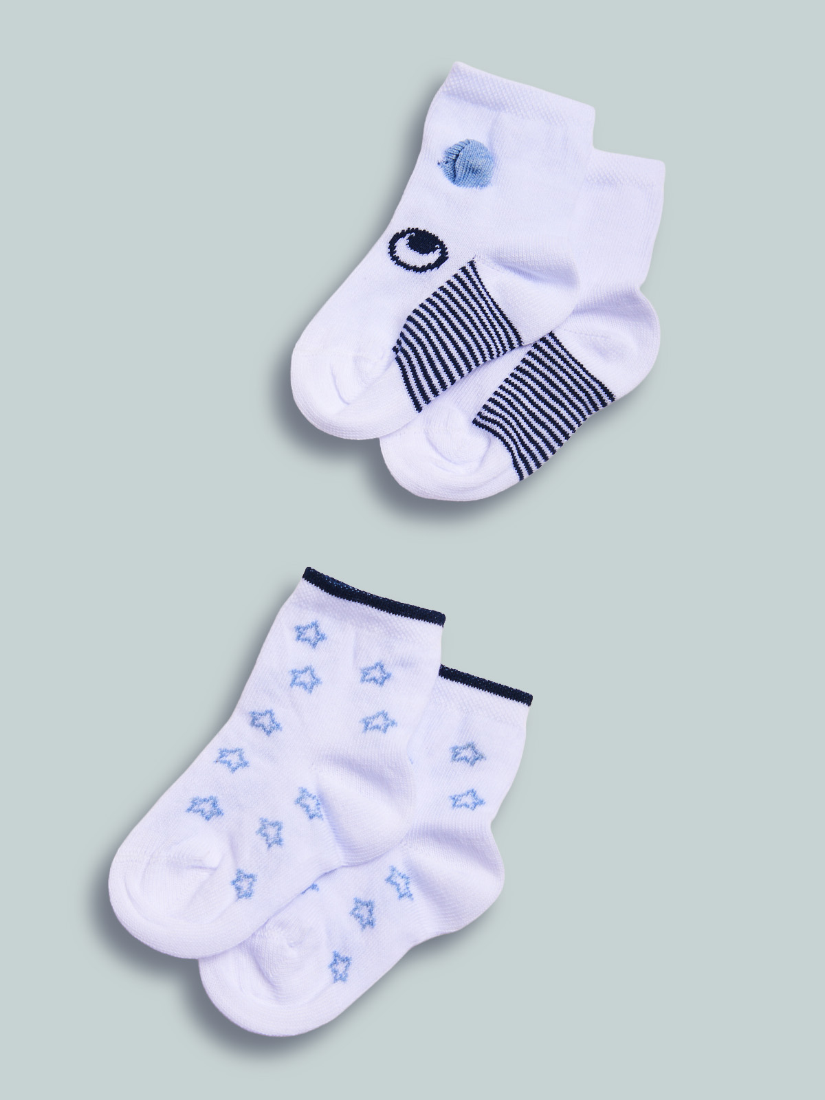 Calzini lunghezza sopra caviglia in morbido misto cotone. Doppia variante colore: uno bianco con fantasia stelline, l’altro bianco con musetto e orecchie 3D. In un unico acquisto avrete due proposte molto pratiche e alla moda!