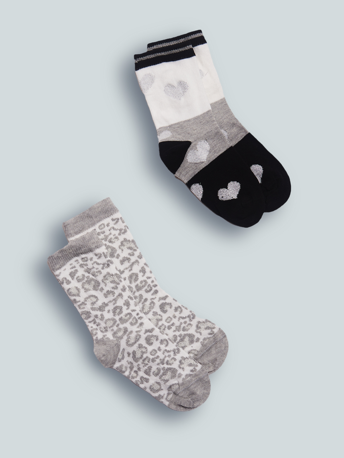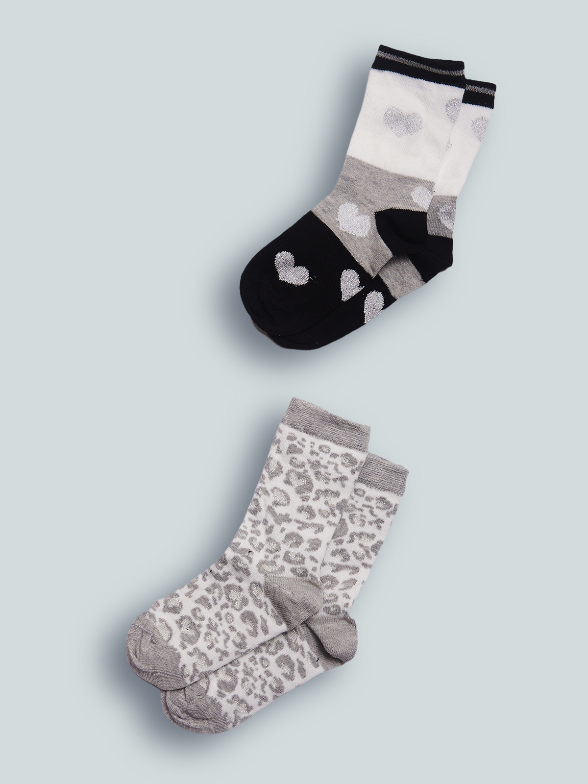 Set due paia di calzini in Maglia Misto cotone in fantasia Maculato e rigato con cuoricini e lurex. Ideali da indossare a scuola e nel tempo libero.