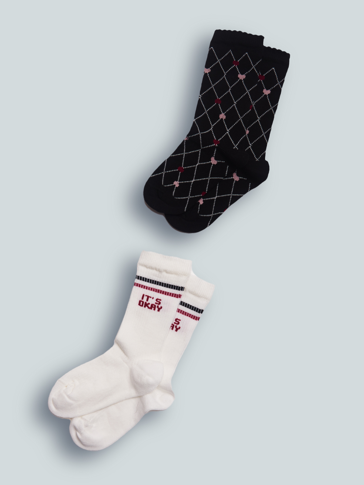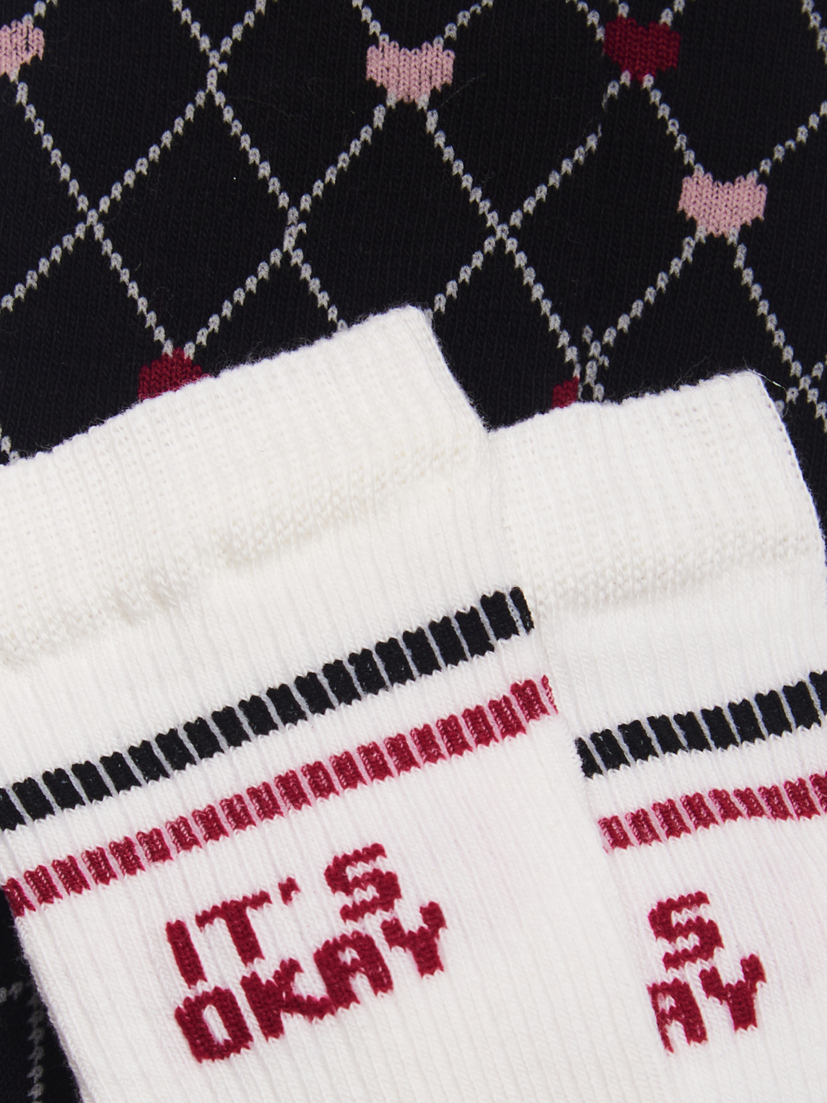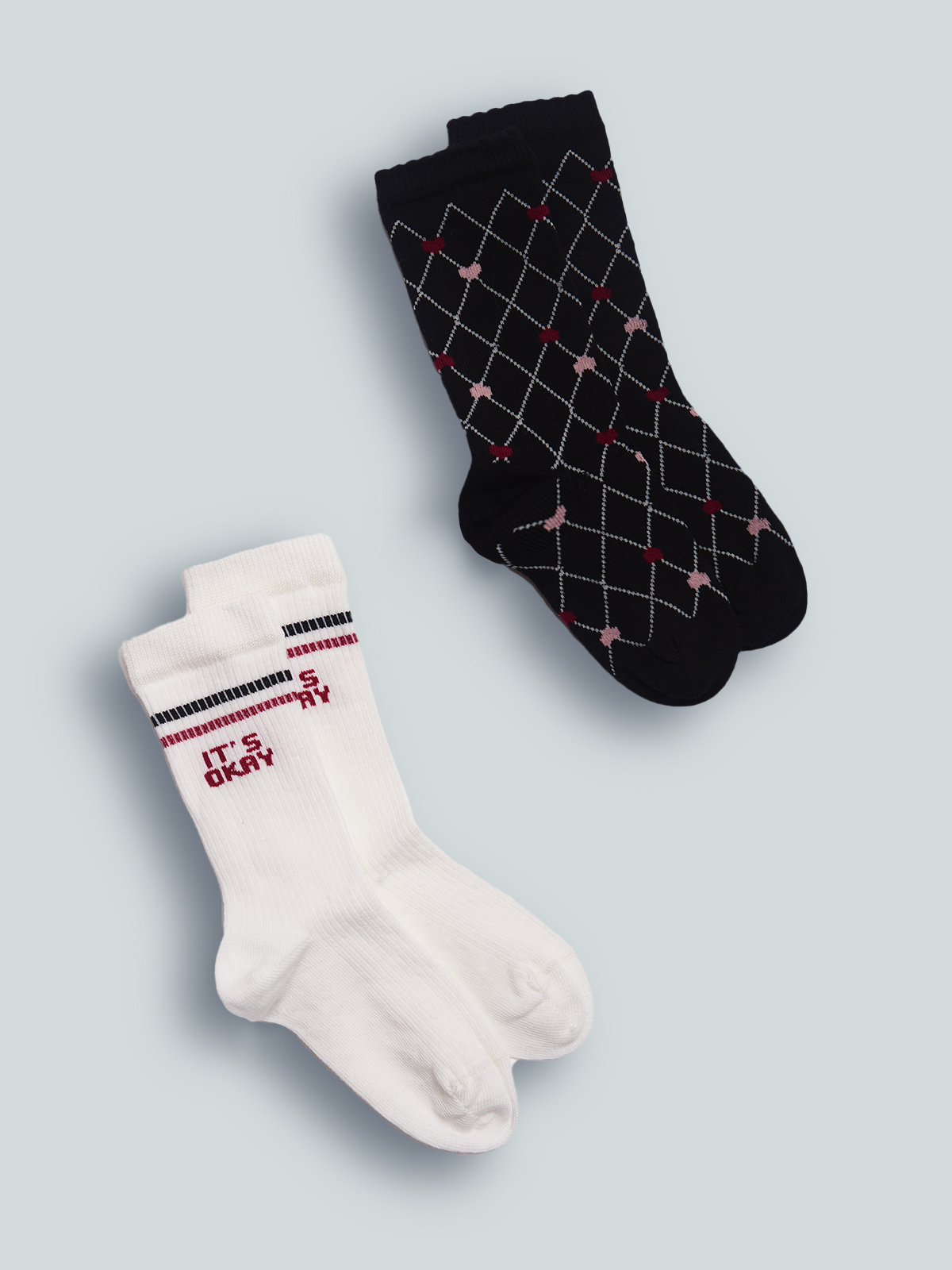 Set due paia di calzini lunghezza Metà polpaccio in Maglia Misto cotone lavorazione costina unita e in fantasia cuoricini. Ideali da indossare a scuola per un look sporty fashion.
