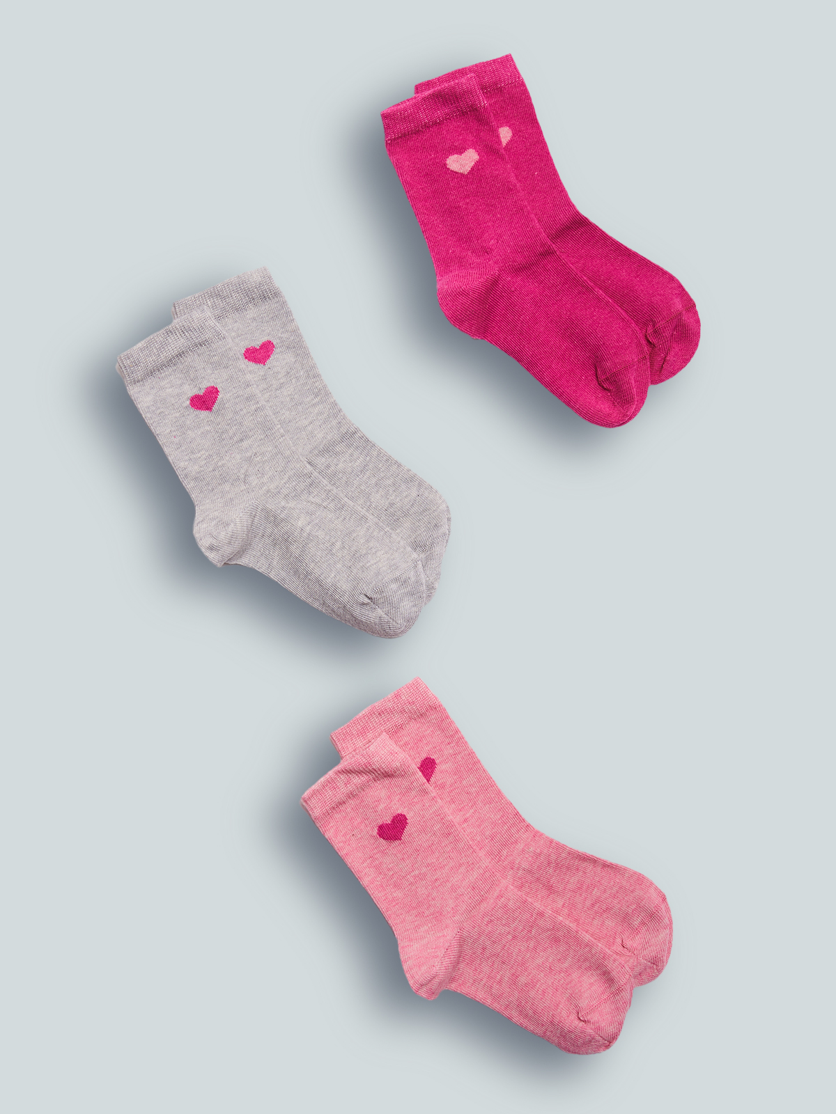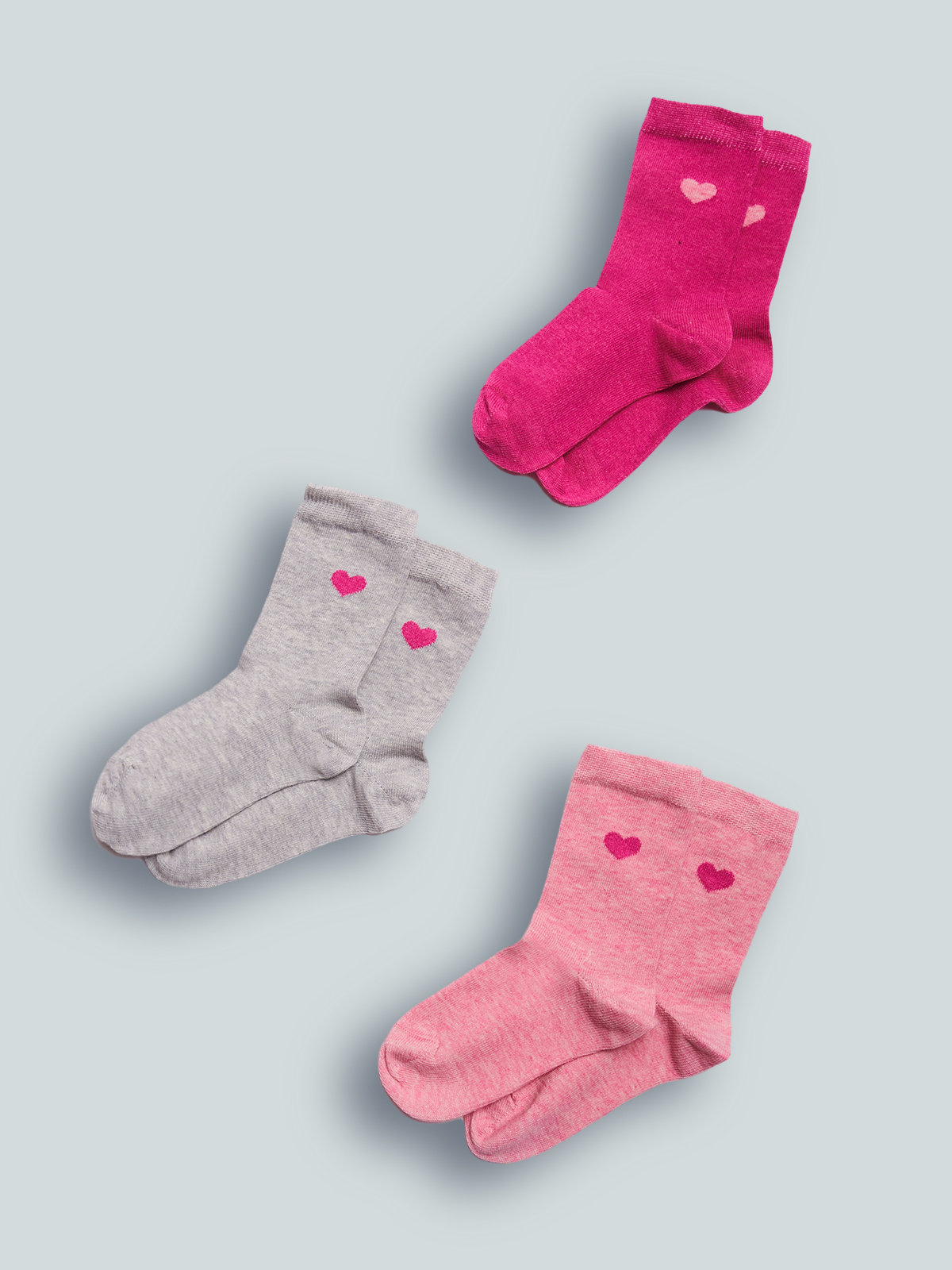 Set tre paia di calzini in Morbida Maglia Misto cotone Melange con cuoricino sul lato. Ideali da indossare a scuola e nel tempo libero.