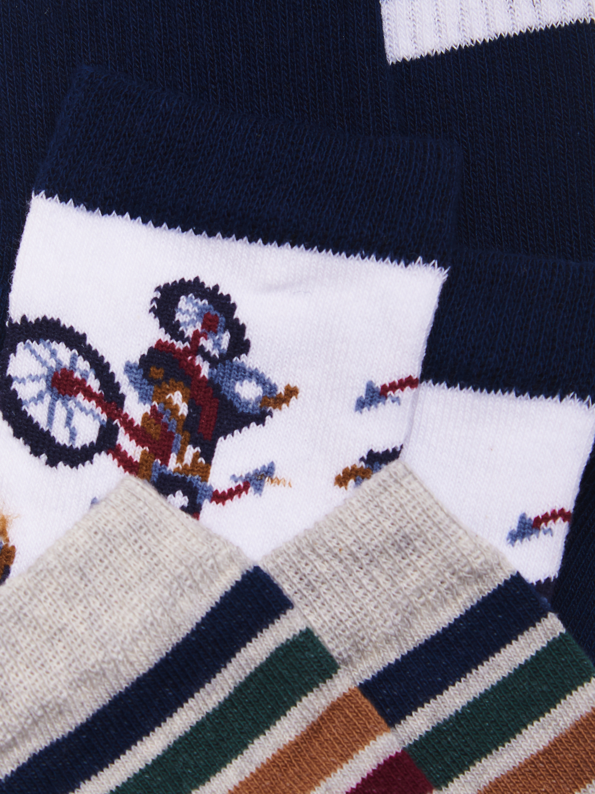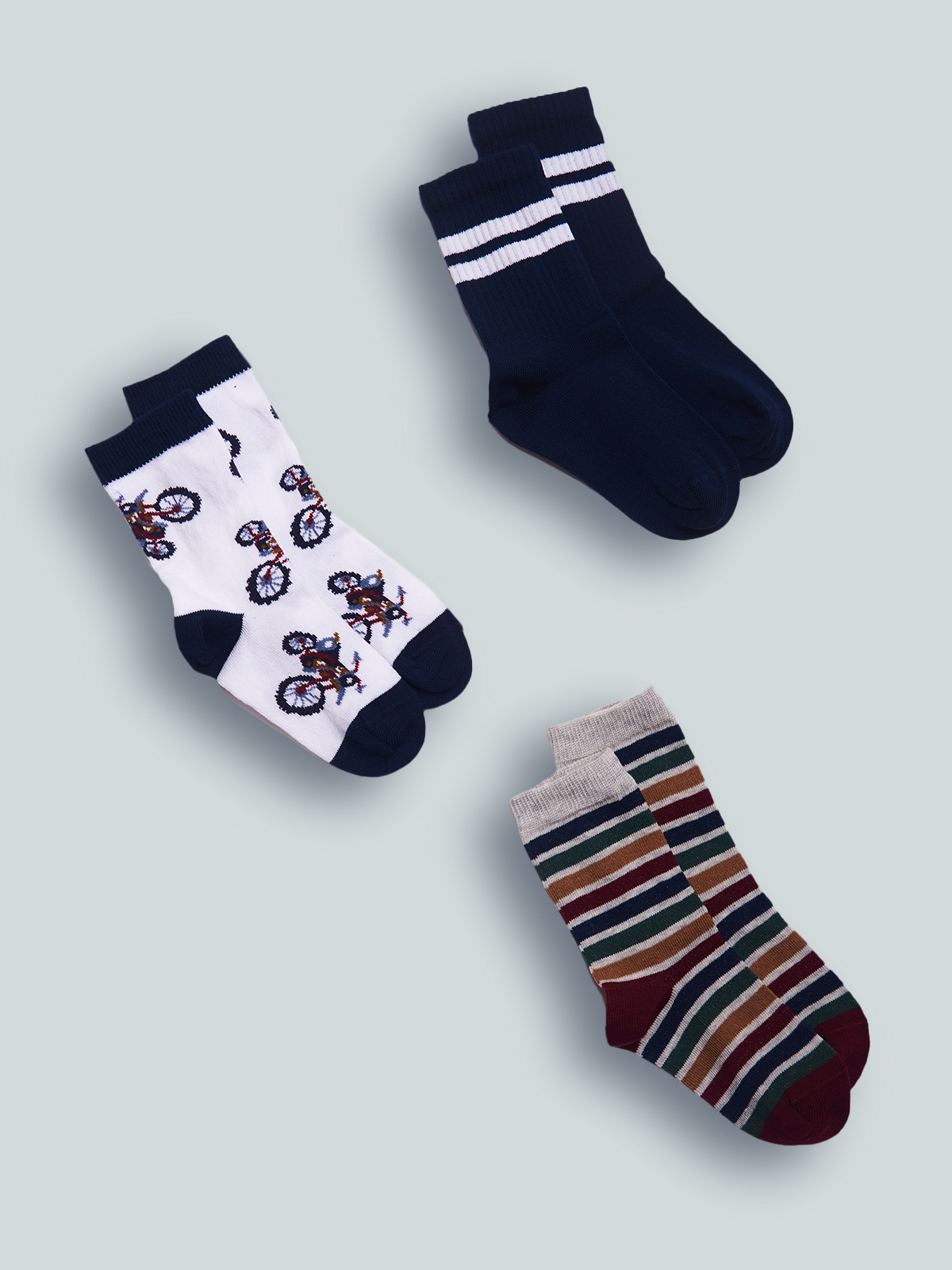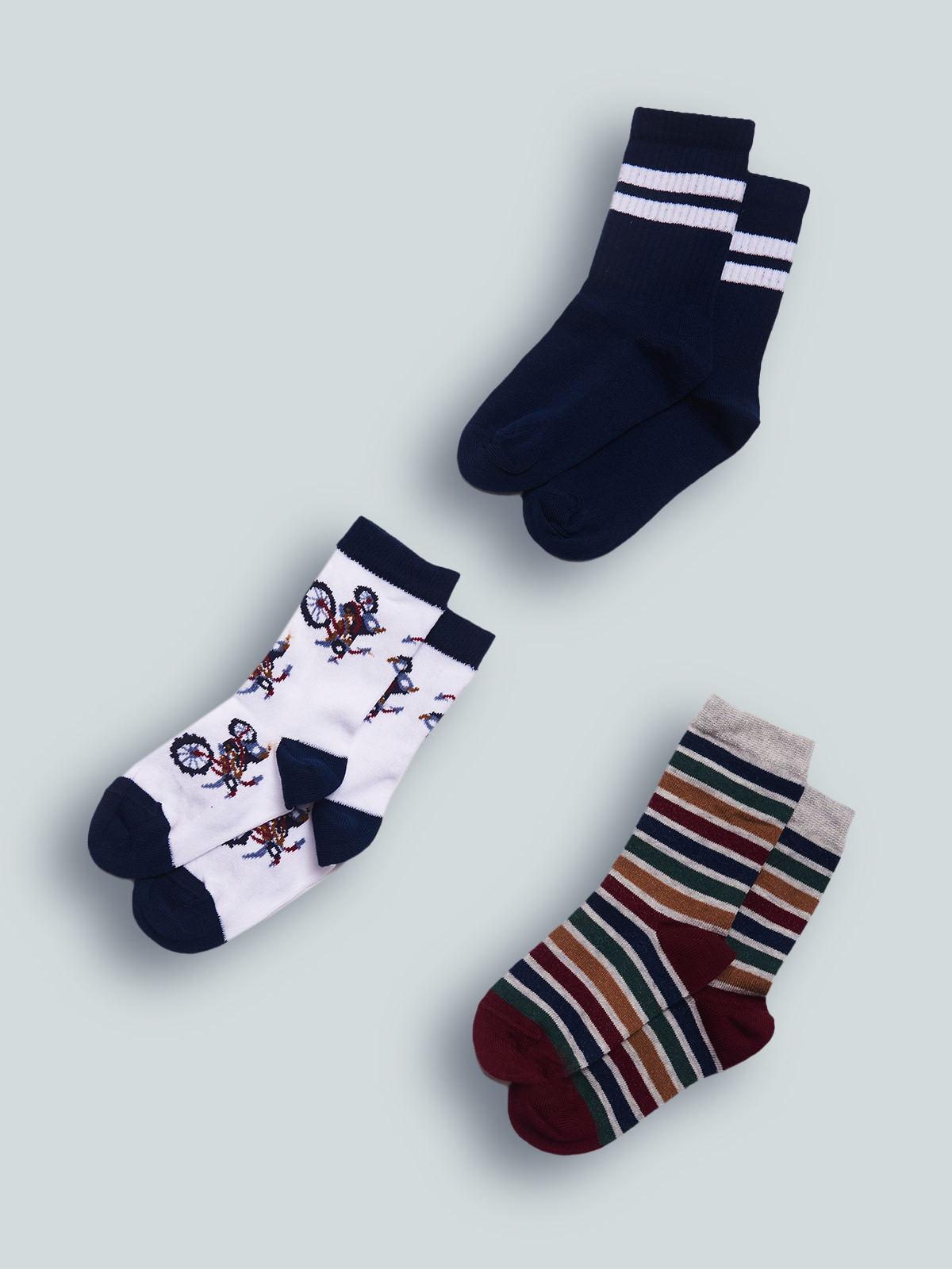 Set tre paia di calzini in Morbido Misto cotone. In tre proposte differenti: tinta unita a costa con Motivo di righe, in fantasia o rigate. Facili da abbinare in base al look della giornata.