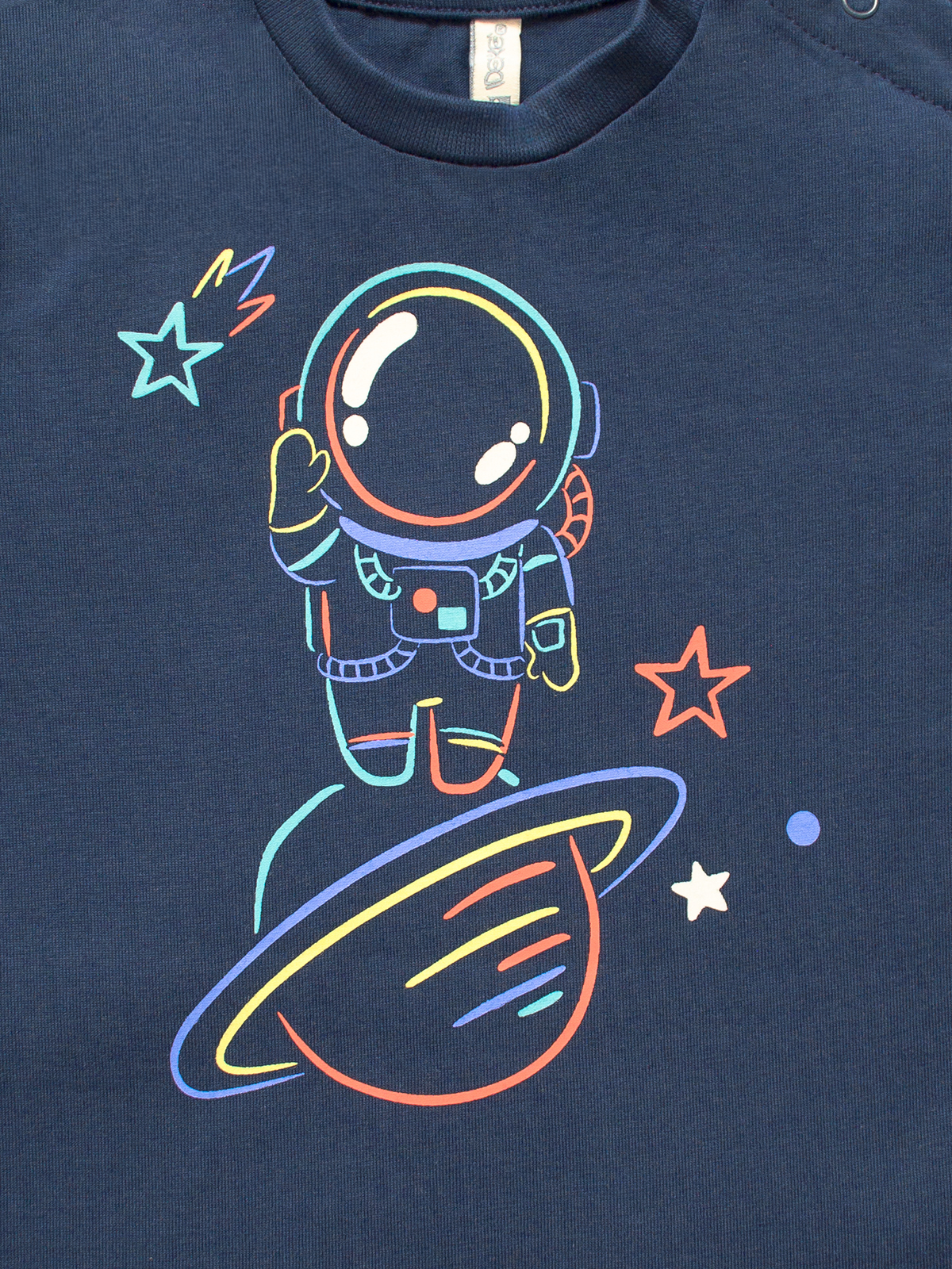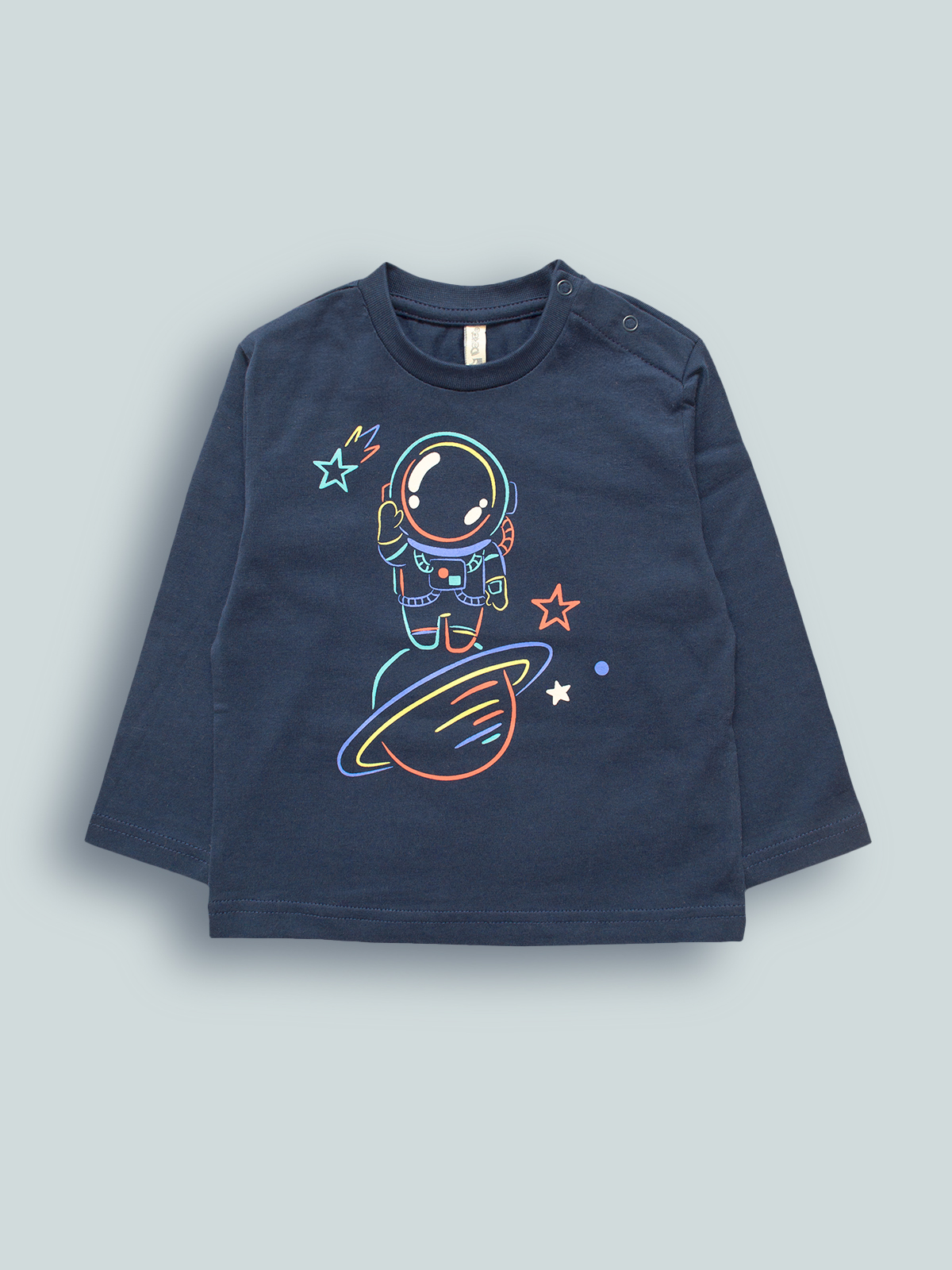 Tshirt Manica lunga girocollo in cotone, pratica apertura con bottoncini a pressione su spalla. Astronauta stampato sul davanti, un tema che piace sempre Molto ai bambini.