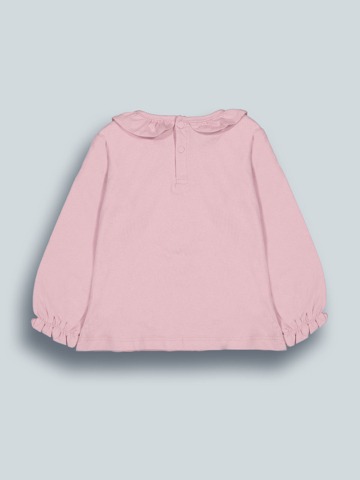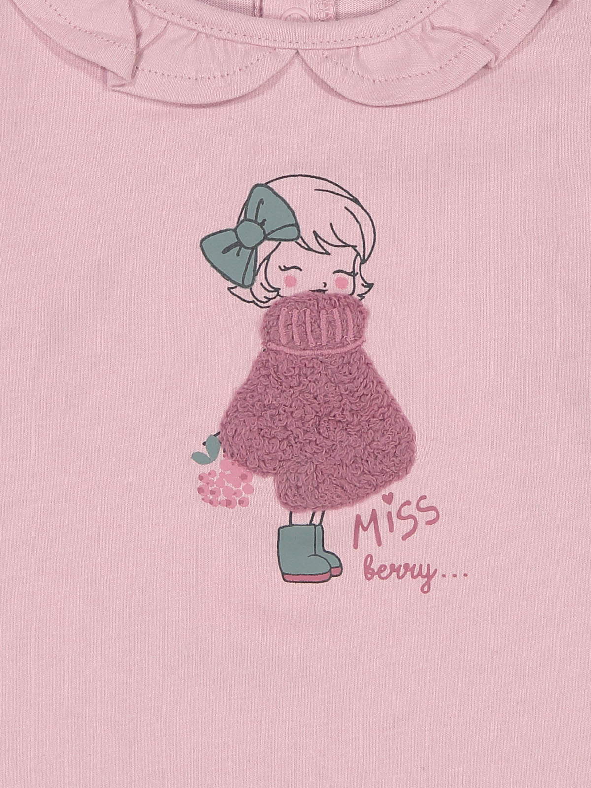 Tshirt in caldo cotone manica lunga con pratica apertura sul dietro grazie ai bottonicini a pressione. Colletto e fondo manica arricciato per ancora più femminilità. Tenera stampa bambina con vestitino in applicazione punto spugna. Una tshirt tanto graziosa quanto pratica.