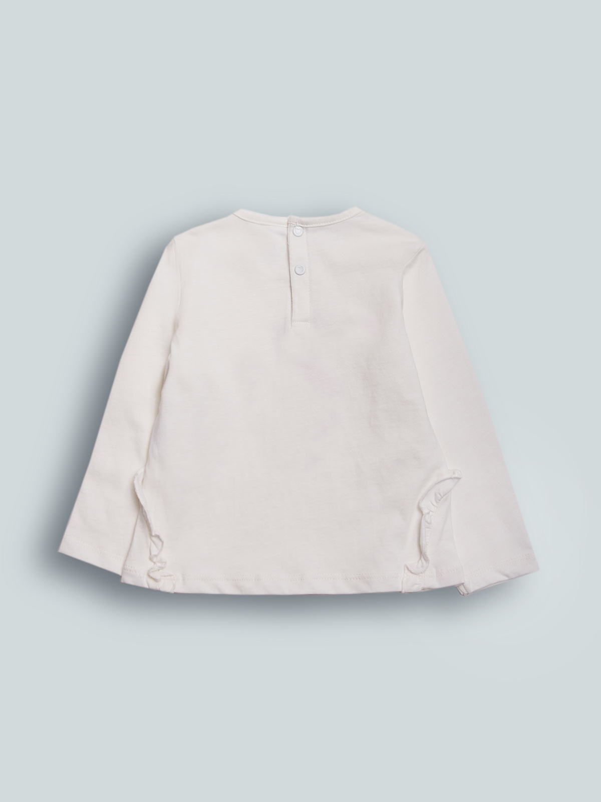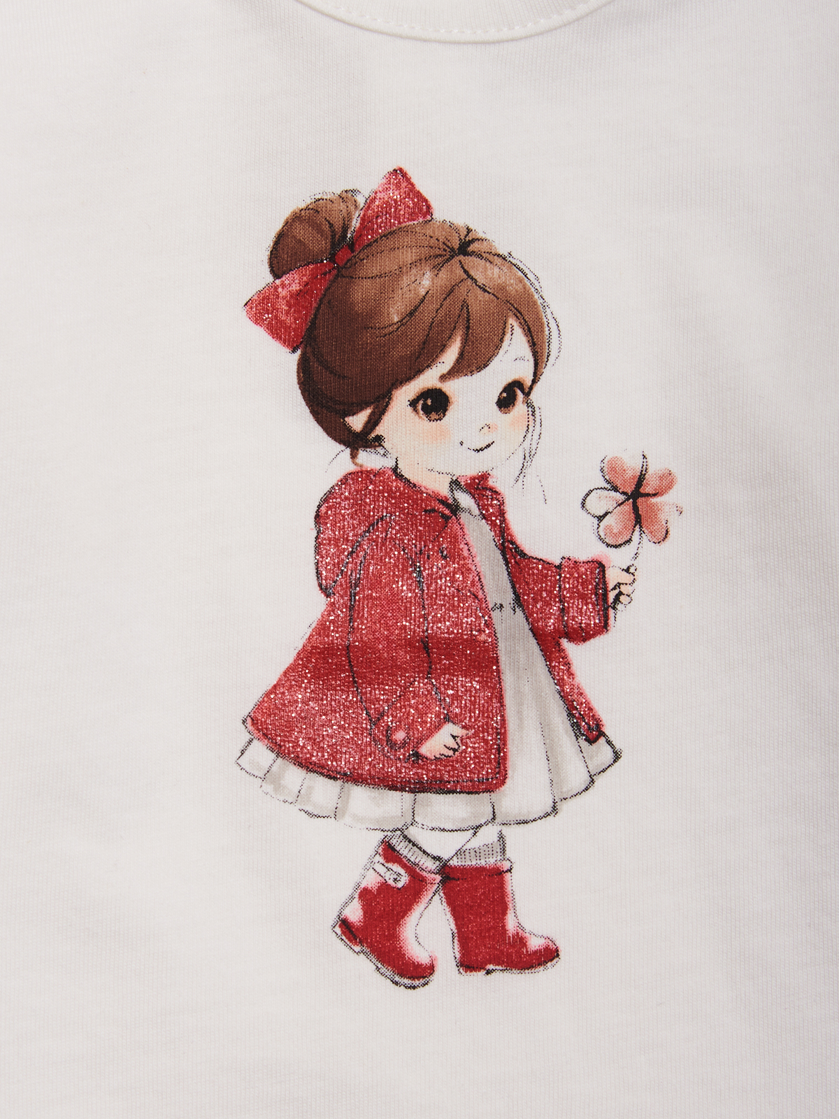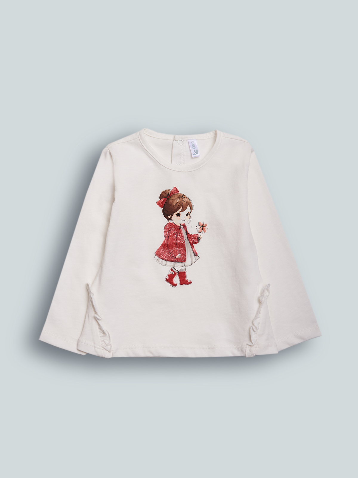 Tshirt in cotone Manica lunga con pratica apertura sul dietro grazie ai bottoncini a pressione. Tenera stampa bambina con glitter per arricchire il tutto. Una tshirt tanto graziosa quanto pratica.
