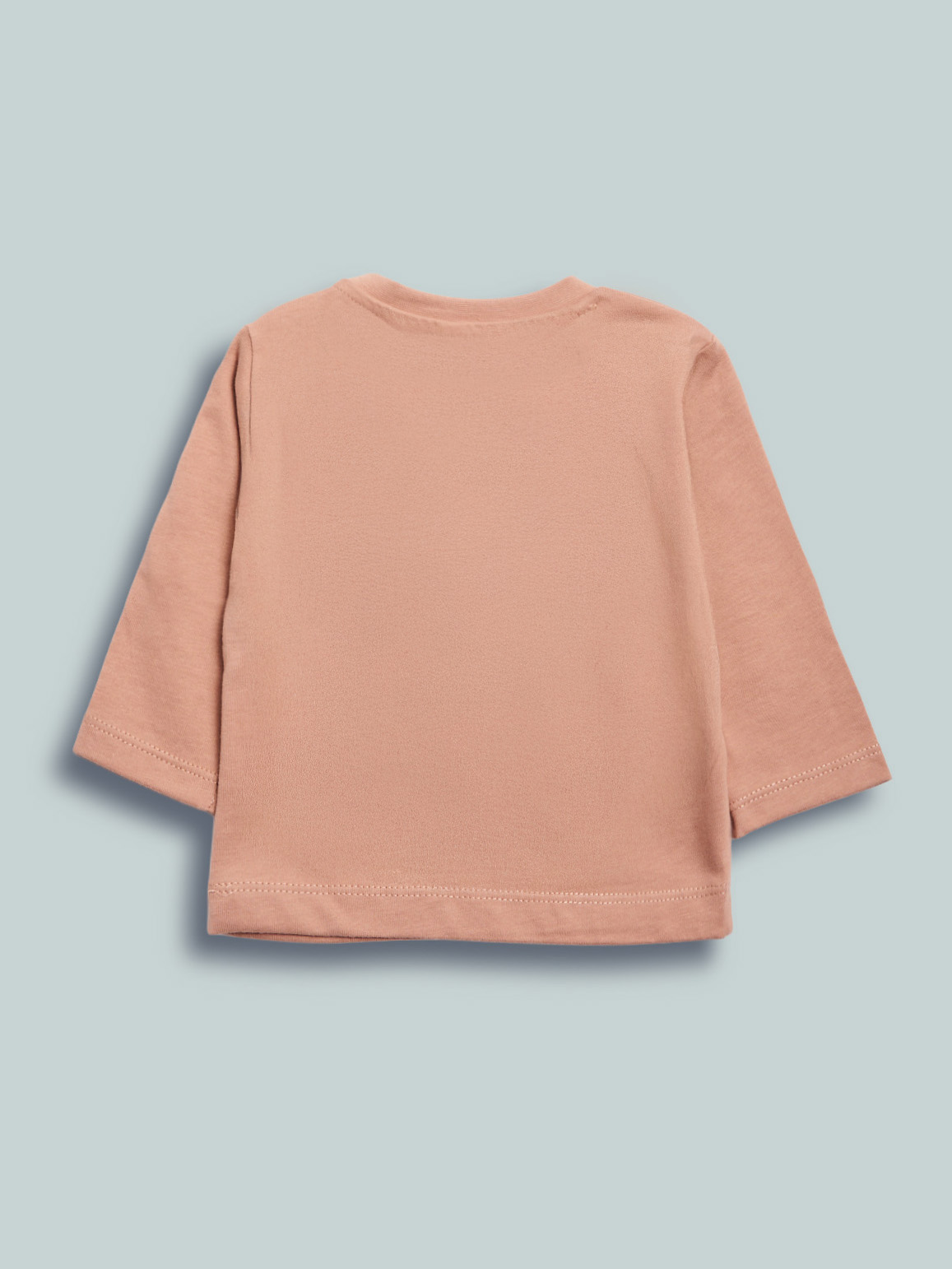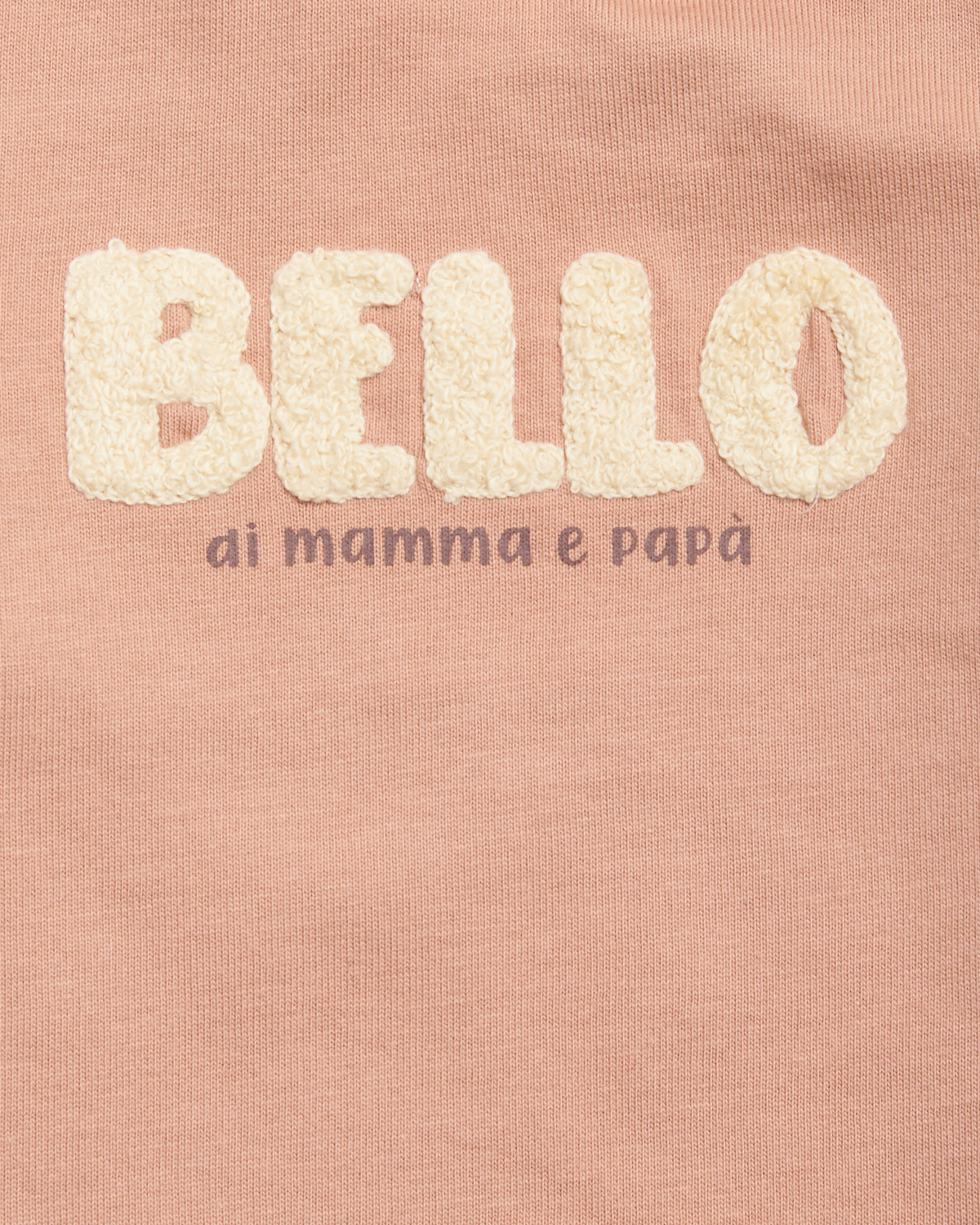 Tshirt manica lunga in cotone. Pratica apertura su spalla con bottoncini a pressione personalizzato. Stampa e ricamo punto spugna davanti. Divertente e facile da abbinare.