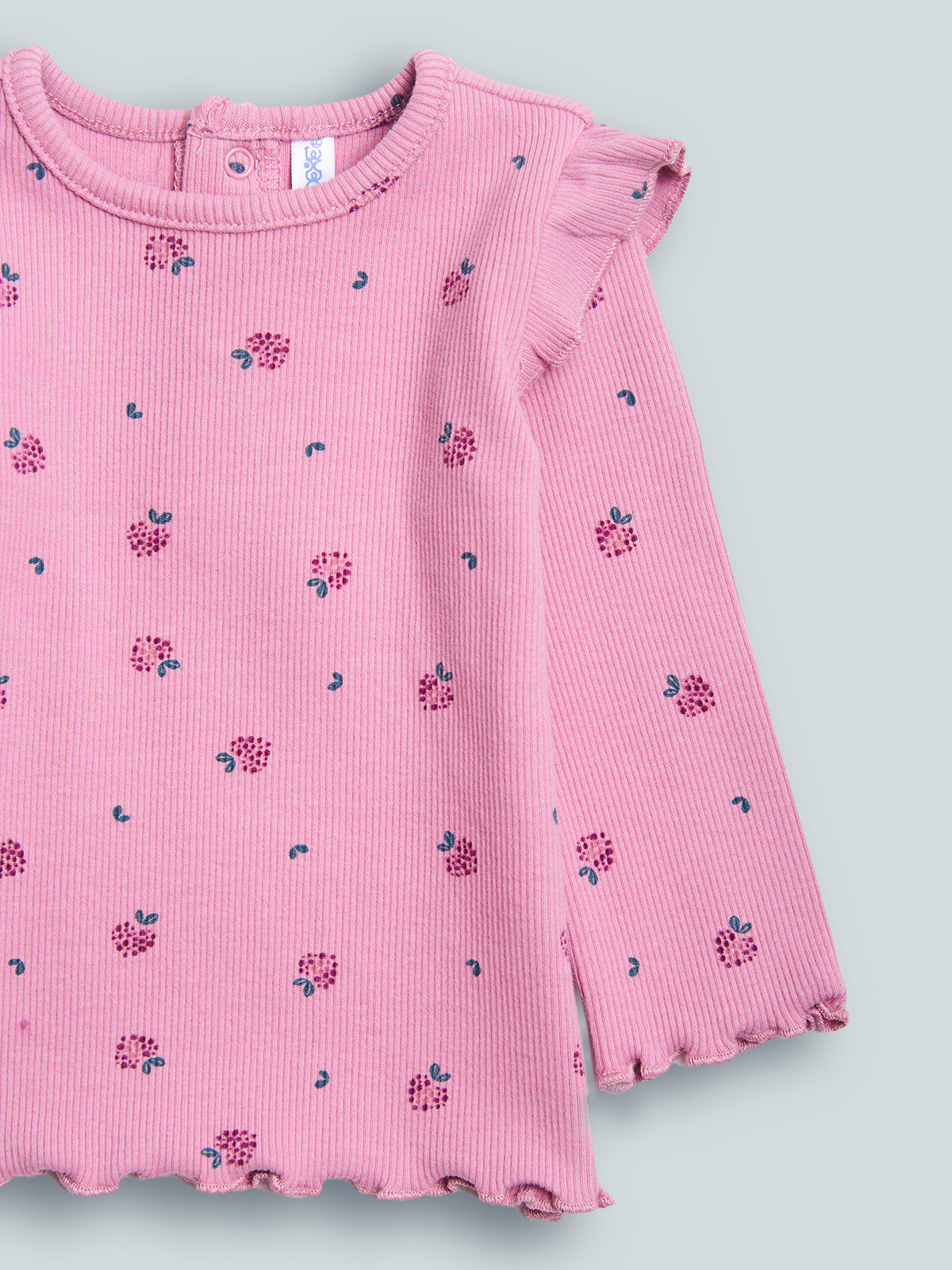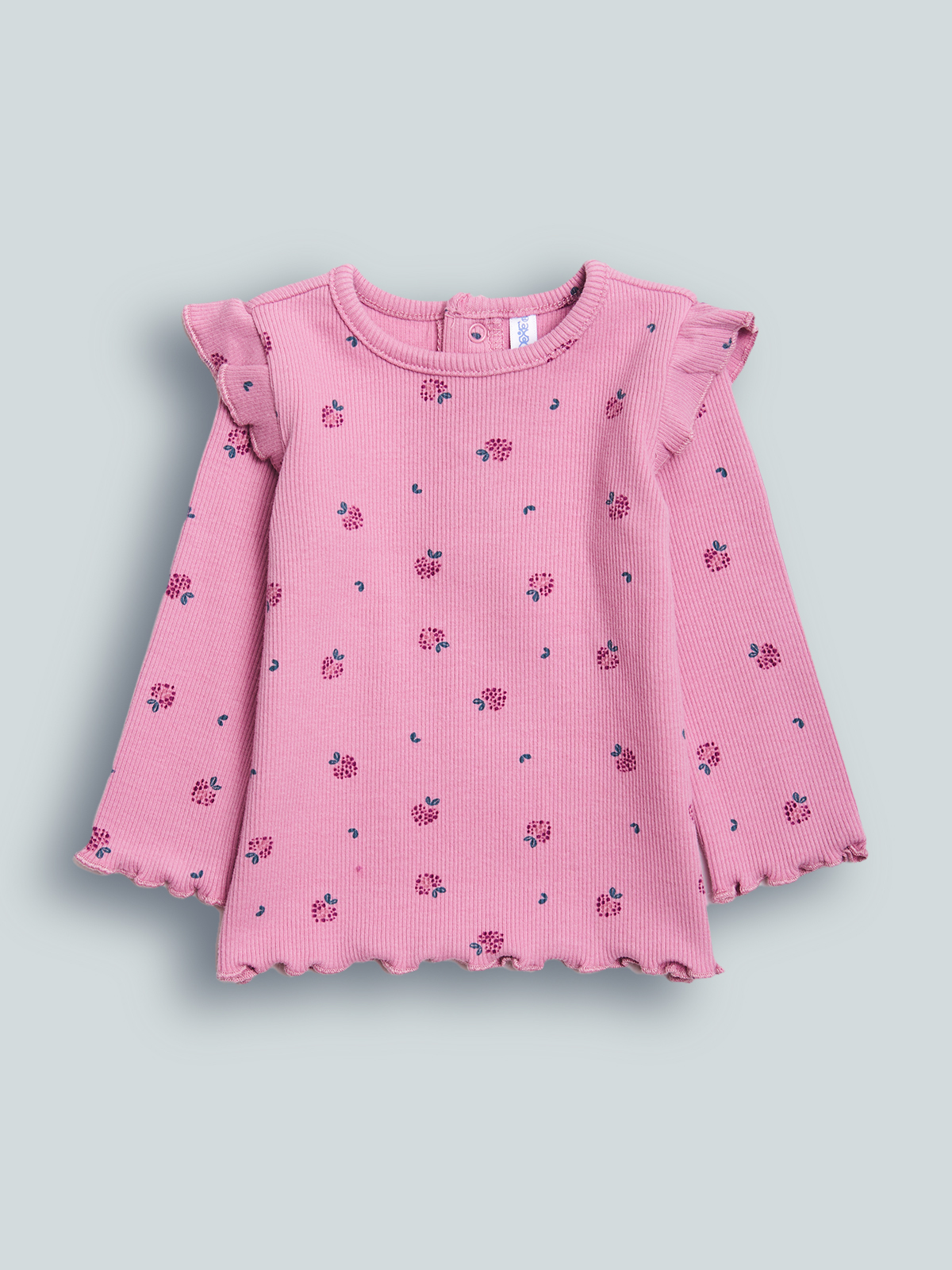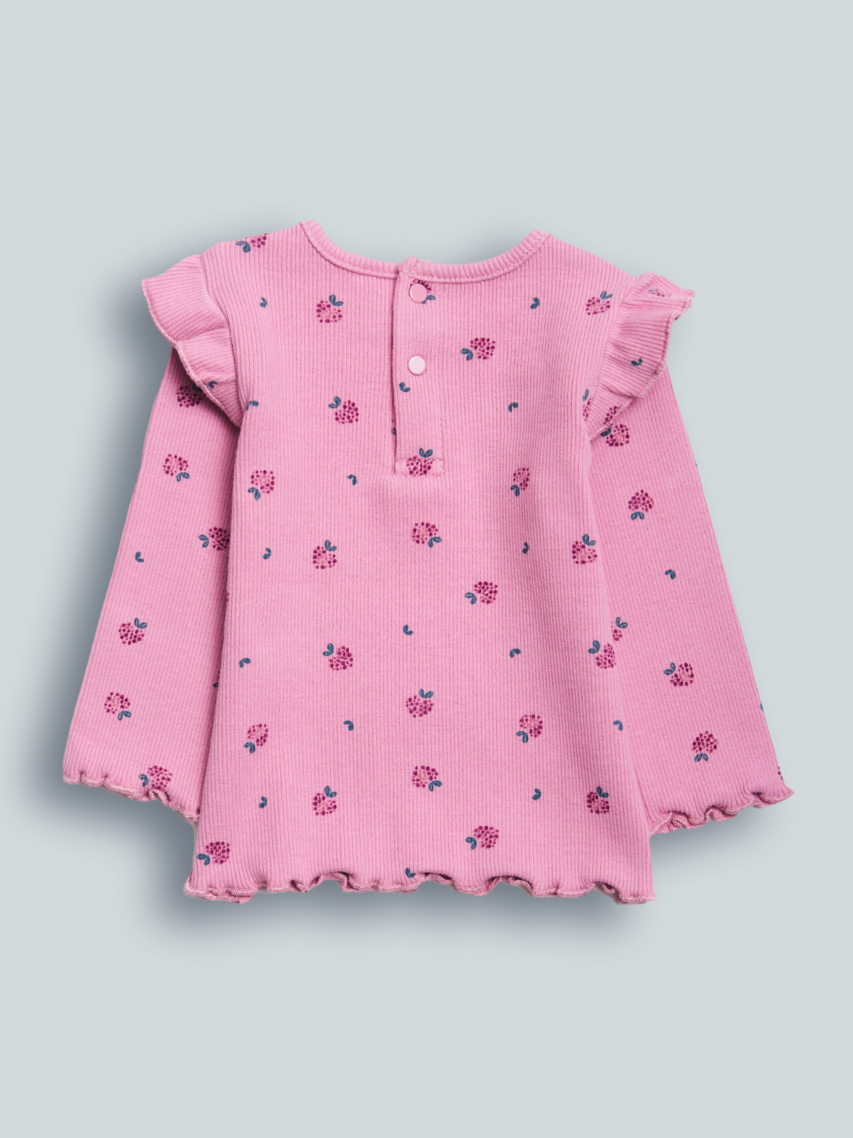 Tshirt manica lunga in morbida costina stampato fantasia. Apertura dietro con bottoncini a pressione. Un capo “chic” che non può mancare nell’armadio delle vostre neonate!