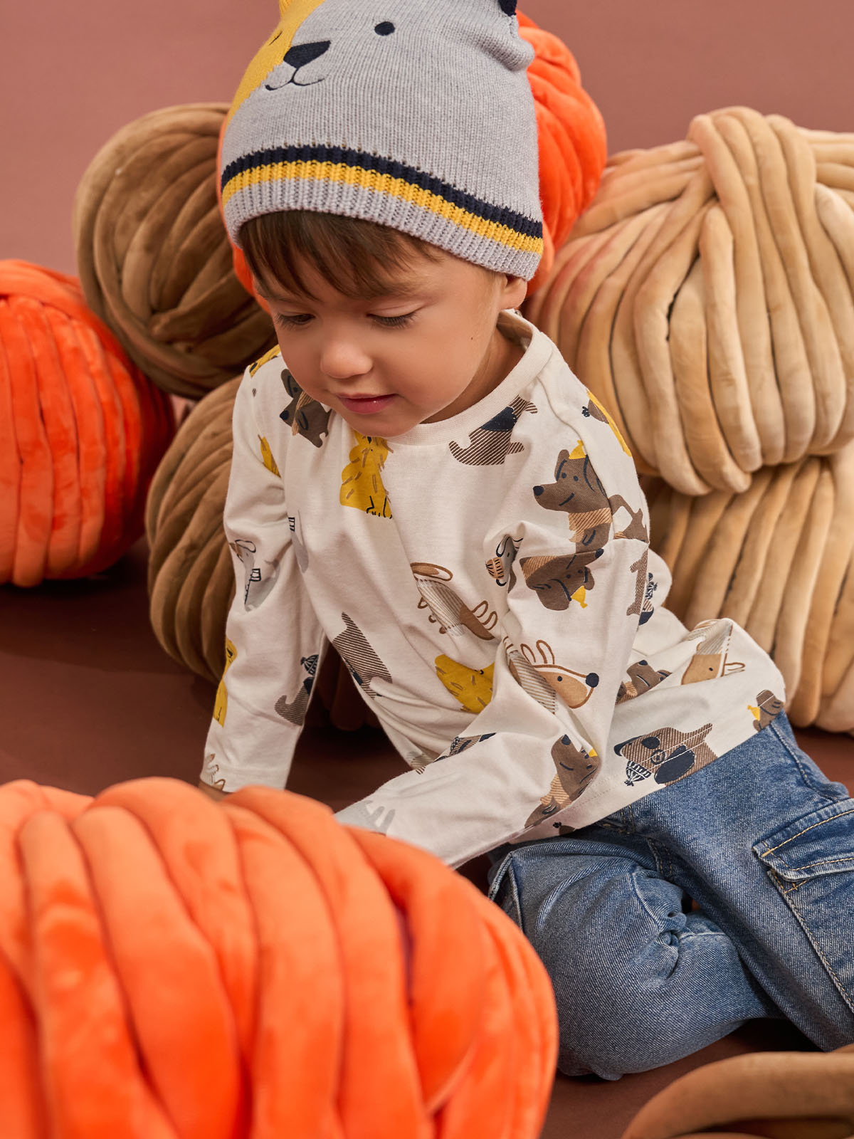 Tshirt manica lunga girocollo in caldo cotone fantasia, pratica apertura con bottoncini a pressione sul retro. Una tshirt allegra in una fantasia che piacerà molto al vostro bambino.