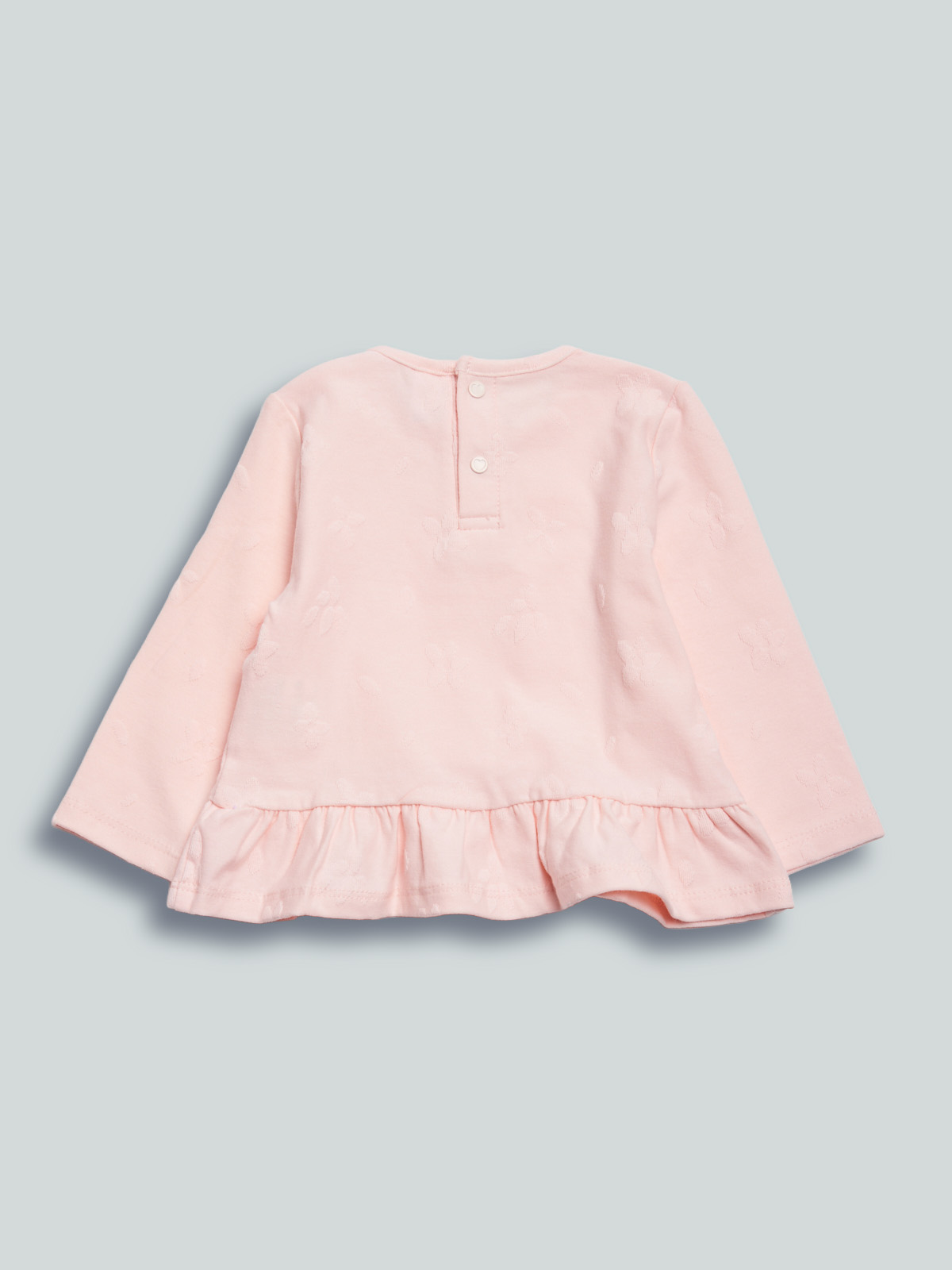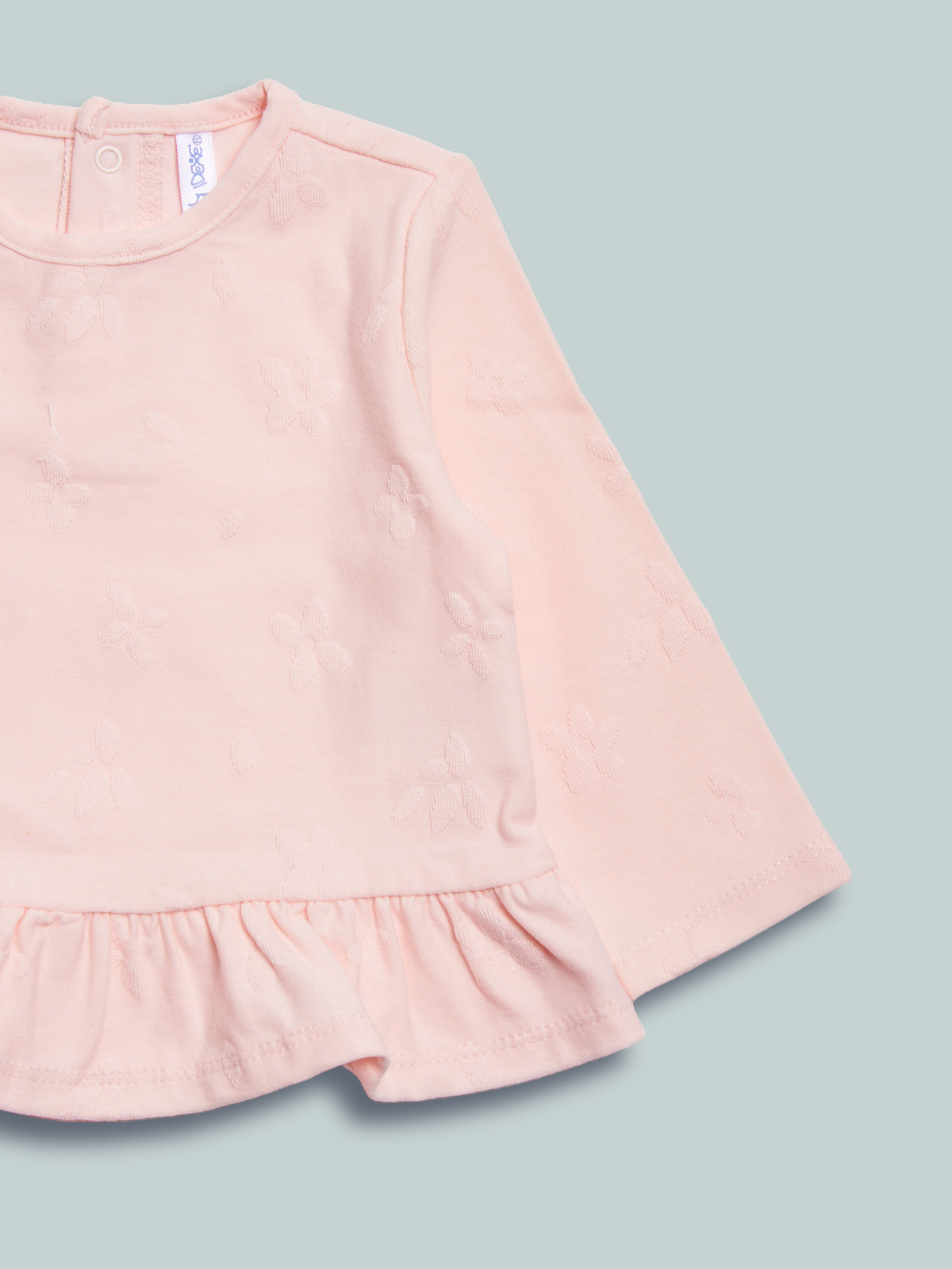 Tshirt jersey devorè floreale, pratica apertura dietro con bottoncini a pressione. Il fondo è rifinito da una balza per essere sempre alla moda. Un capo “chic” che non può mancare nell’armadio della vostra piccola.