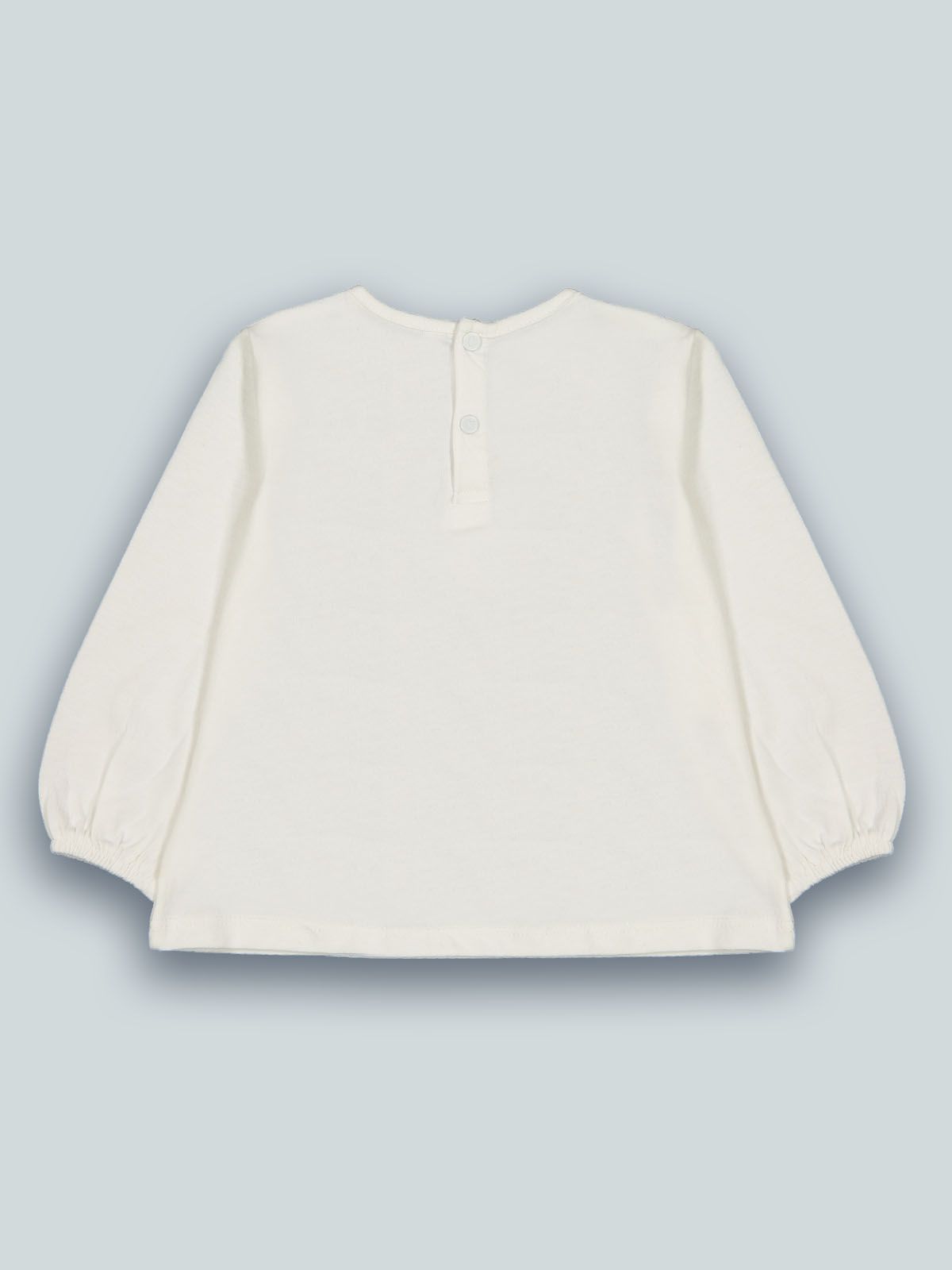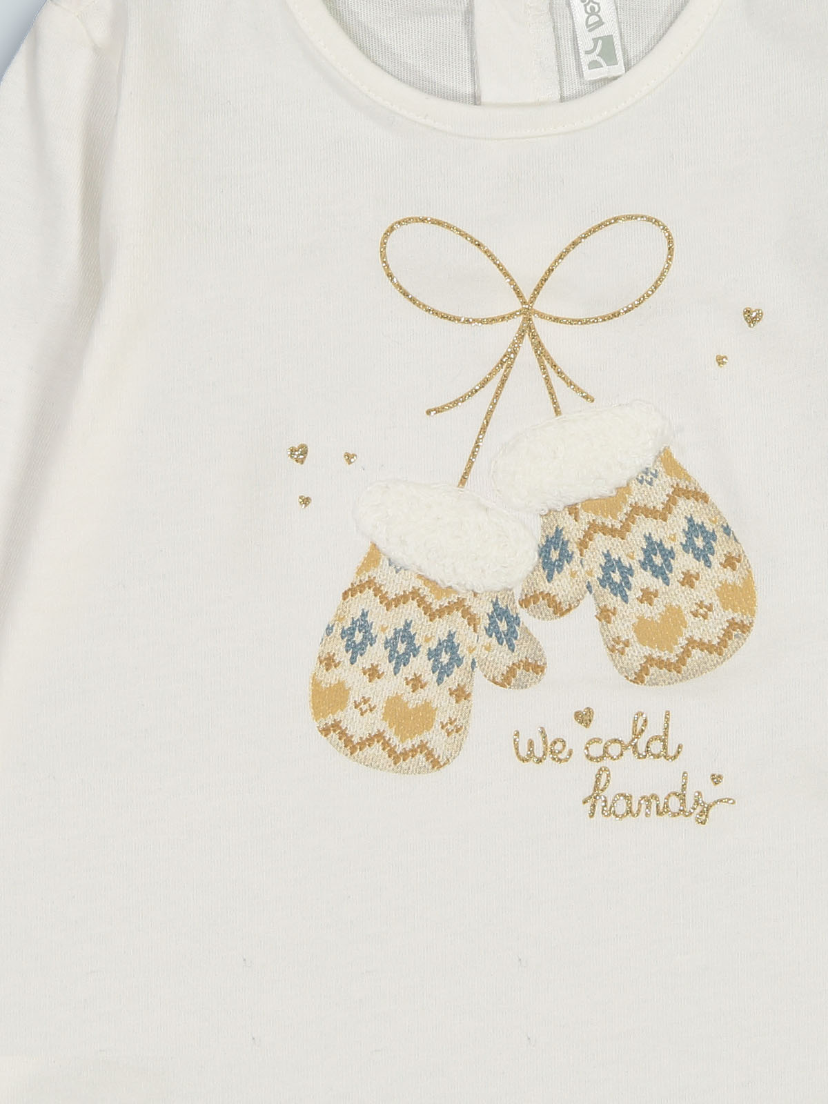 Tshirt in caldo cotone con pratica apertura sul dietro grazie ai bottoncini a pressione. Simpatiche moffole a stampa con applicazione a ricamo effetto puntio spugna. Rouches su spalla per maggiore femminilità. Un capo con dettagli chic e di facile abbinamento.