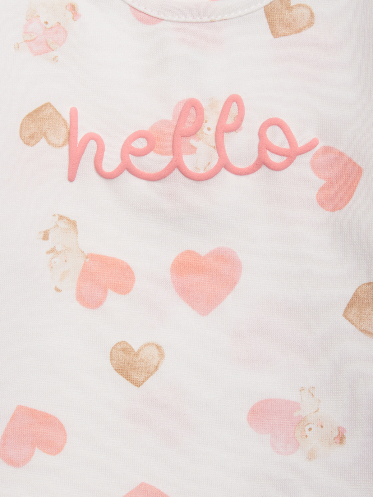 Tshirt girocollo a Manica lunga in cotone stampato. Davanti arricchito da simpatica grafica, pratica apertura sul dietro con bottoncini a pressione. Per iniziare la giornata all’insegna dell’allegria.