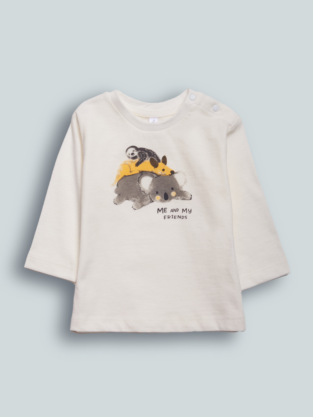 Tshirt girocollo a Manica lunga in cotone. Pratica apertura con bottoncini a pressione su spalla, simpatica stampa sul davanti. Divertente e facile da abbinare.