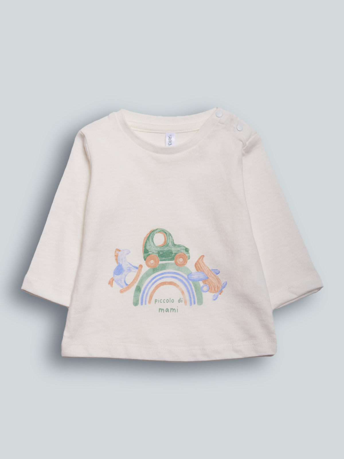 Tshirt girocollo a Manica lunga in cotone. Pratica apertura con bottoncini a pressione su spalla, colorata stampa sul davanti. Divertente e facile da abbinare.