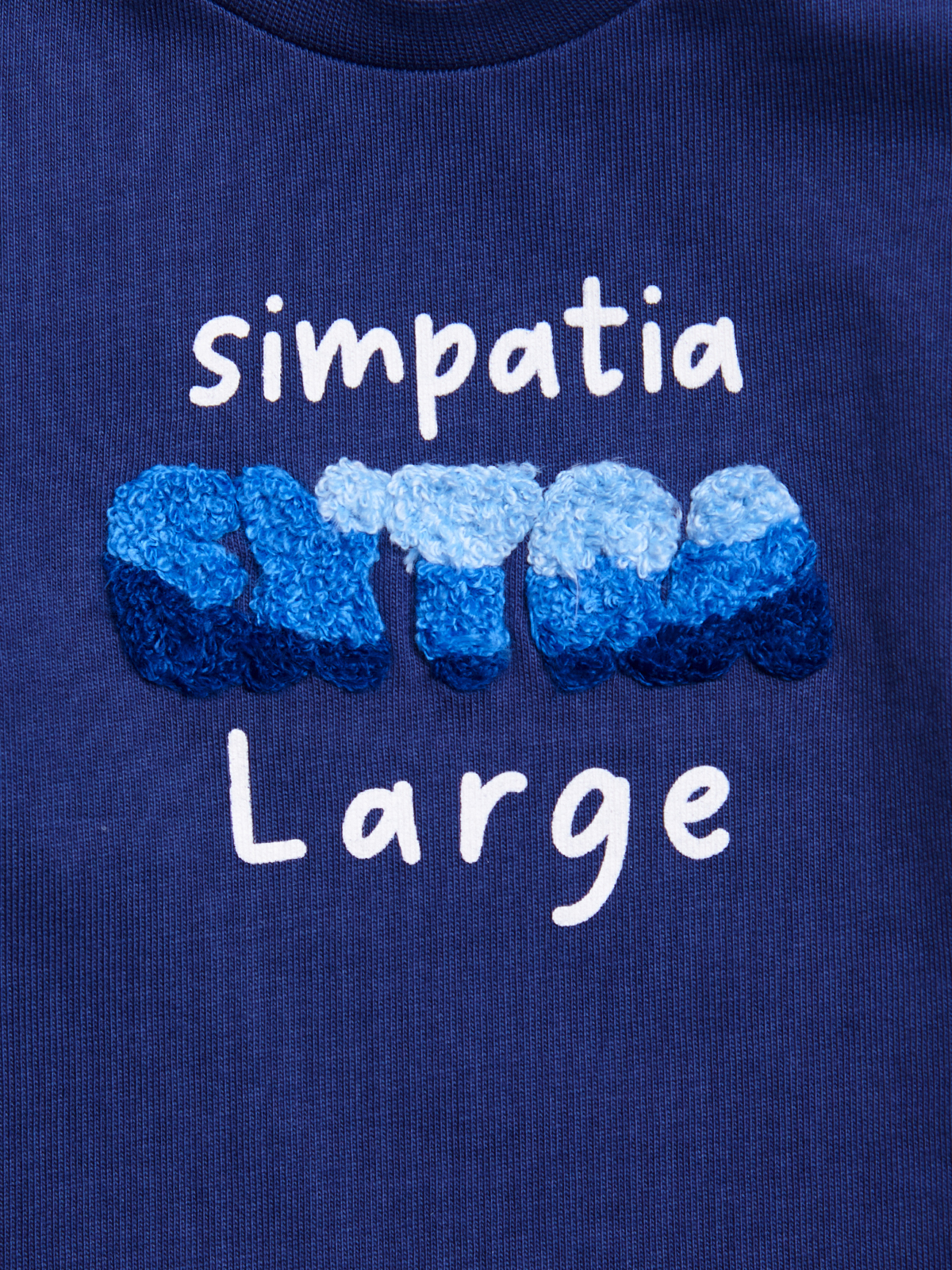 Tshirt girocollo a Manica lunga in cotone. Pratica apertura con bottoncini a pressione su spalla, spiritosa stampa humor con ricamo effetto spugna. Casual e originale, perfetta con un paio di jeans.