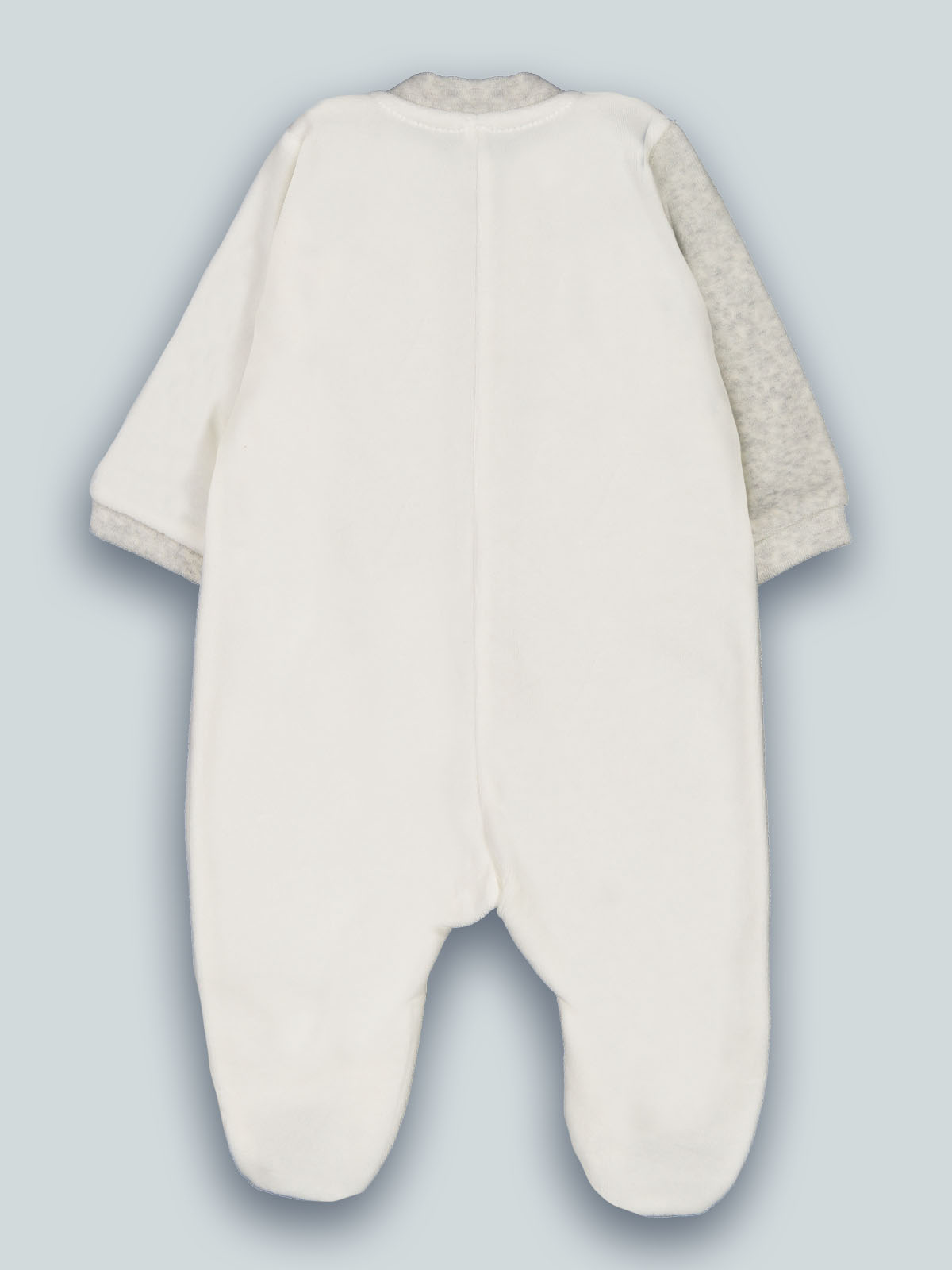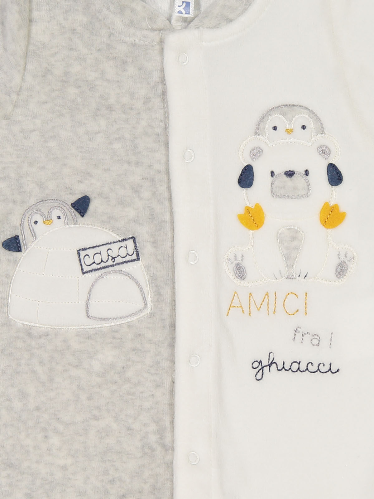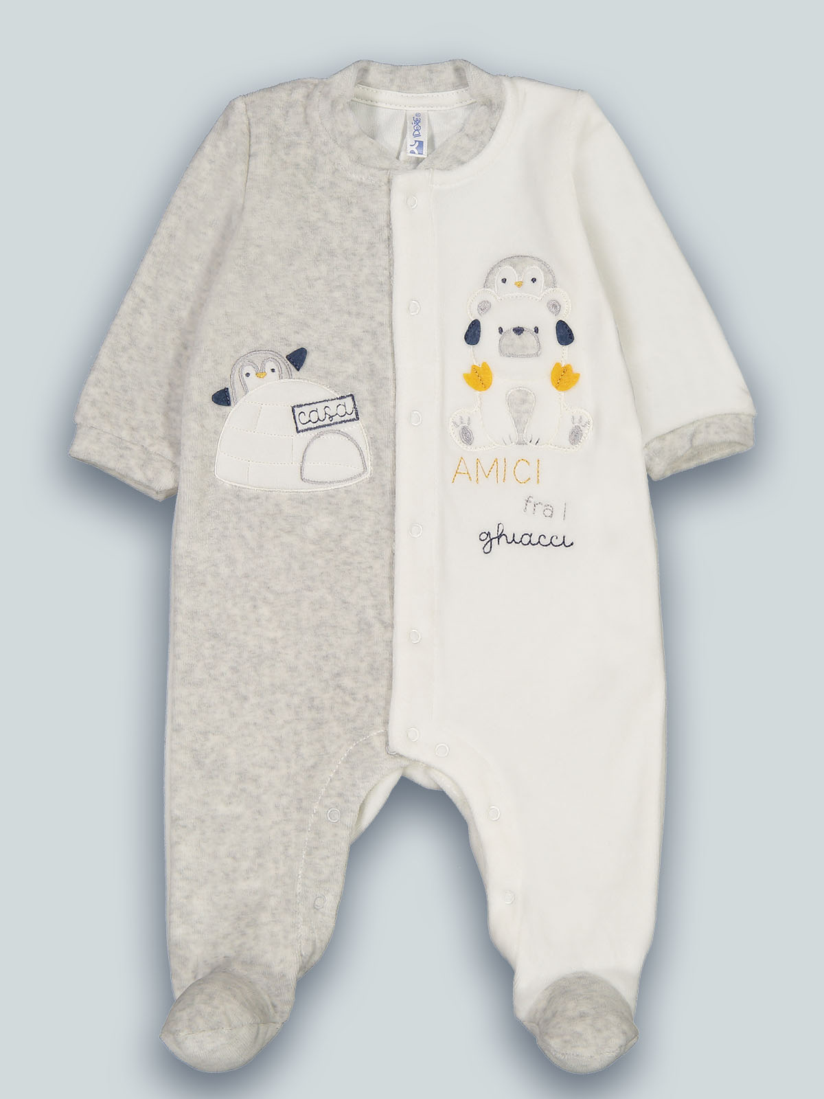 Tutina in morbida ciniglia bicolore, apertura davanti ed entrogamba con bottoni a pressione. Grafiche ricamate. Questo articolo fa parte del corredino composto da tutti gli articoli indispensabili per il tuo neonato.