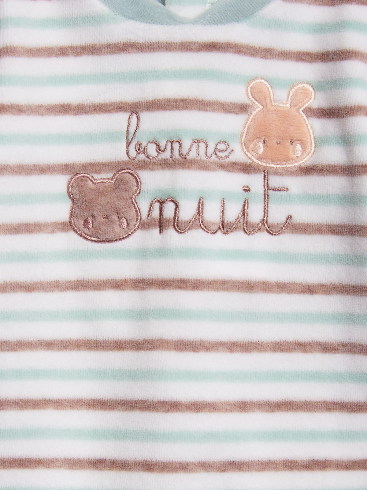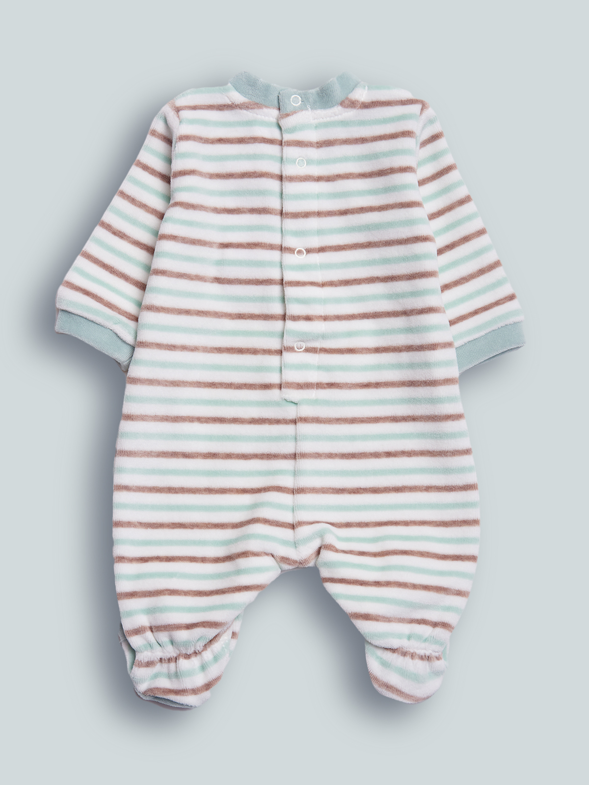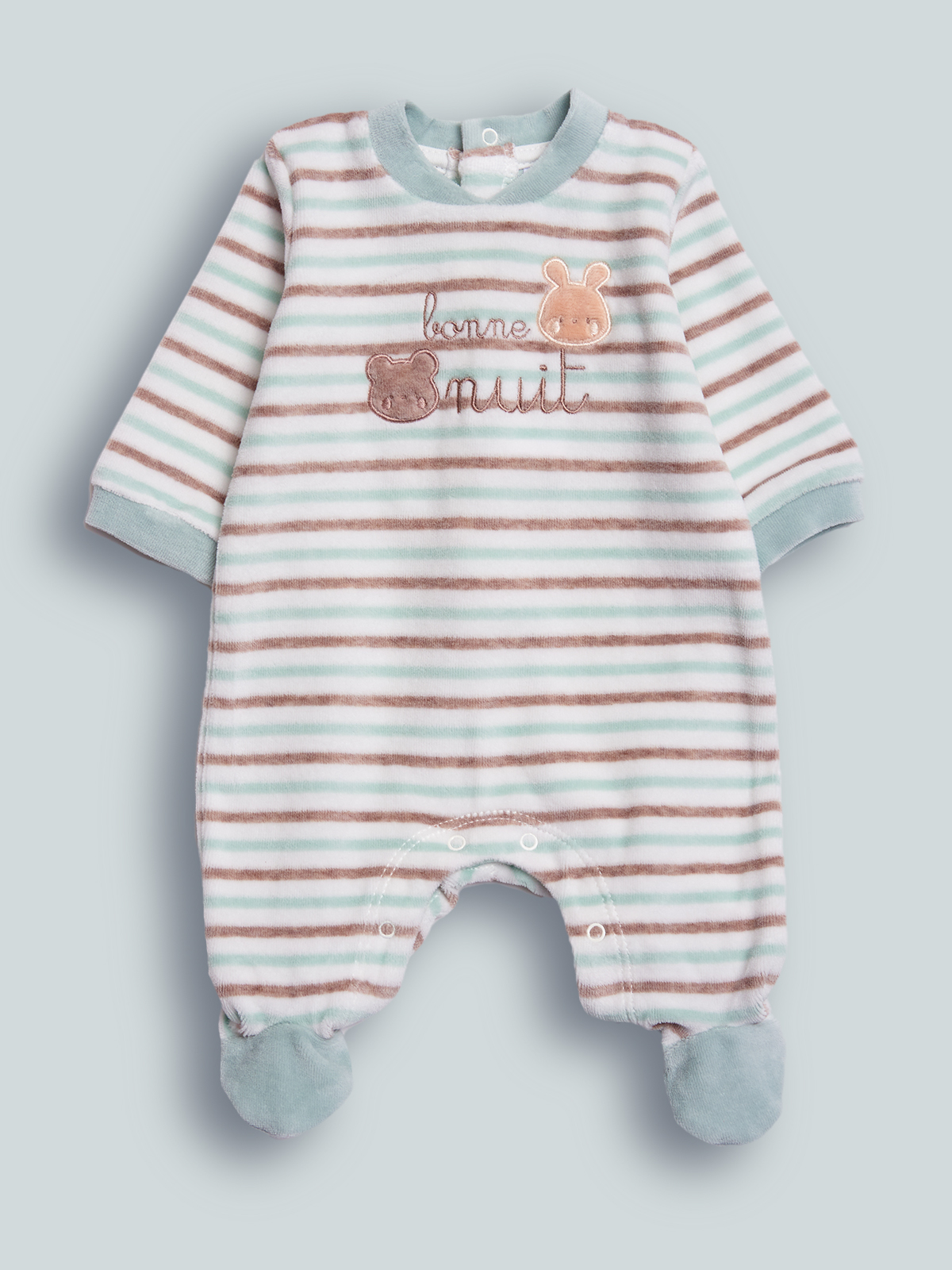 Pigiama in Morbida ciniglia rigato tinto filo per tenere al caldo il nostro neonato. Girocollo serafino. Chiusura con bottoni a pressione per agevolarne l’indosso. Elemento decorativo: delizioso ricamo. Questo pigiamino fa parte del corredino composto da tutti gli articoli indispensabili per il tuo neonato.