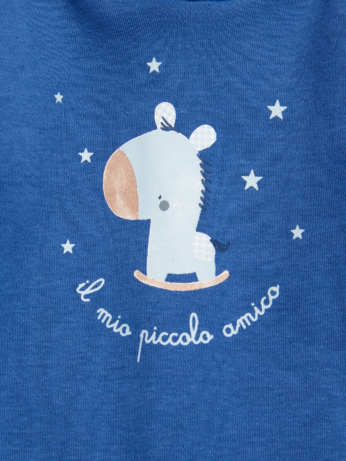 Pigiama in caldo cotone, Manica lunga con piedino, apertura dietro ed entrogamba con bottoni a pressione per agevolarne l’indosso. Elemento decorativo: stampa davanti. Ideale per la nanna. Questo pigiamino fa parte del corredino composto da tutti gli articoli indispensabili per il tuo neonato.