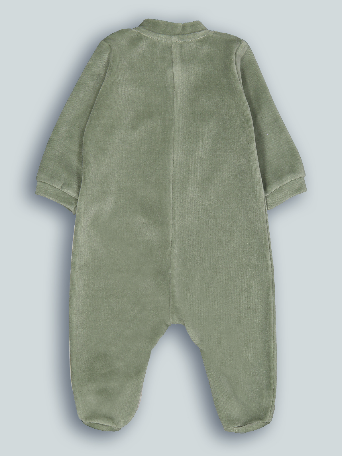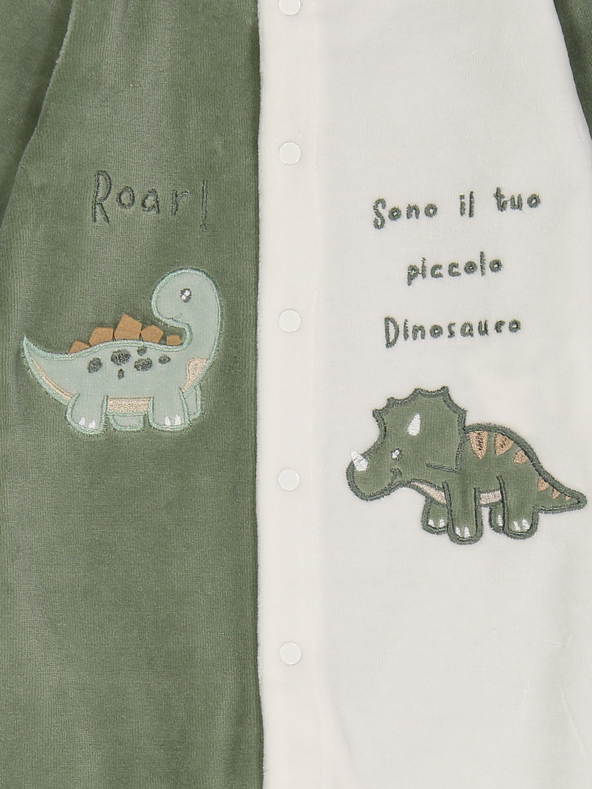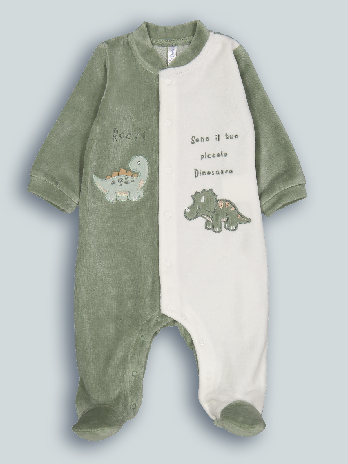 Tutina in morbida ciniglia bicolore, apertura davanti ed entrogamba con bottoni a pressione. Simpatici dinosauri ricamati. Questo articolo fa parte del corredino composto da tutti gli articoli indispensabili per il tuo neonato.