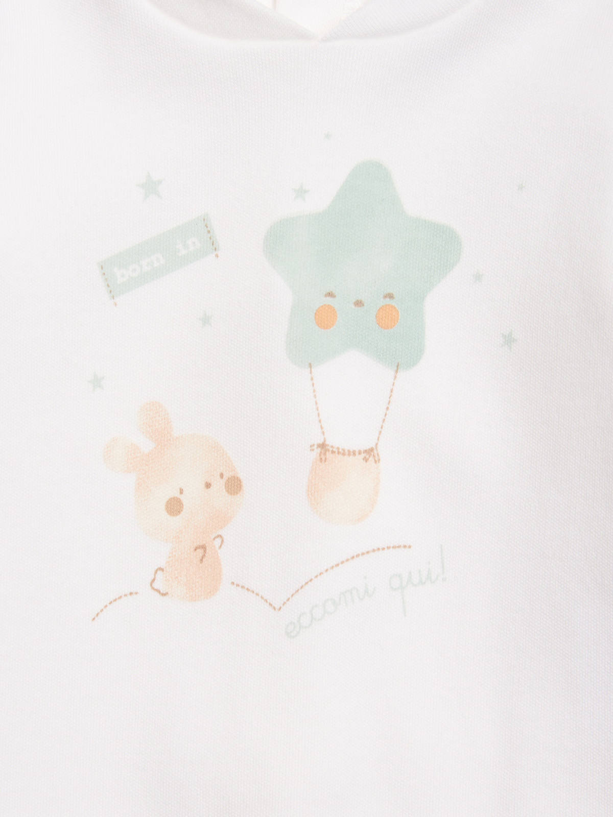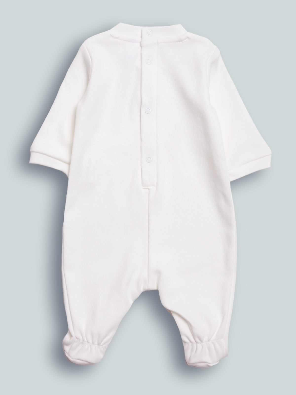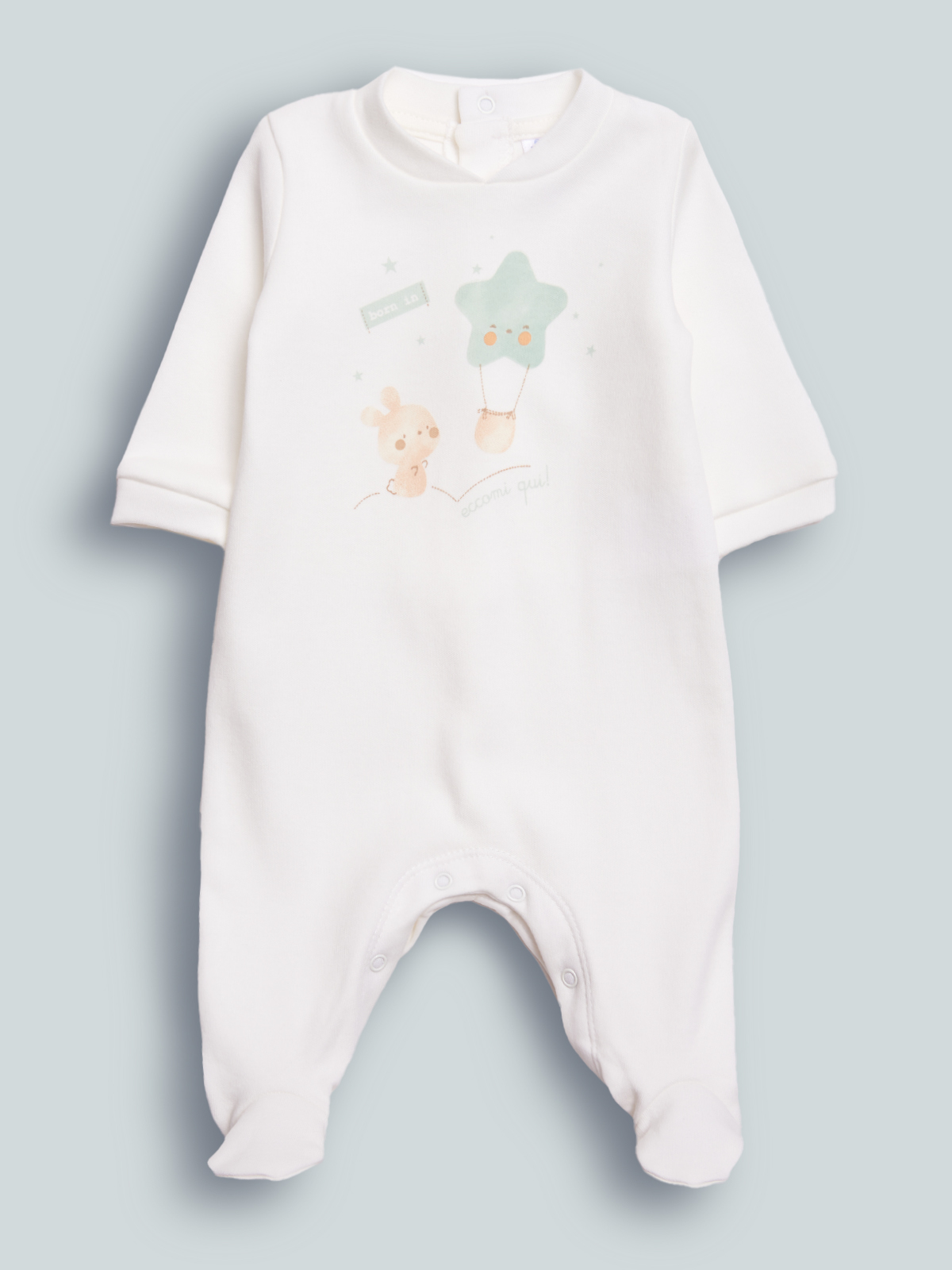 Pigiama in caldo cotone, Manica lunga con piedino, apertura dietro ed entrogamba con bottoni a pressione per agevolarne l’indosso. Elemento decorativo: stampa davanti. Ideale per la nanna. Questo pigiamino fa parte del corredino composto da tutti gli articoli indispensabili per il tuo neonato.