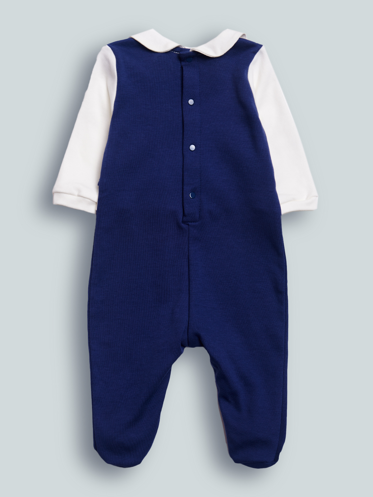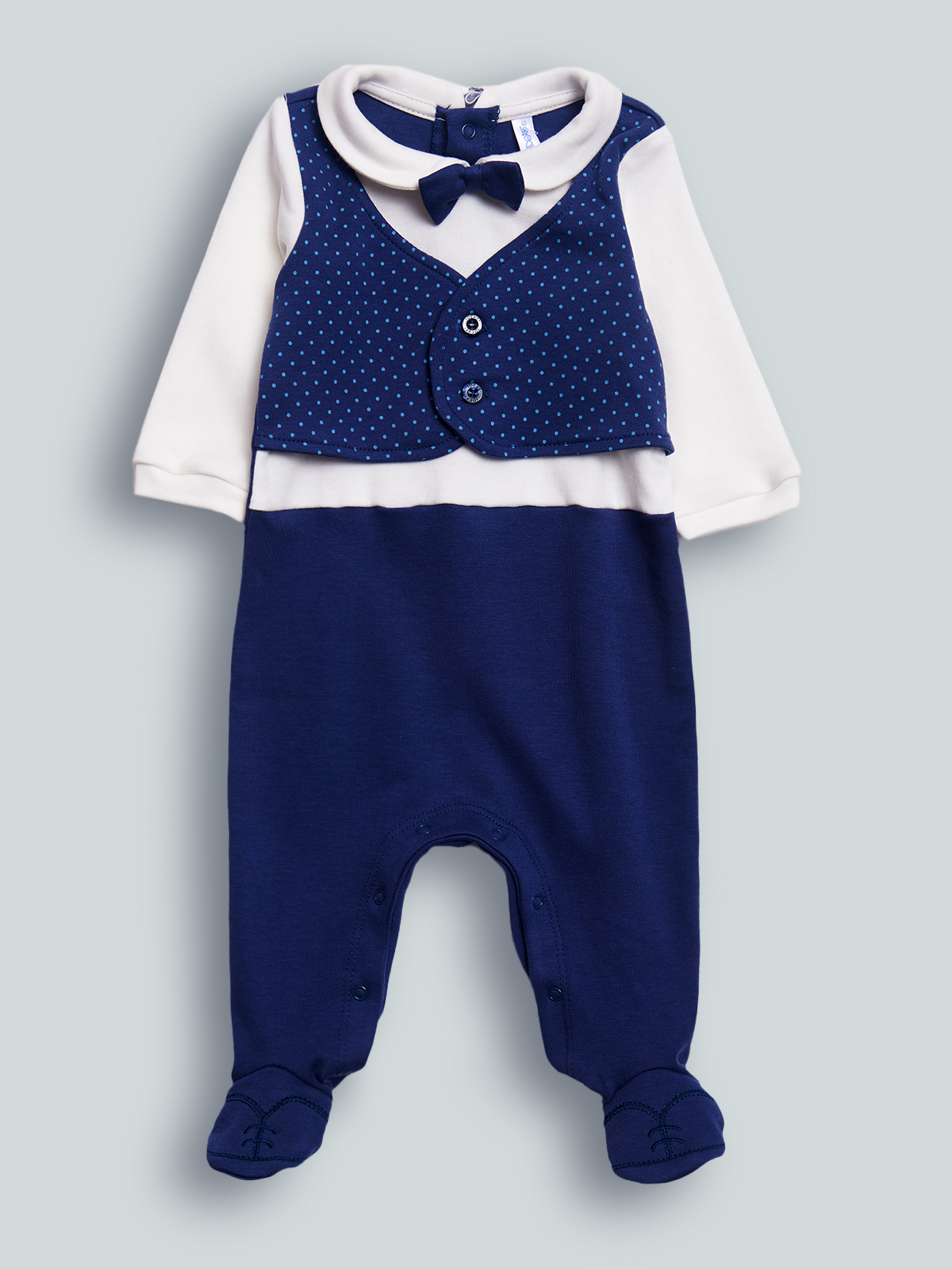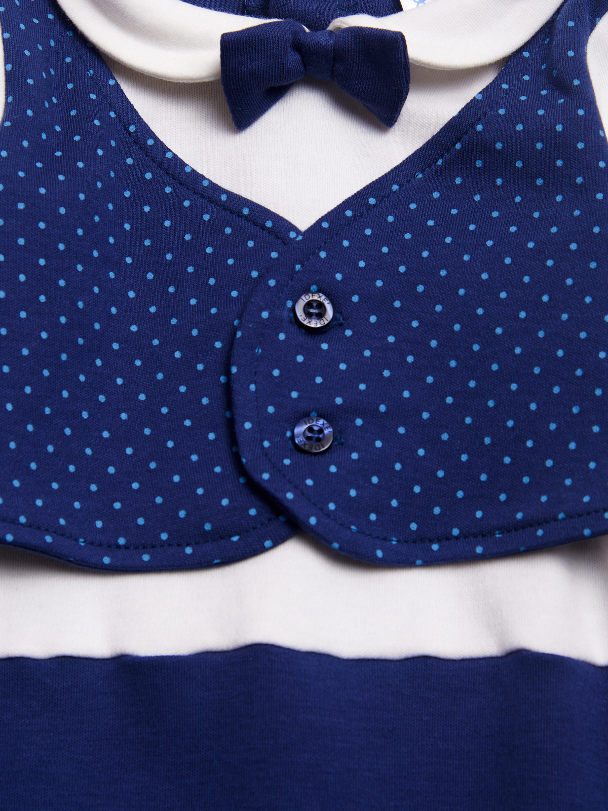 Tutina in caldo cotone bicolore, il capo è reso elagante dal finto gilet stampato, collo a camicia e papillon removibile. Apertura dietro ed entrogamba con bottoni a pressione. Ideale per le grandi occasioni.